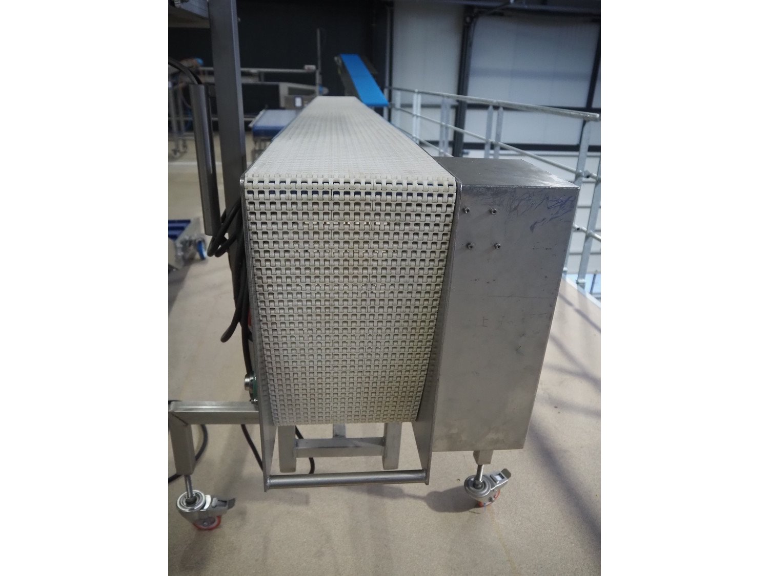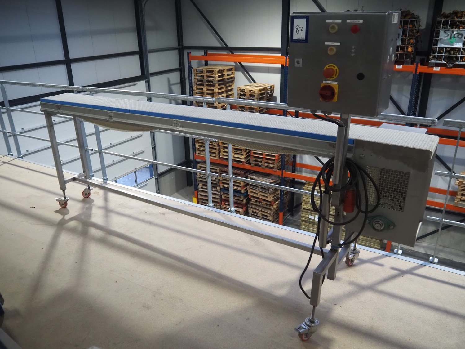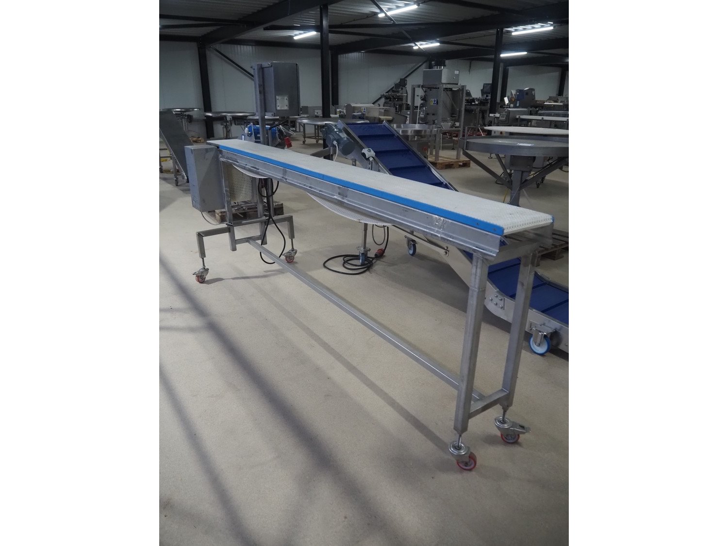 Mobile transport belt, s/s frame, plastic mesh belt, belt width: 255 mm, total dimensions: 3050 mm x 800 mm x 1600 mm.