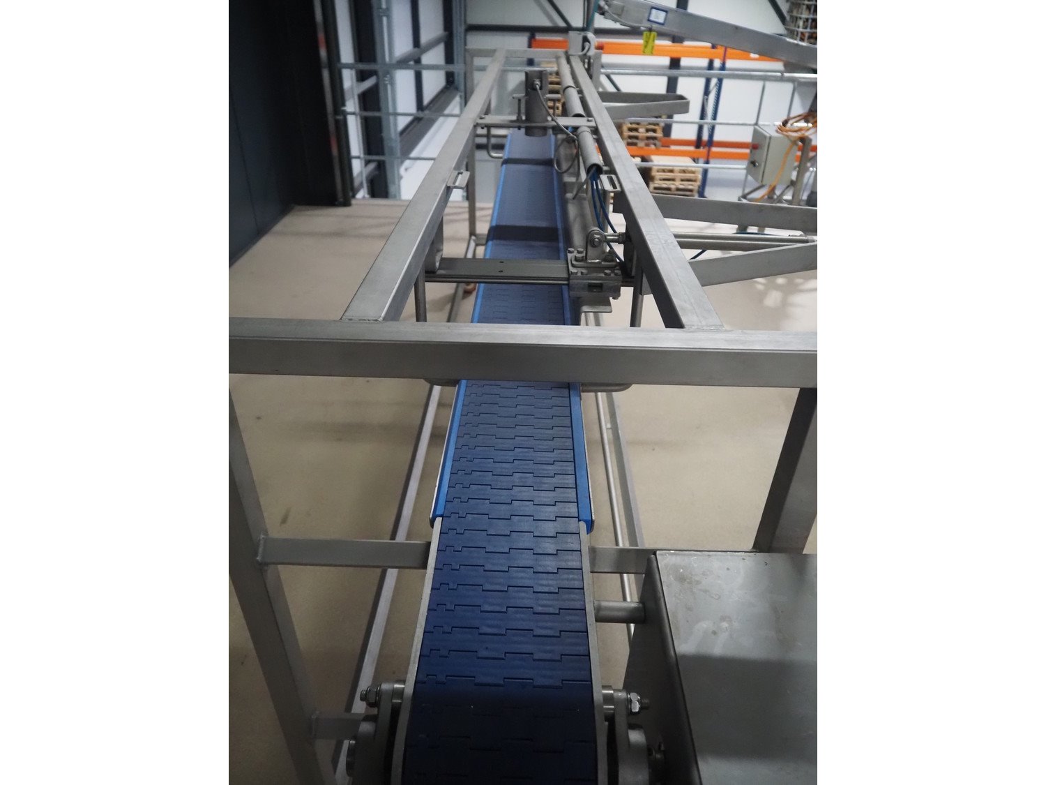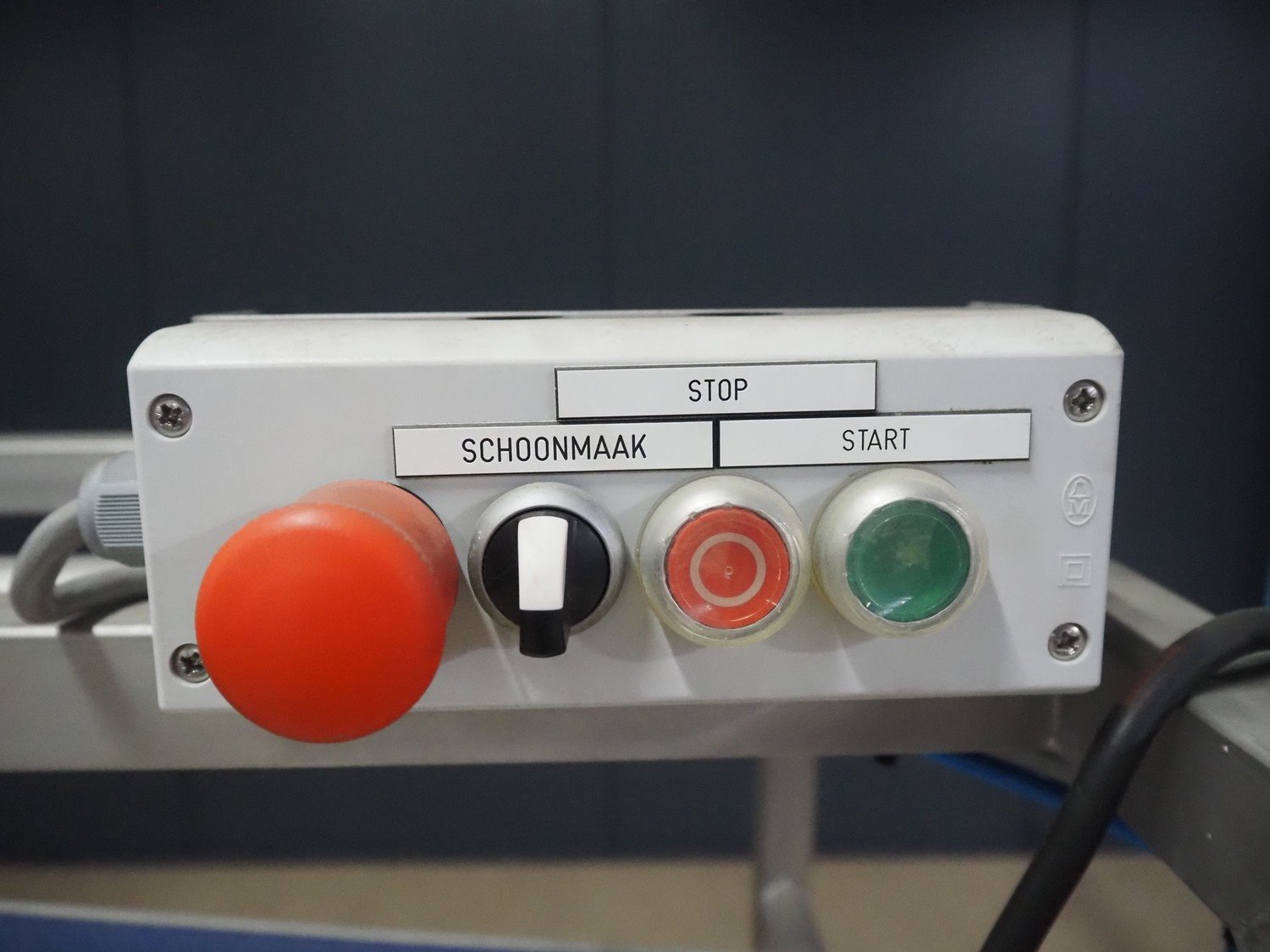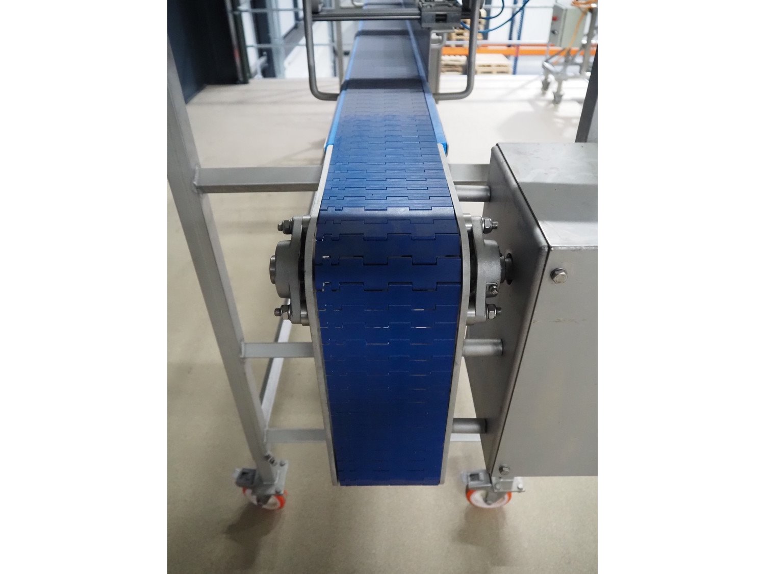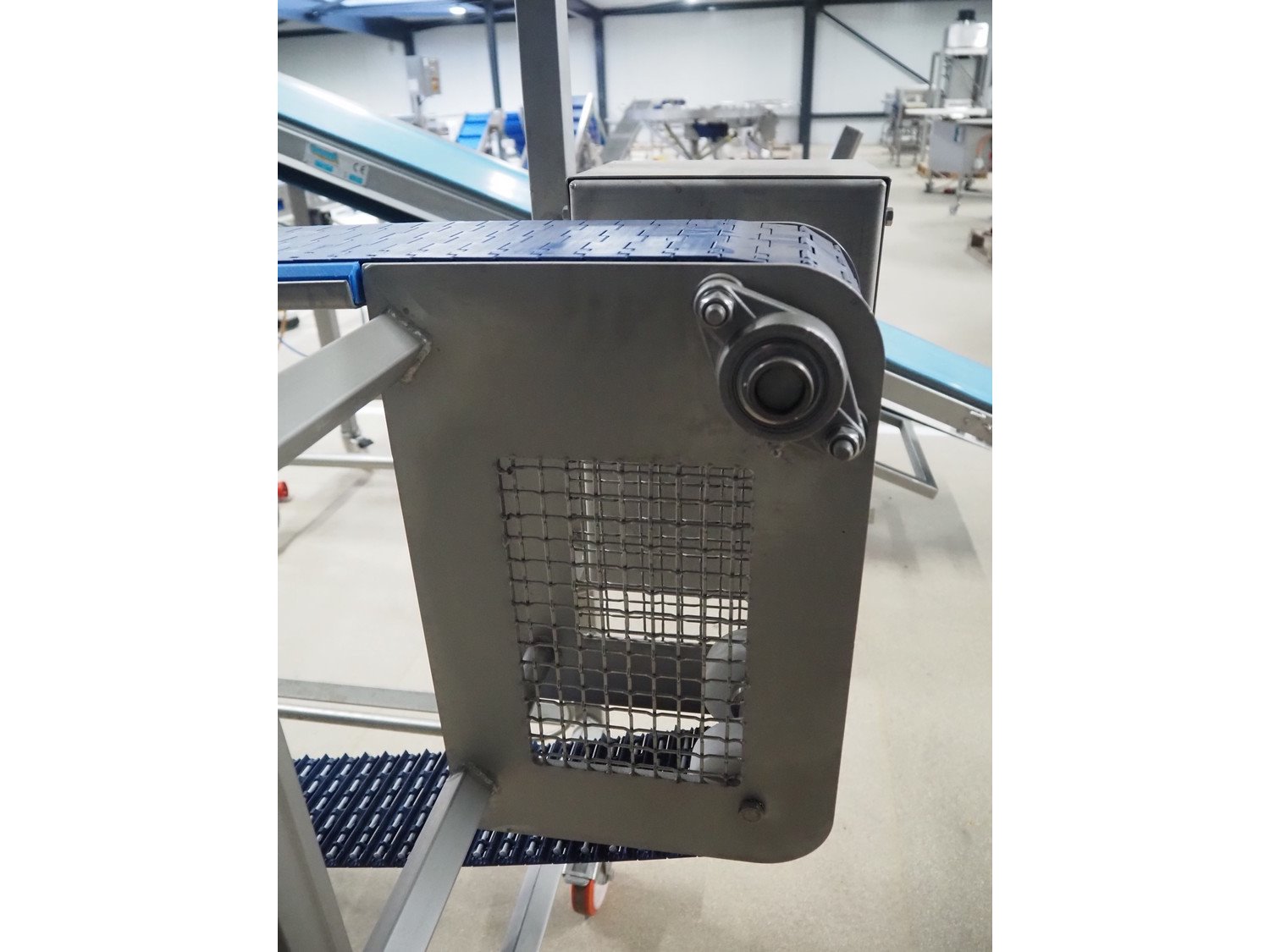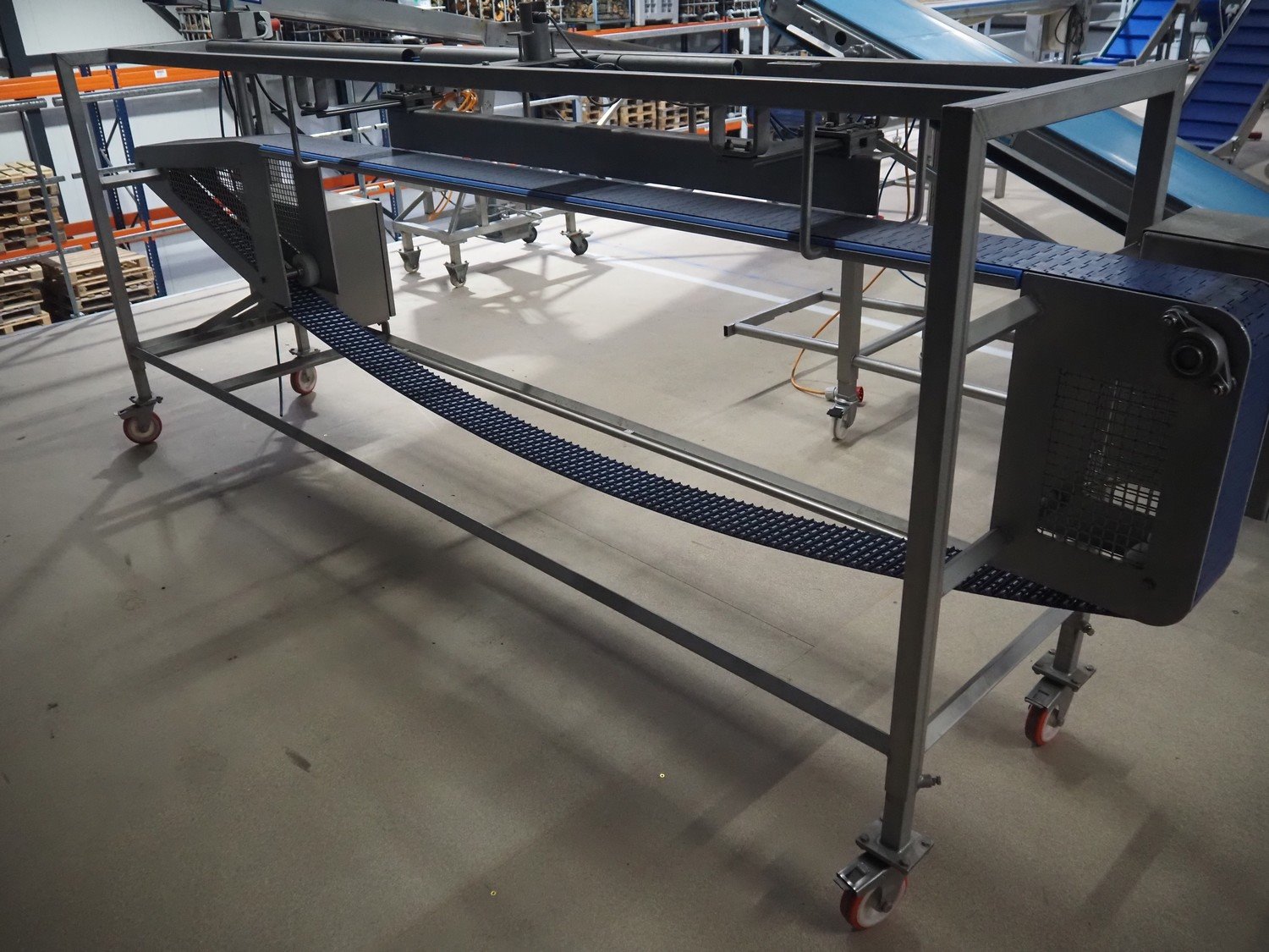 Lensink mobile transport belt with rejector, s/s frame, plastic belt, belt width: 153 mm, total dimensions: 3400 mm x 850 mm x 2000 mm.