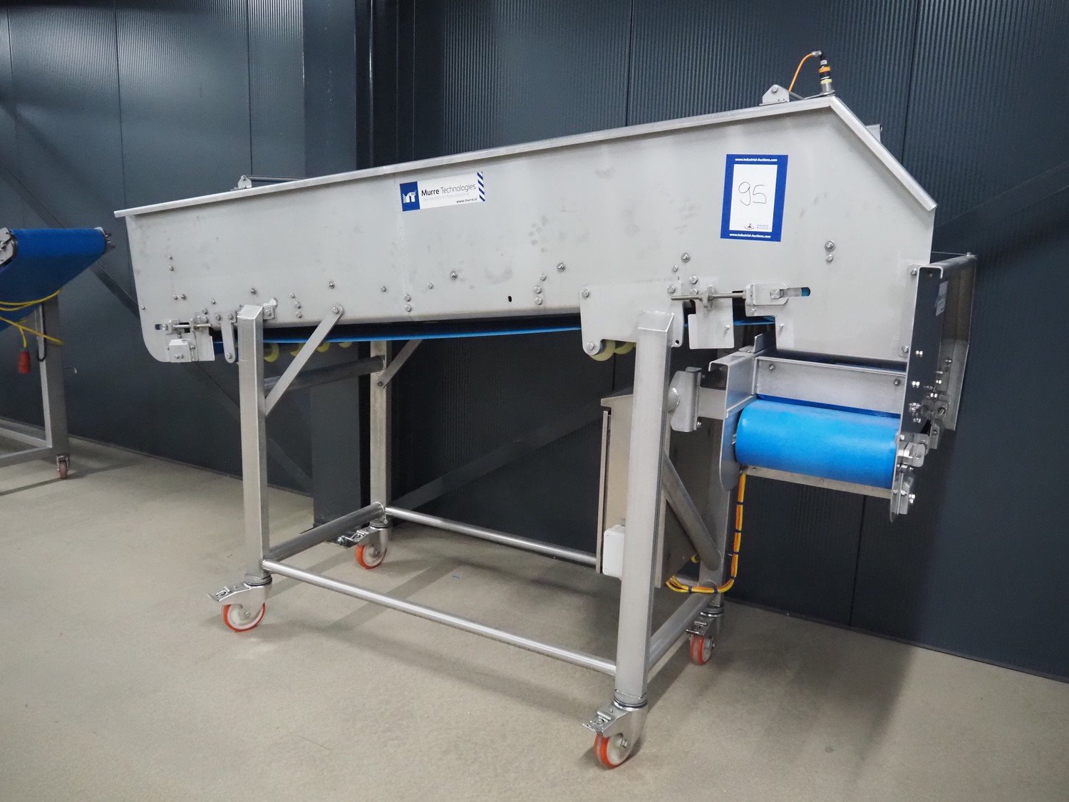 Murre Techniek b.v. mobile elevating belt, model: 162140757, year of construction: 2016, machine weight: 390 kg, plastic belt, belt width: (1x) 590 mm, (1x) 340 mm, elevating height: 1400 mm, total dimensions: 2700 mm x 1230 mm x 1900 mm.