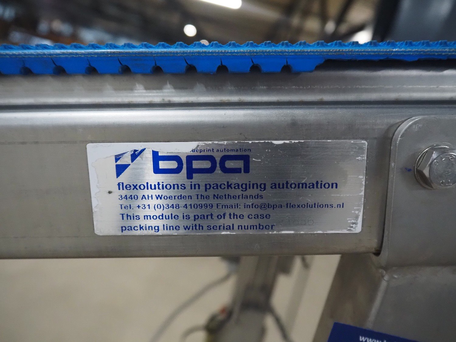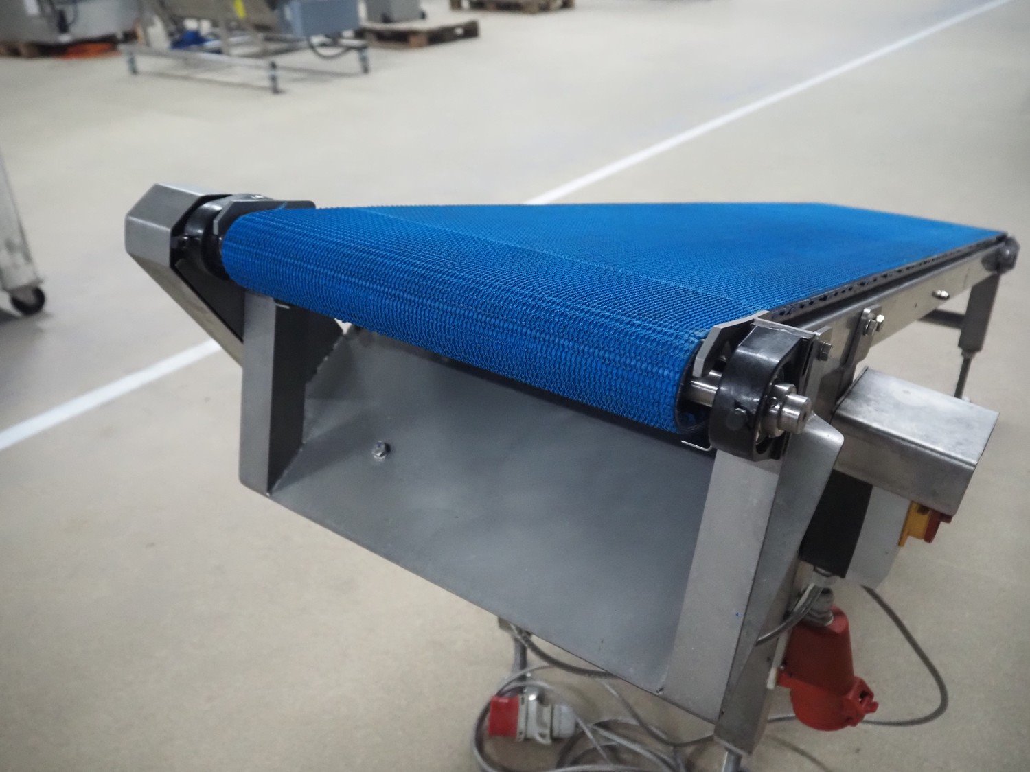 Blueprint Automation elevating belt, plastic belt, belt width: 375 mm, elevating height: 900 mm, total dimensions: 1750 mm x 650 mm x 900 mm.