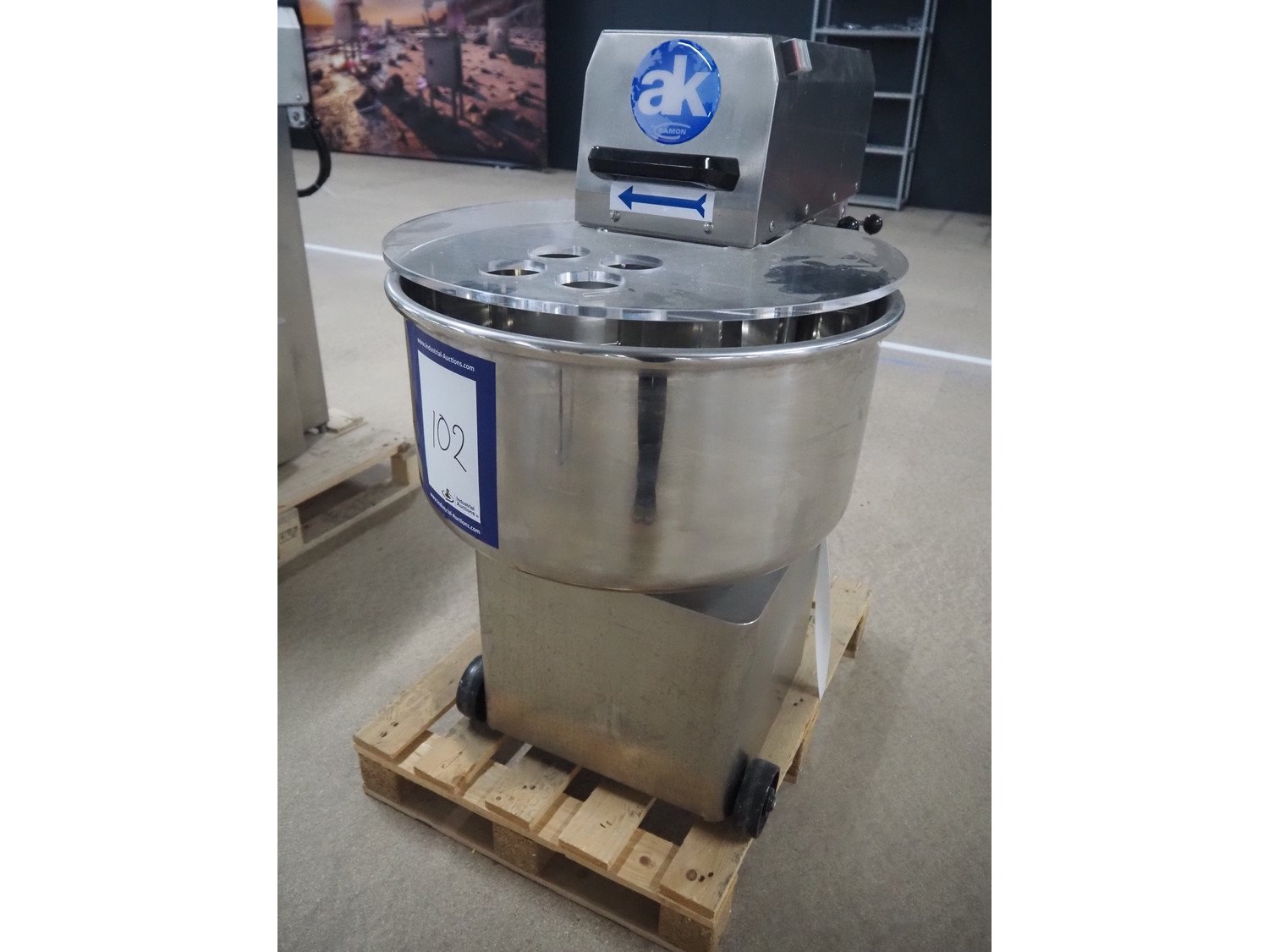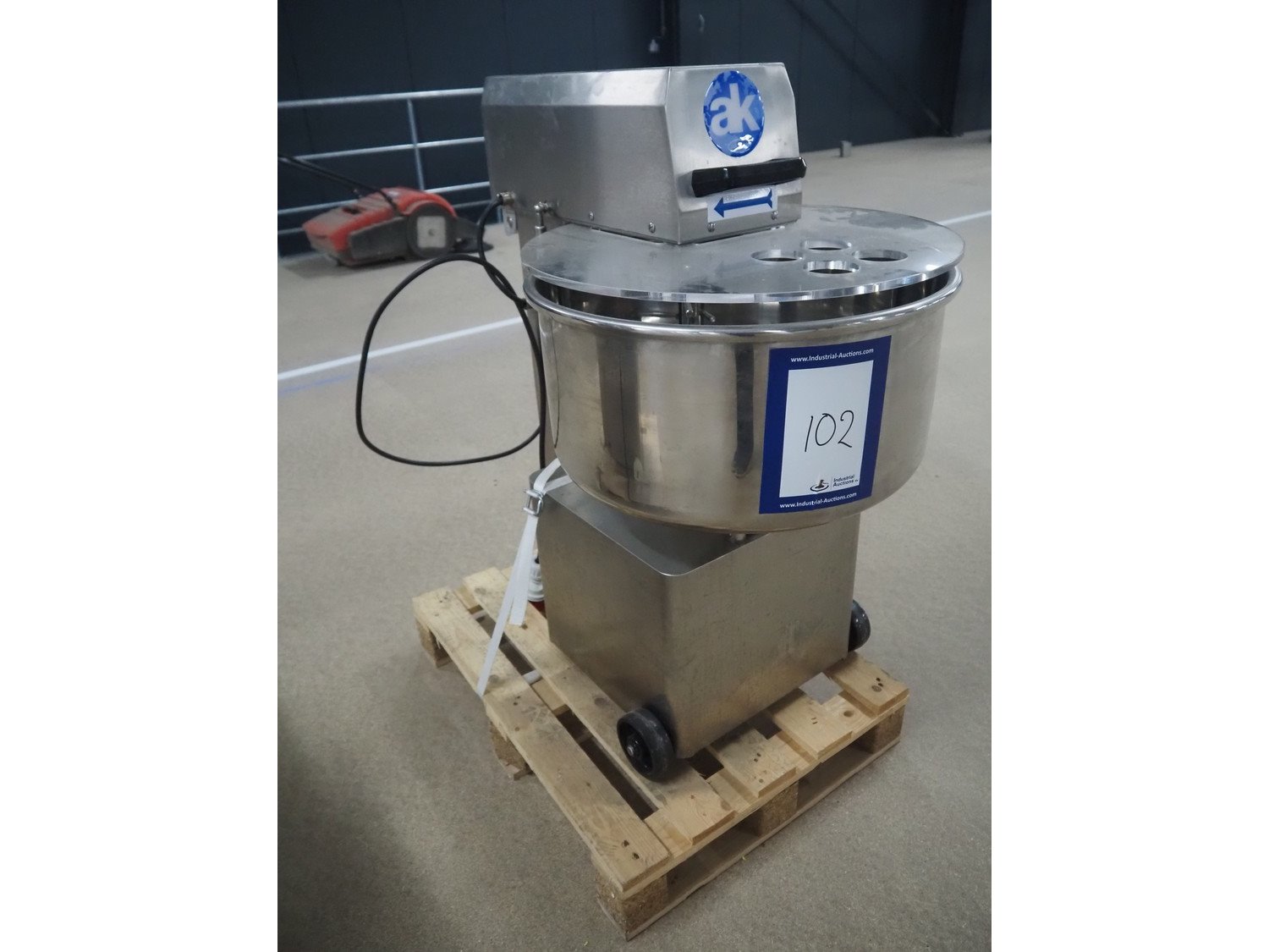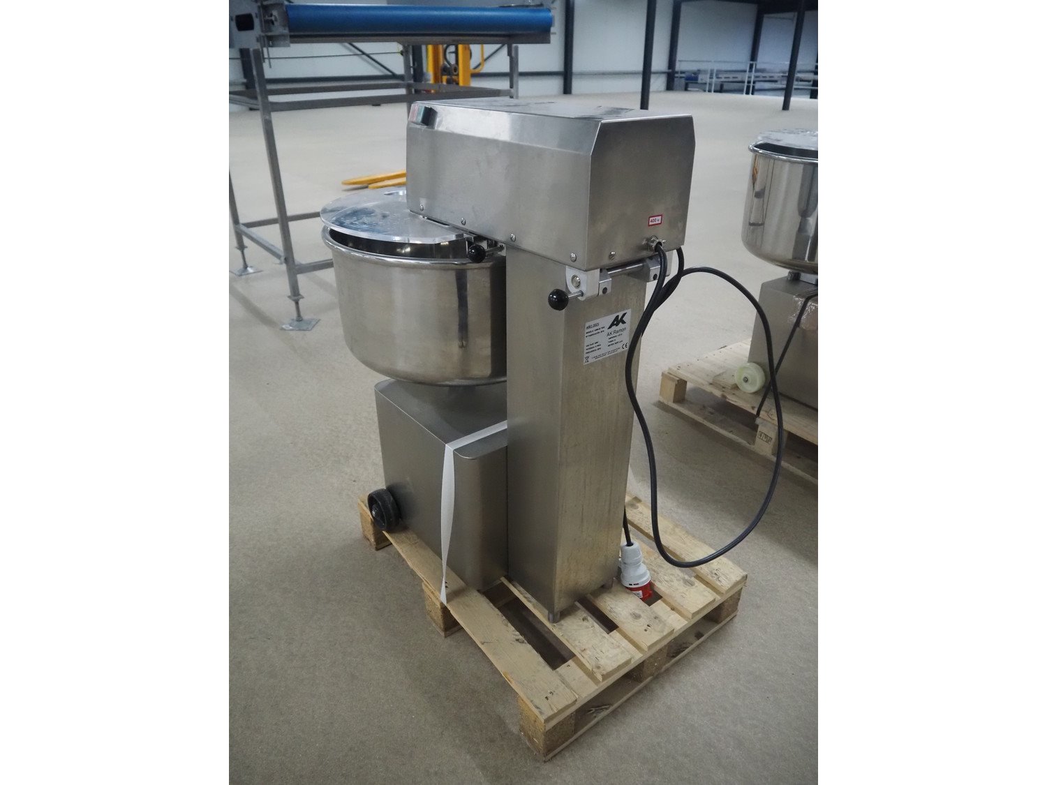 AK Ramon mixer, model: AMM-55 TWO, factory number: 2016, year of construction: 2025, 400 V, 3 Ph, 50 Hz, 1.67 A, 0.75 kW, 54/22 rpm, s/s bowl, volume: 55 liter, dimensions: 800 mm x 550 mm x 960 mm.