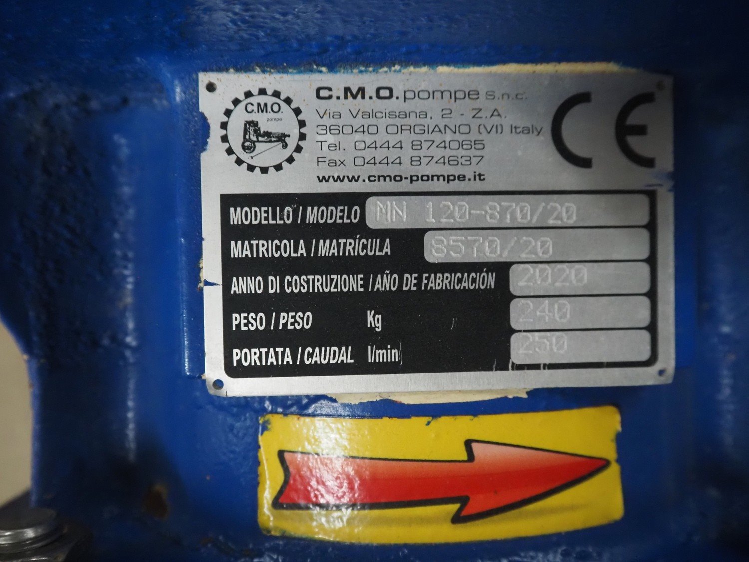 C.M.O. Pompe pump, model: MN 120-870/20, serial number: 8572/20, year of construction: 2020, weight: 240 kg, capacity: 250 liter per minute, dimensions: 2500 mm x 580 mm x 710 mm.