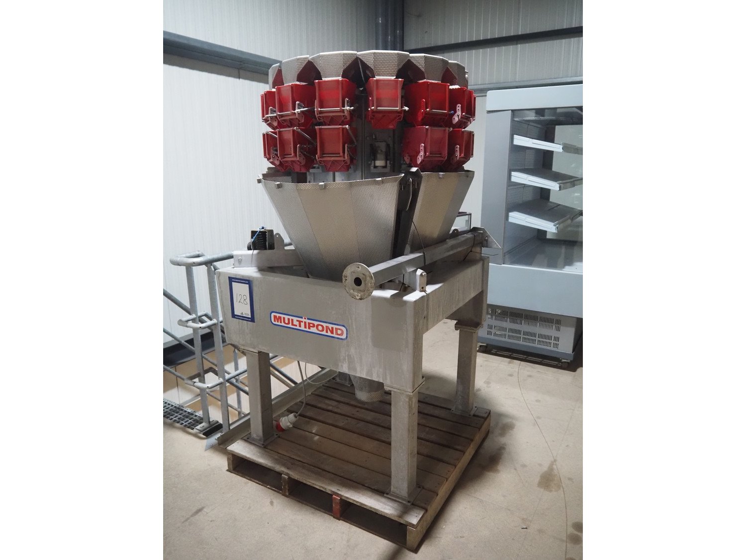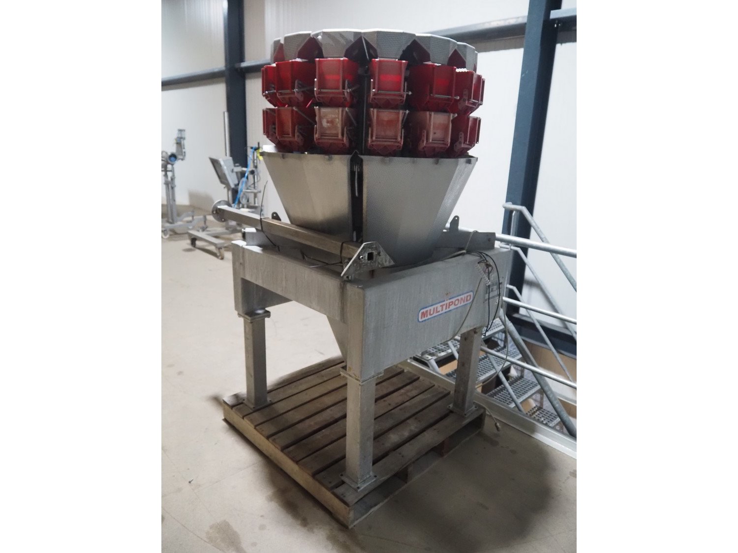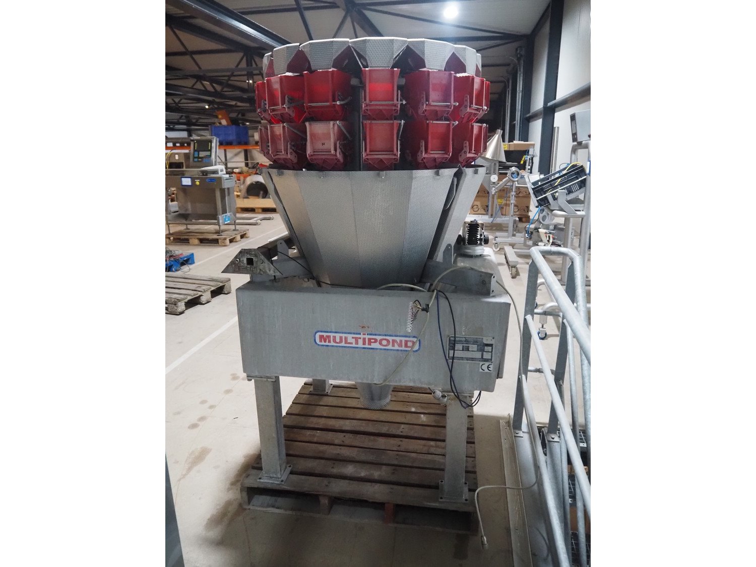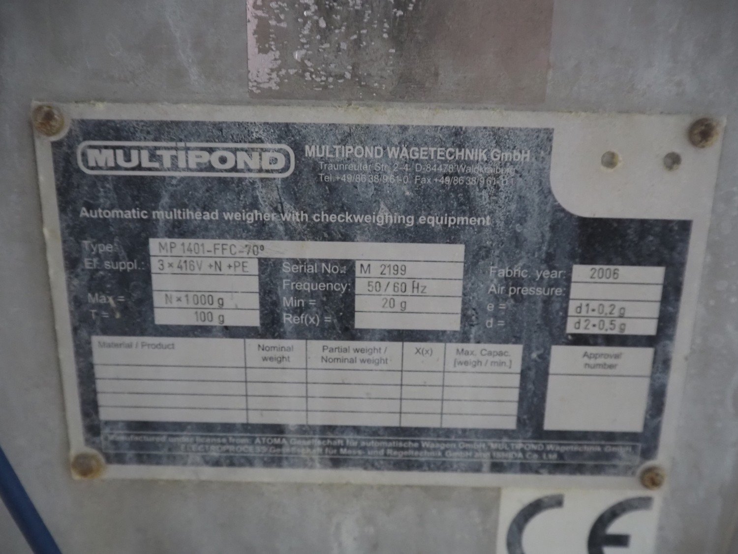 Multipond 14 head multihead weigher, type: MP 1401-FFC-70°, serial number: M 2199, year of construction: 2006, 50/60 Hz, maximum capacity: 1000 g, minimum capacity: 20 g, e= 0.2 g, d= 0.5 g, dimensions: 950 mm x 950 mm x 1750 mm.