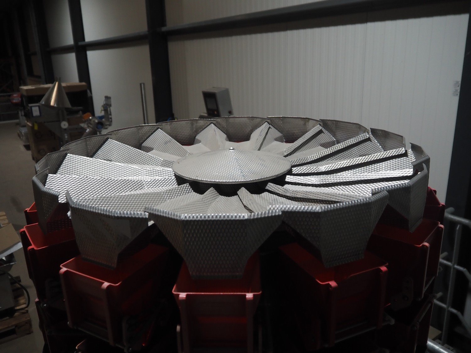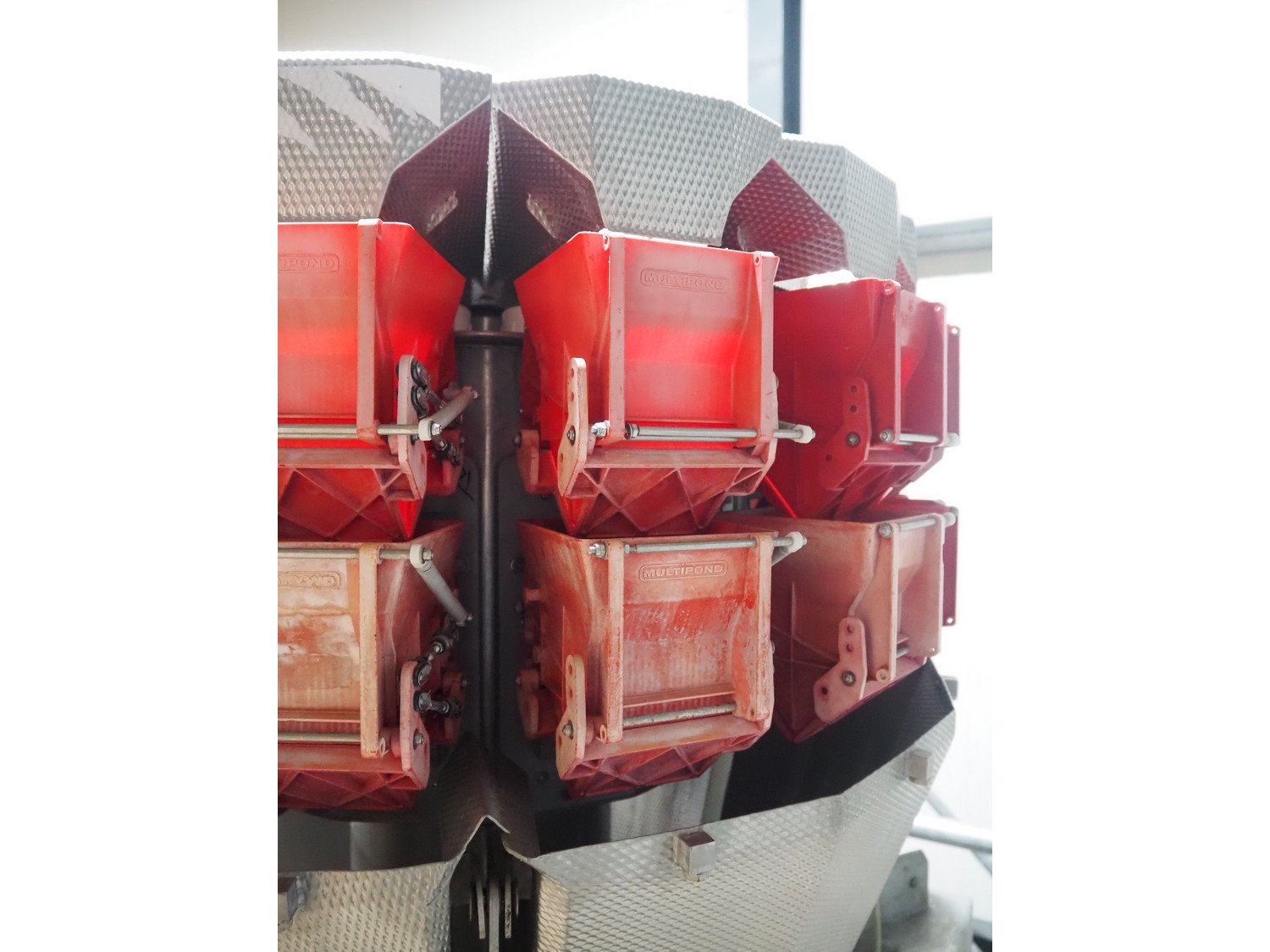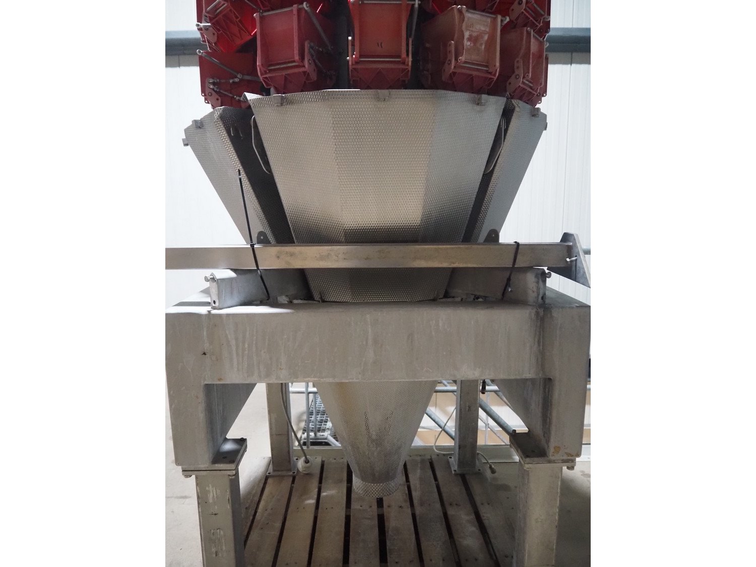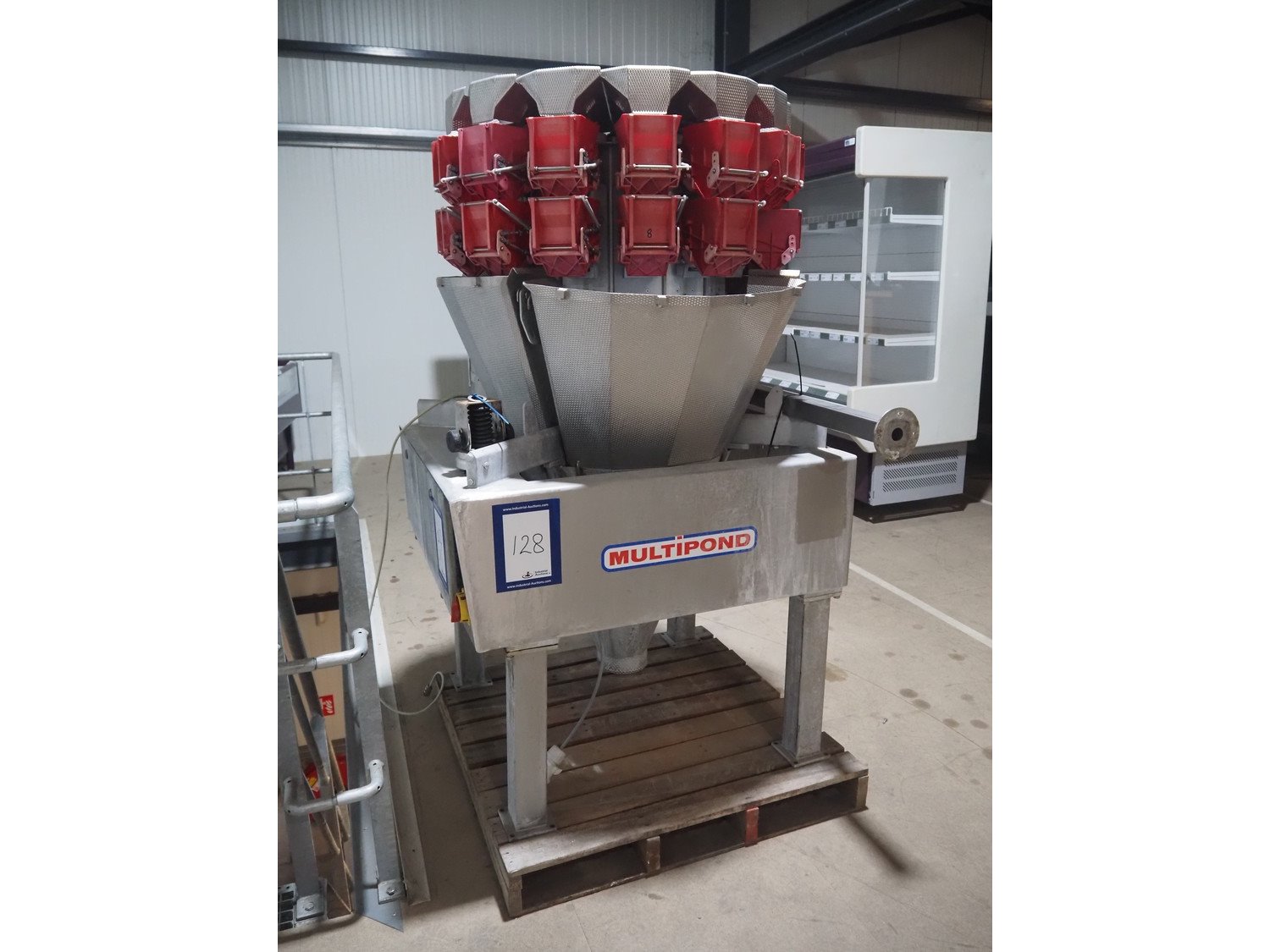 Multipond 14 head multihead weigher, type: MP 1401-FFC-70°, serial number: M 2199, year of construction: 2006, 50/60 Hz, maximum capacity: 1000 g, minimum capacity: 20 g, e= 0.2 g, d= 0.5 g, dimensions: 950 mm x 950 mm x 1750 mm.