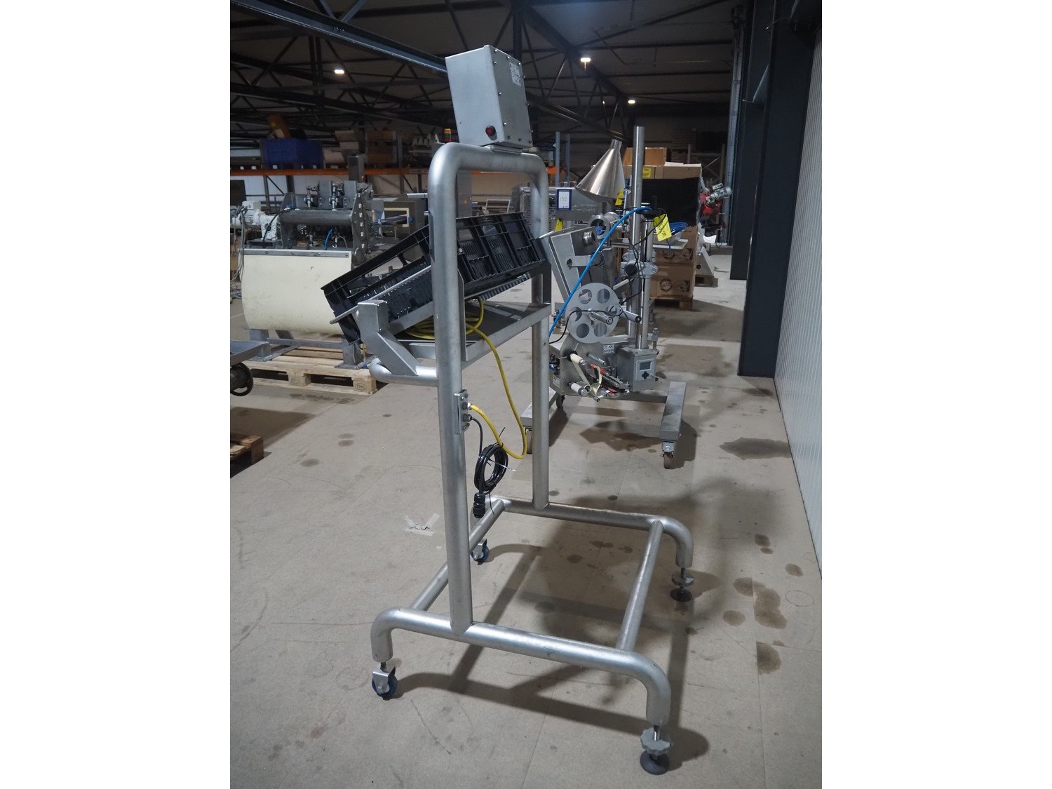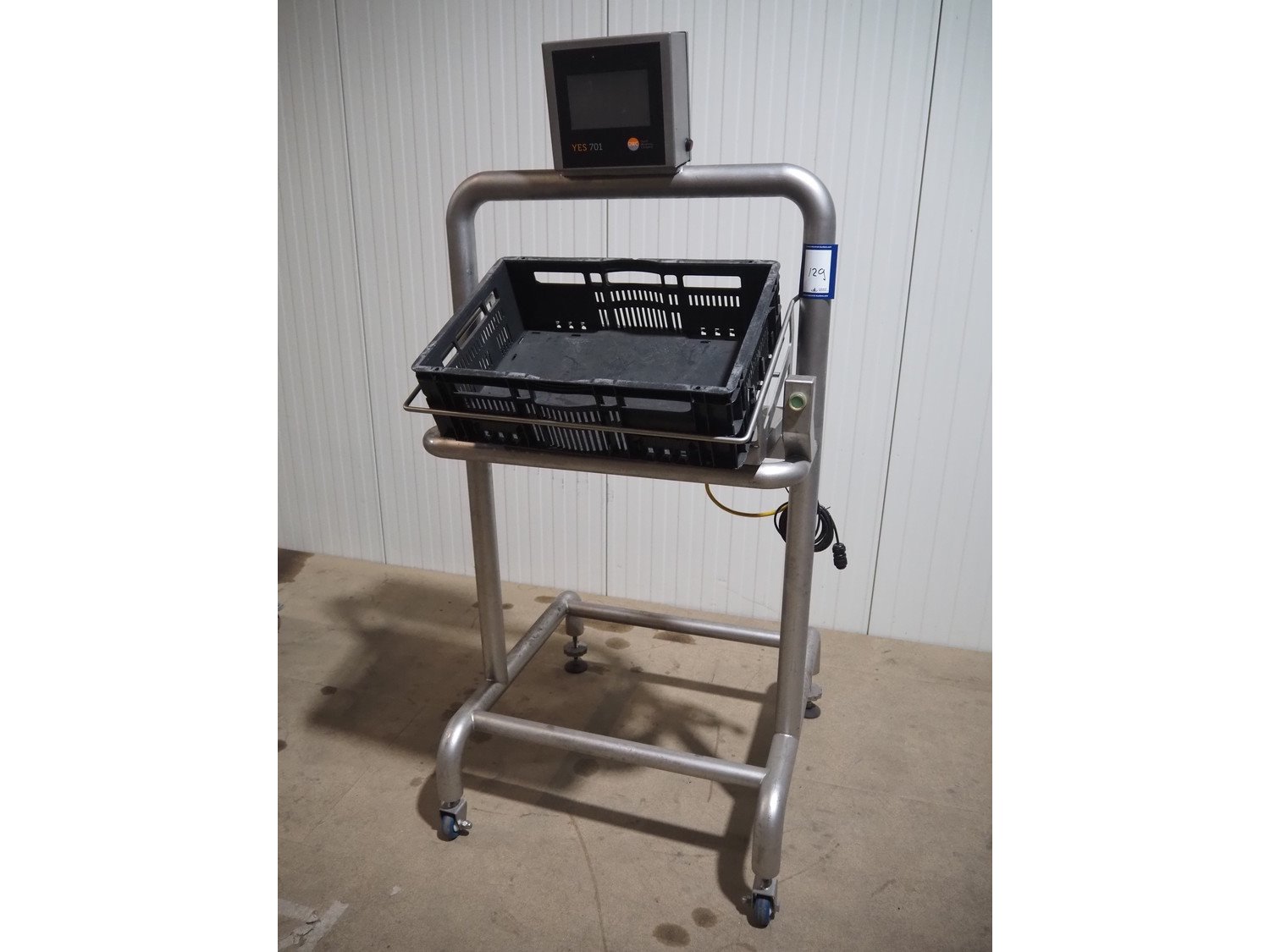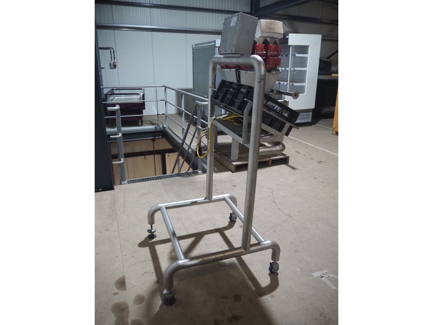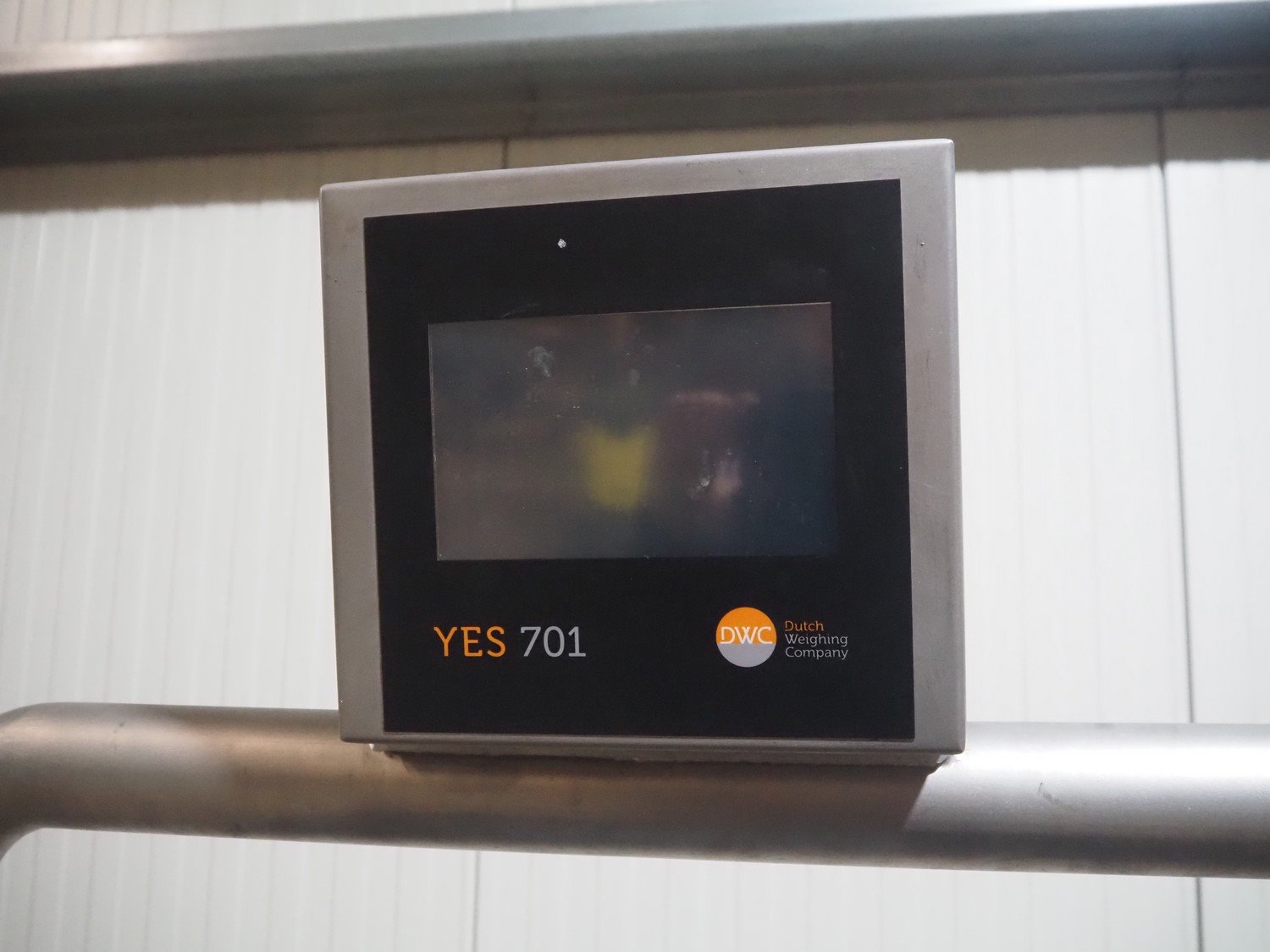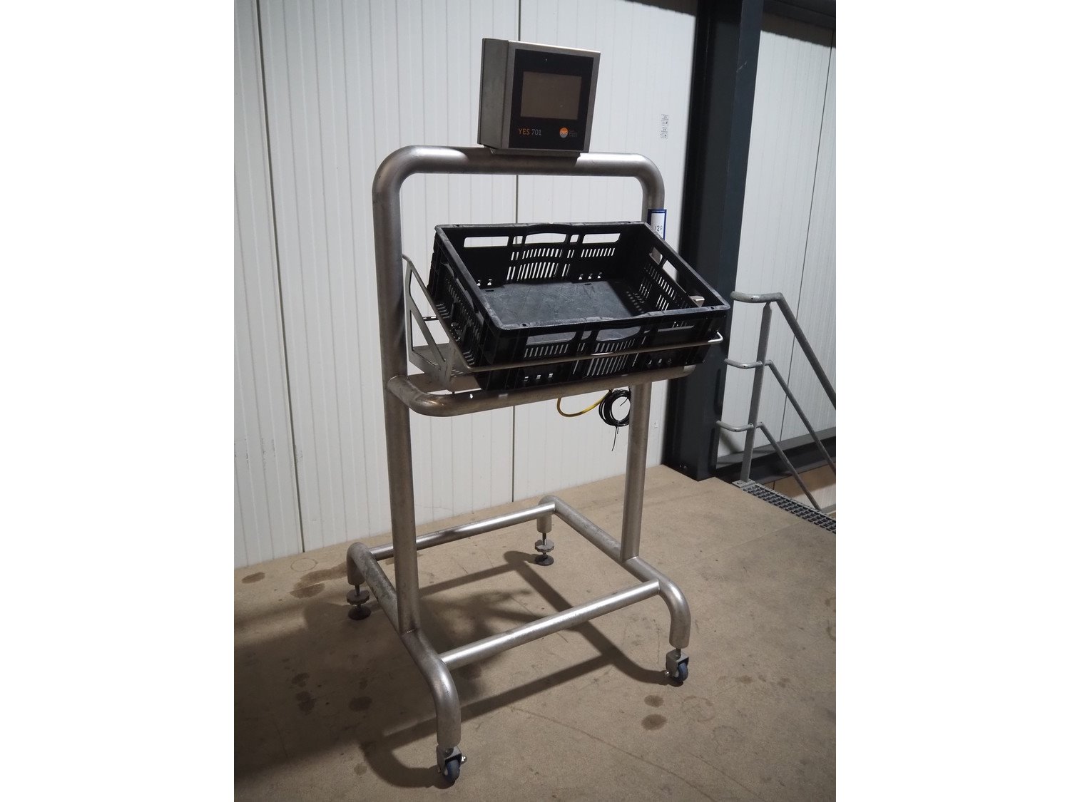 DWC weighing scale for crates, model: ASW, serial number: 202120211300-R, 240 V, 5 A, maximum capacity: 25000 g, minimum weight: 10 g, e= 2 g, dimensions: 820 mm x 900 mm x 1700 mm.