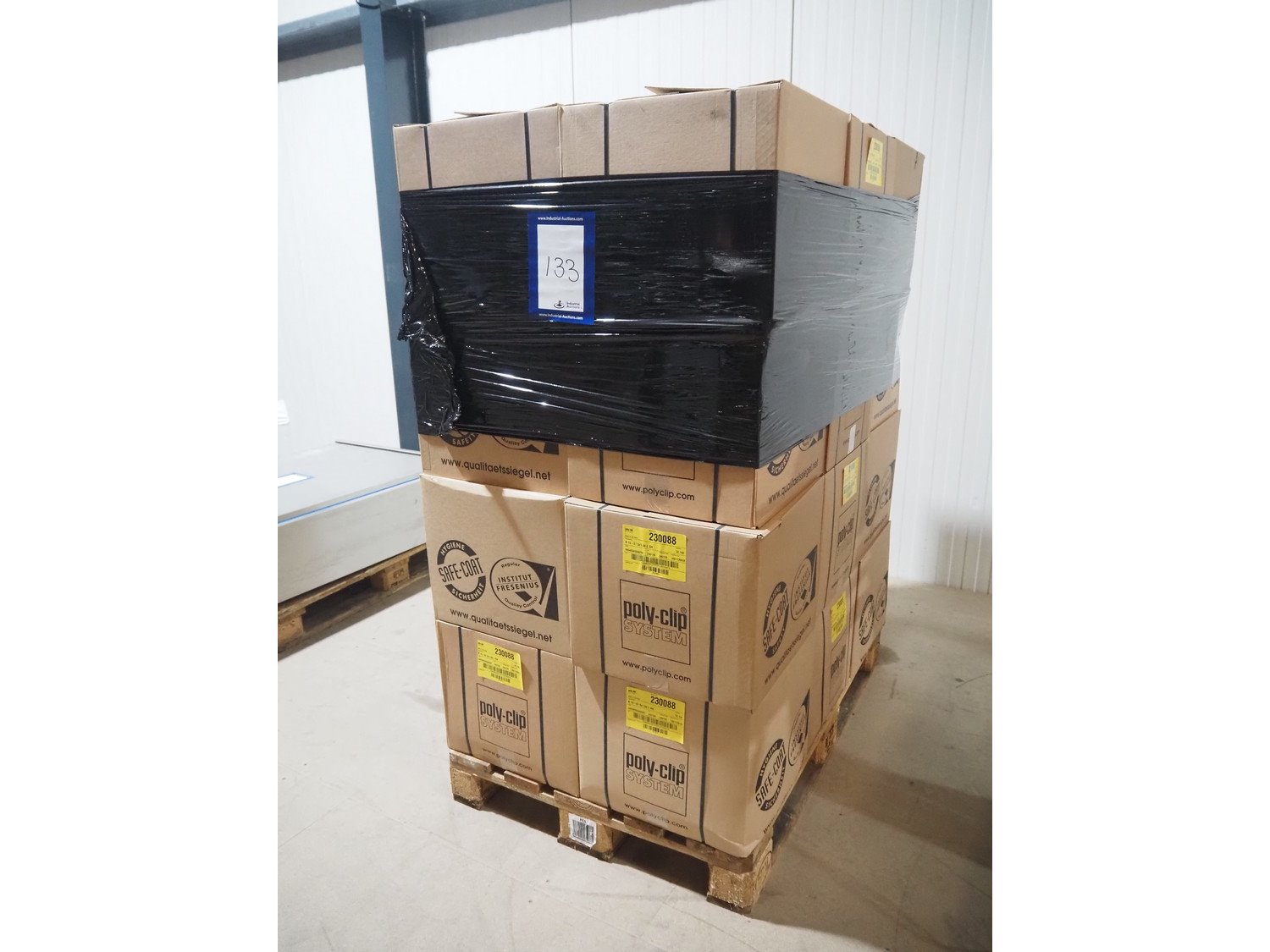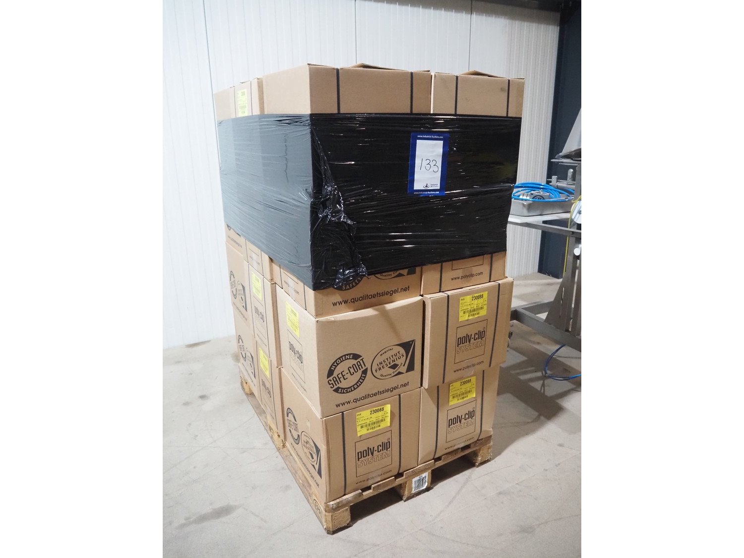Pallet with Poly-Clip System clips, clip type: R 15-07 5x1.50 L GH, 32100 clips per box, 24 boxes, dimensions: 1200 mm x 800 mm x 1570 mm.