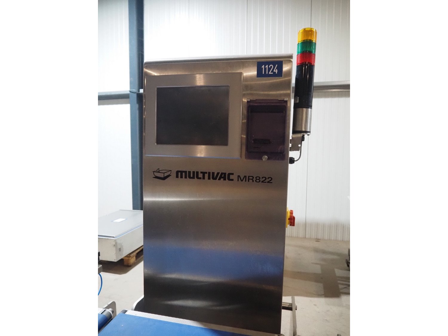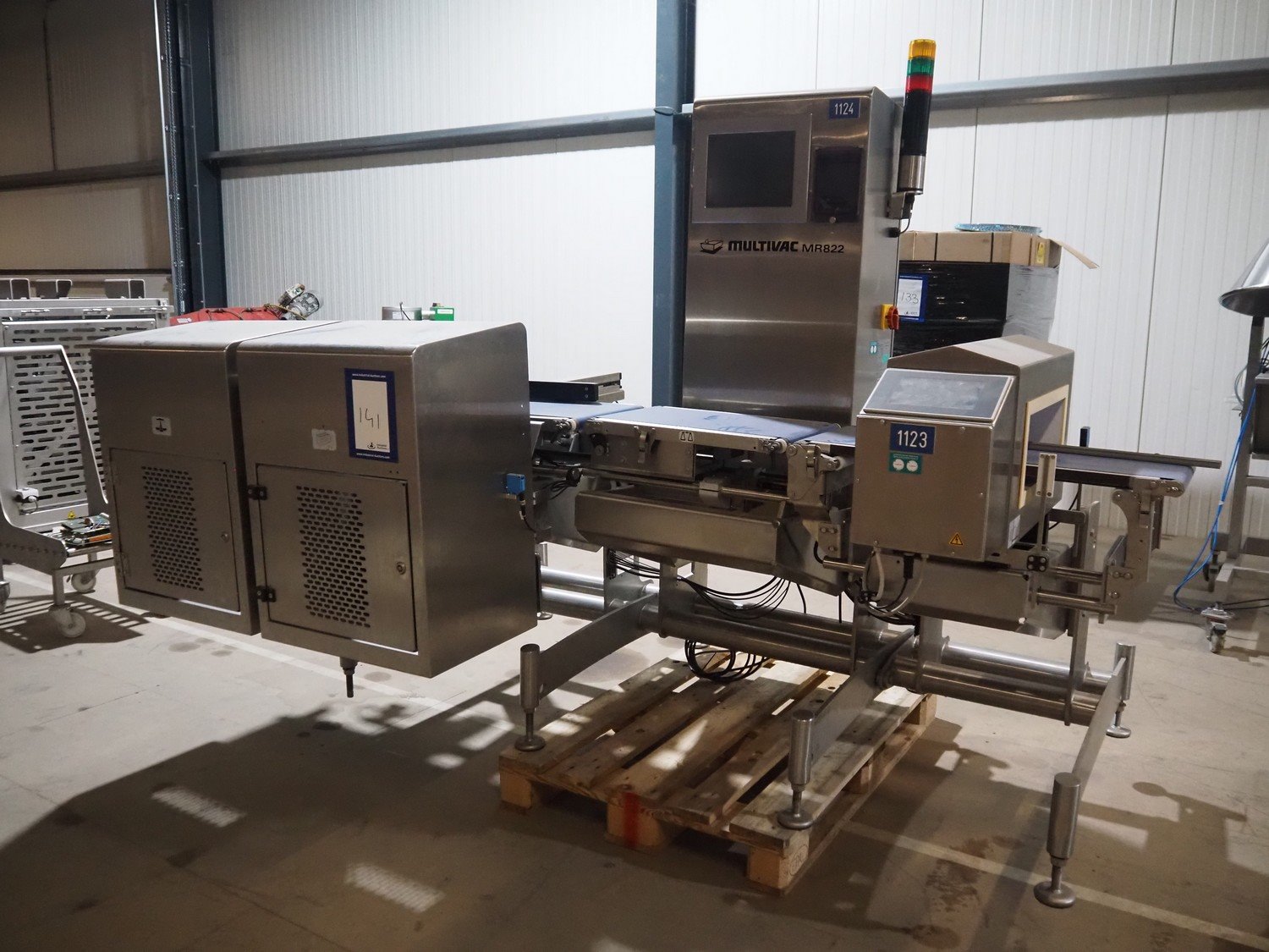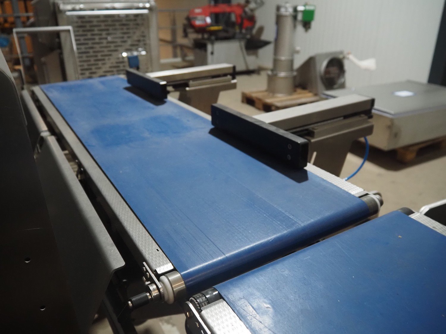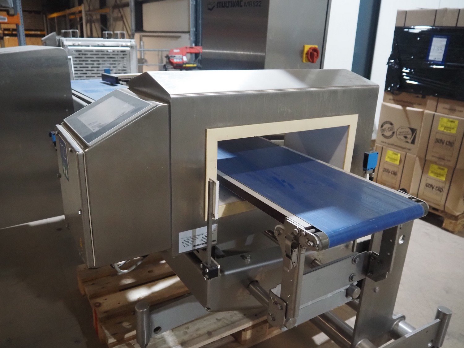 Multivac metal detector with checkweigher and 2 rejectors, metal detector type: GLS, serial number: 11406016720-H, 110/230 V, 50/60 Hz, 0.36/0.18 A, clearance: 400 mm x 100 mm, type Bizerba checkweigher: MR8, number: 10996651, 120/220/240 V, 50/60 Hz, 5.0/3.0 A, maximum capacity: 1500/3000 g, minimum capacity: 50 g, plastic belts, belt width: 300 mm, total dimensions: 2650 mm x 1350 mm x 1820 mm.