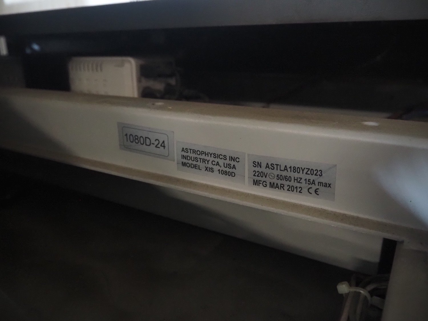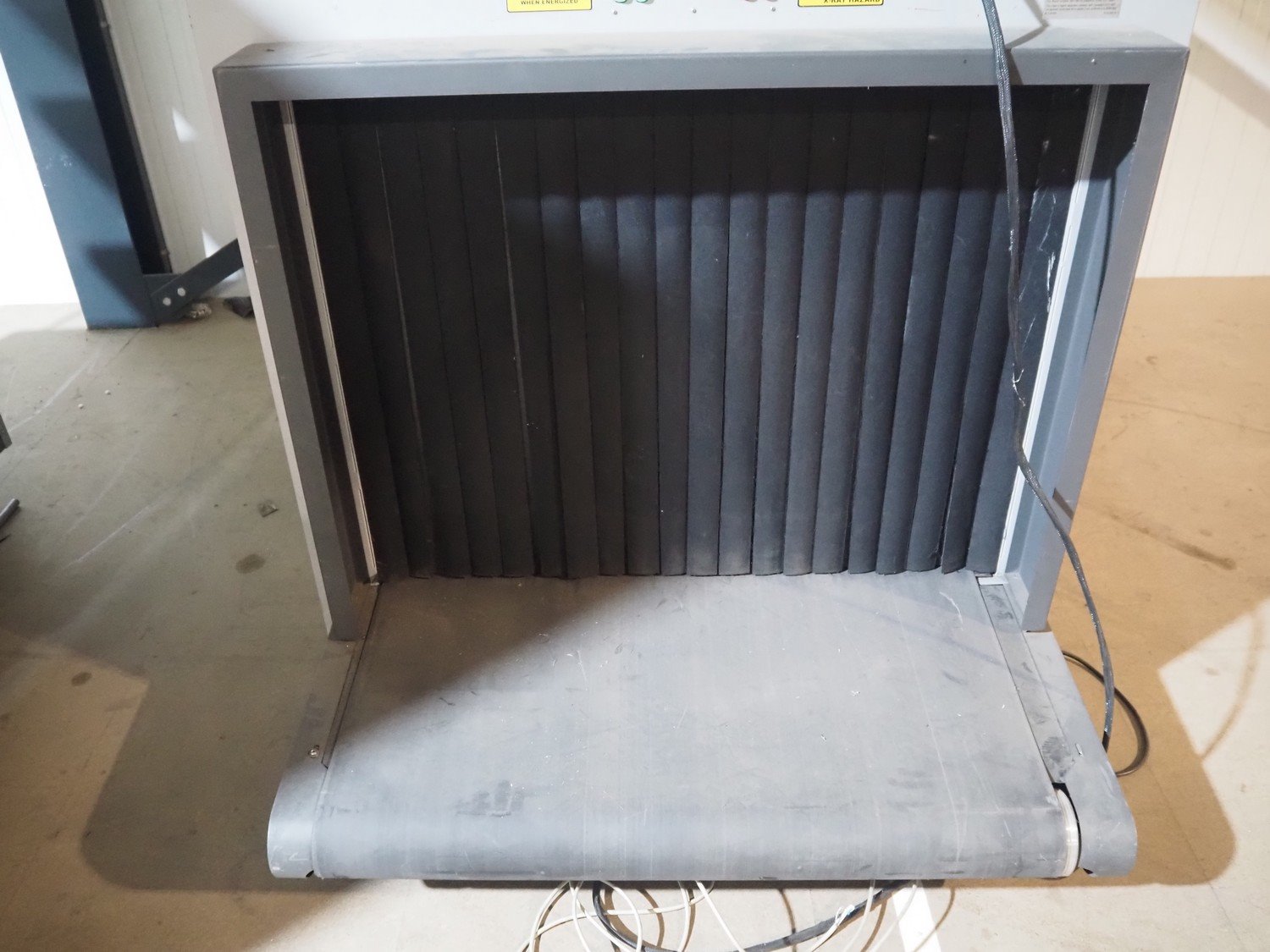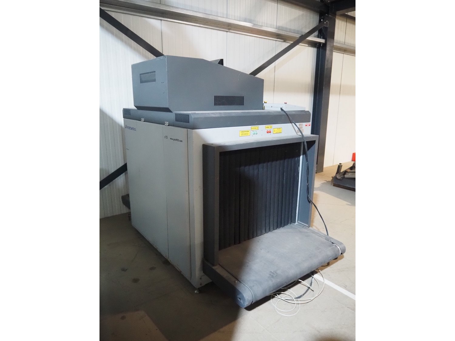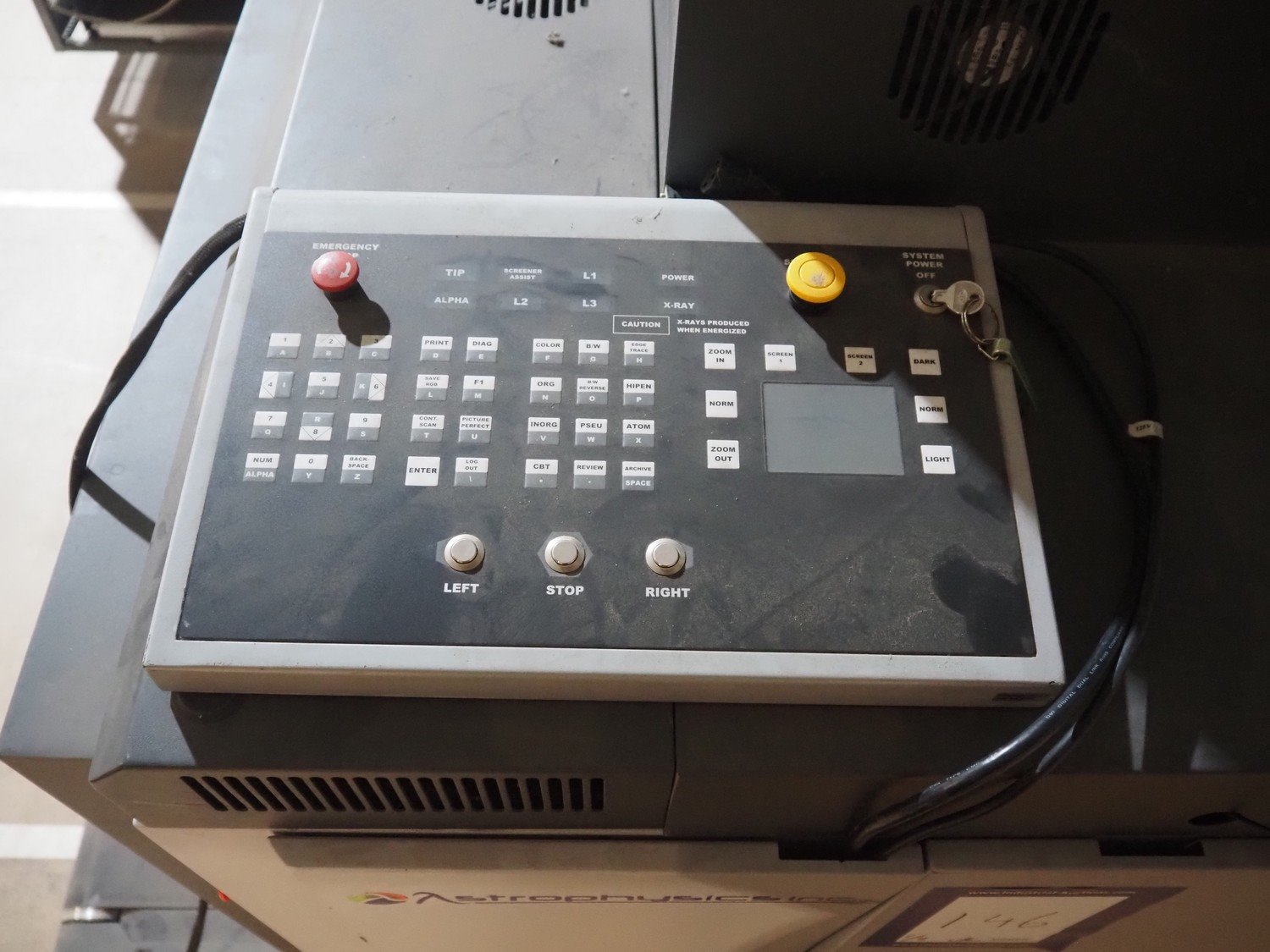 Astrophysics Industry CA X-ray machine, model: XIS 1080D, serial number: ASTLA180YZ023, year of construction: MAR 2012, 220 V, 50/60 Hz, 15 A, plastic belt, belt width: 970 mm, clearance: 1010 mm x 810 mm, total dimensions X-ray scanner: 1600 mm x 1300 mm x 1800 mm, including in-and outfeed roller conveyors, roller width: 970 mm, total dimensions roller conveyors: (2x) 1100 mm x 1600 mm x 1800 mm.
