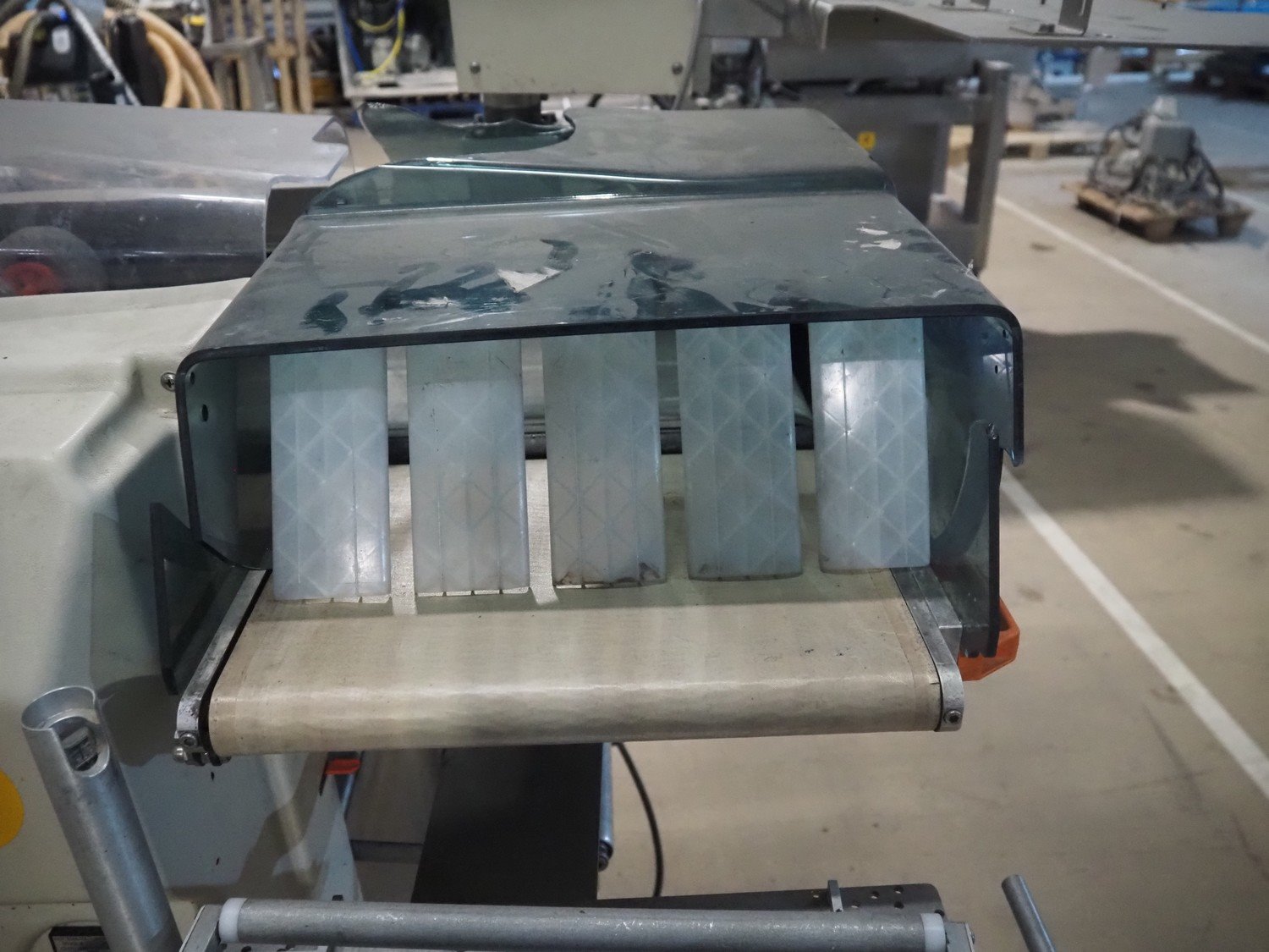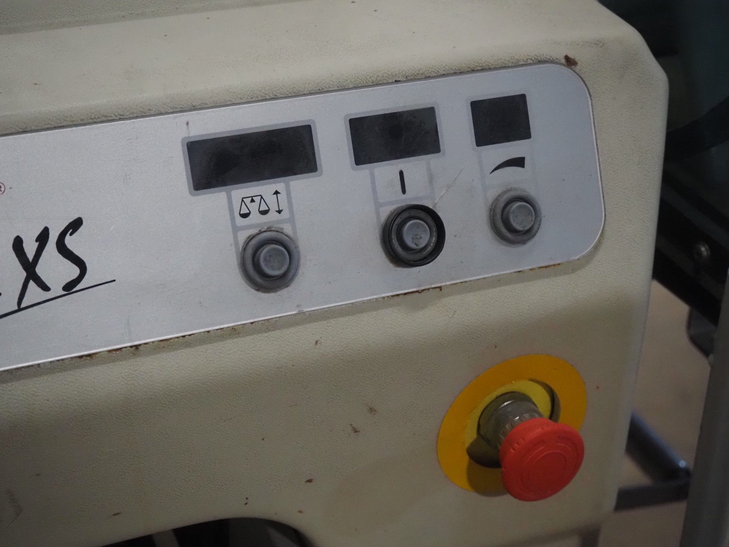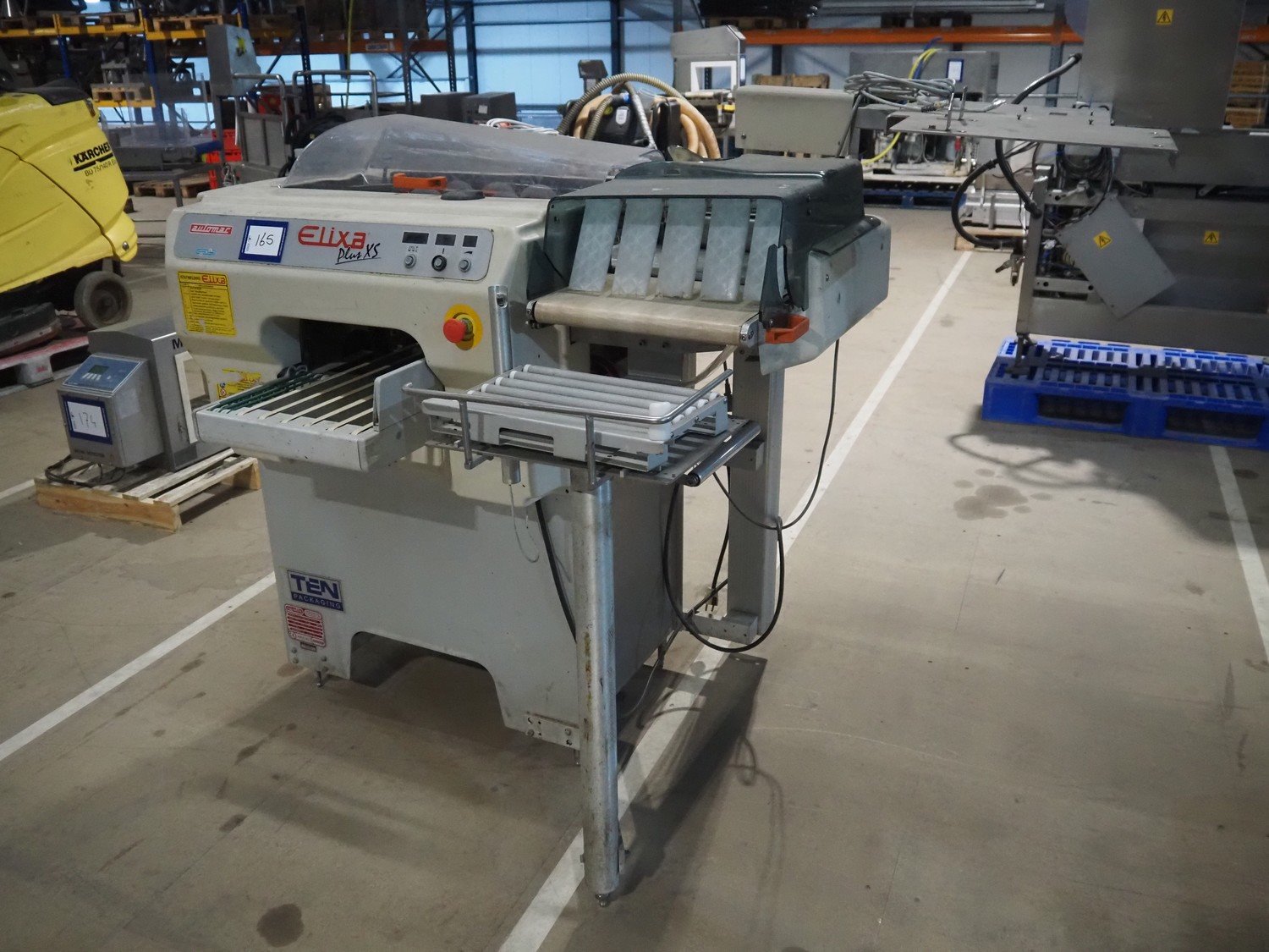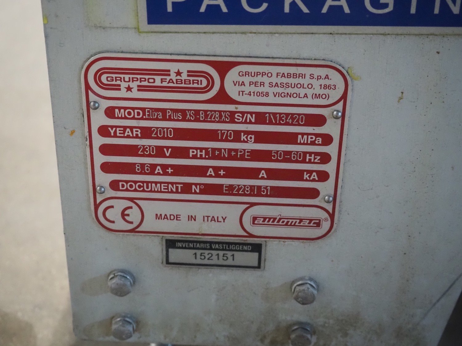 Gruppo Fabbri S.p.A. packaging machine, model: Elixa Plus XS-B.228.XS, serial number: 1/13420, year of construction: 2010, 230 V, 1 Ph, 50-60 Hz, 8,6 A, weight: 170 kg, wire infeed belt, belt width: 662 mm, plastic outfeed belt, belt width: 340 mm, total dimensions: 1500 mm x 1300 mm x 1350 mm.
