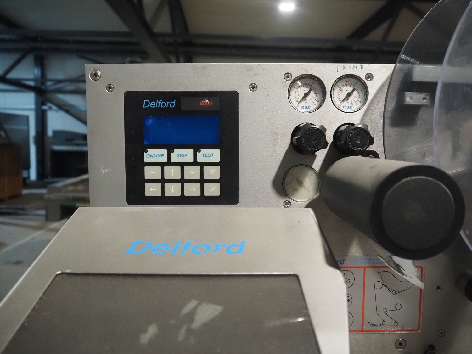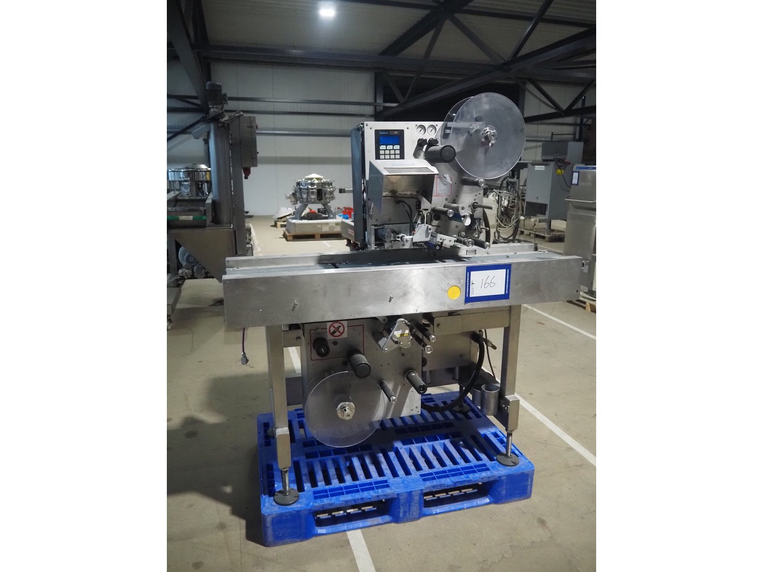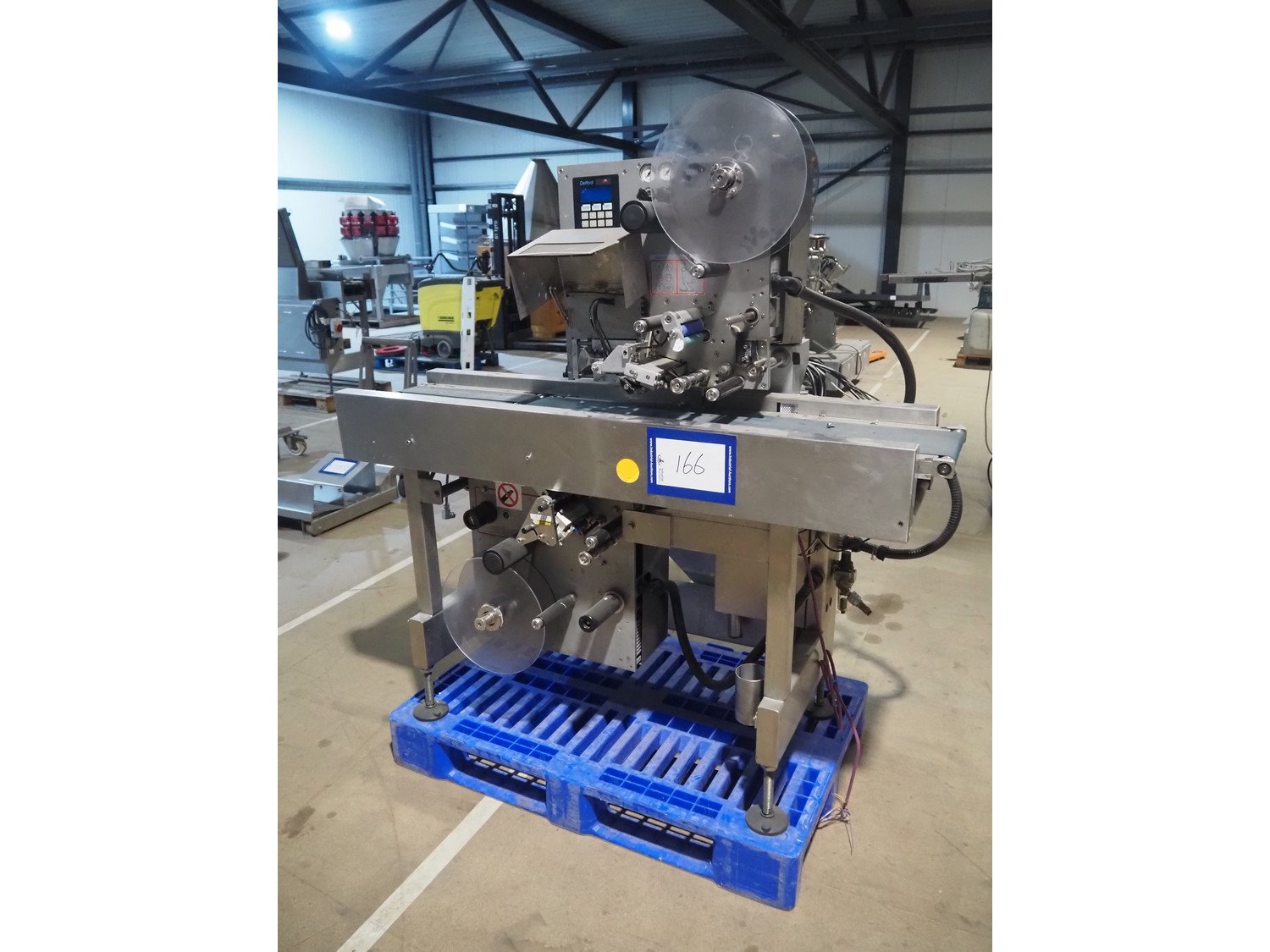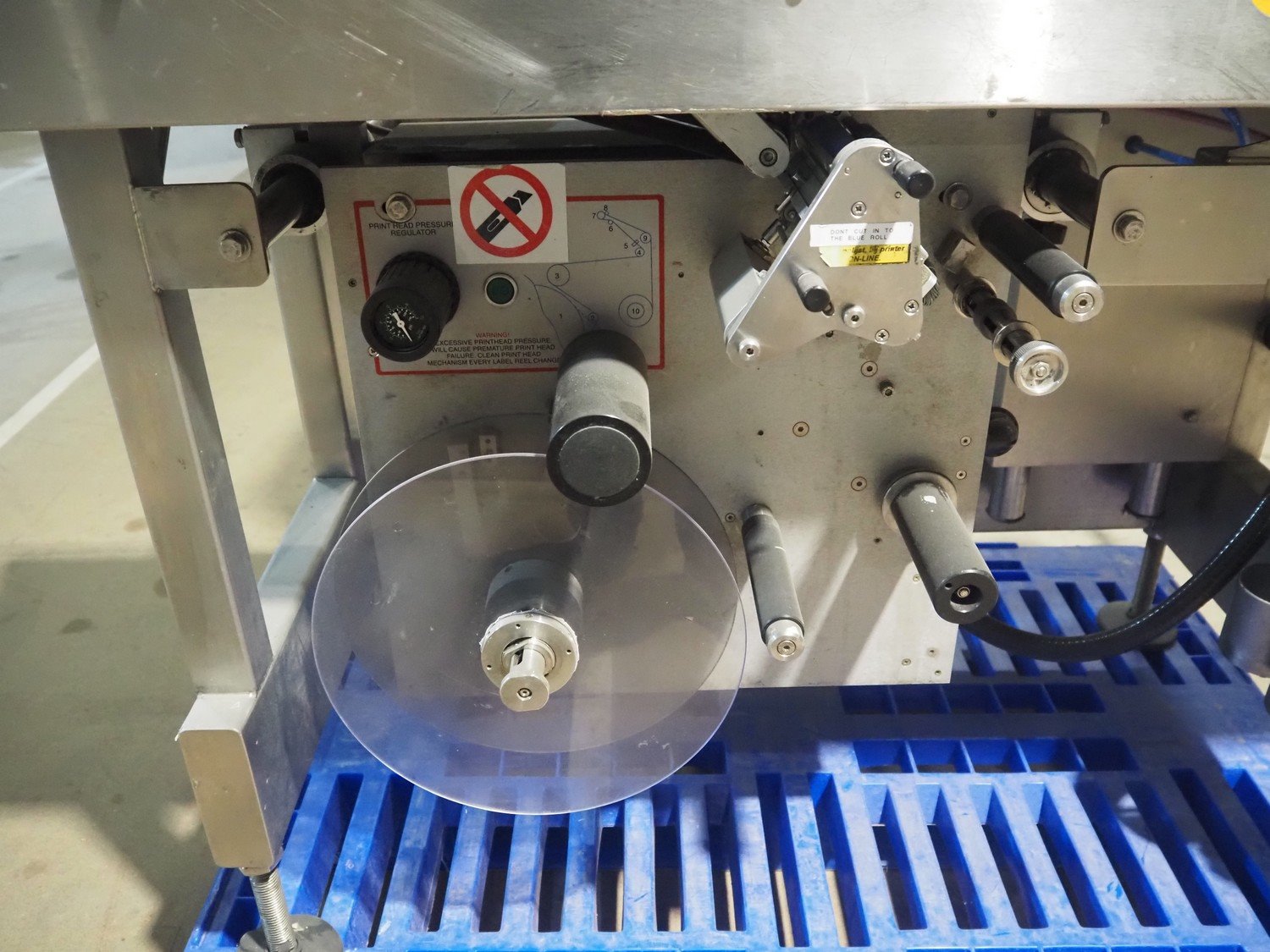 AEW Delford labelling machine with top and bottom labeller, plastic belts, belt width: (1x) 195 mm, (2x) 90 mm, total dimensions: 1500 mm x 600 mm x 1580 mm.