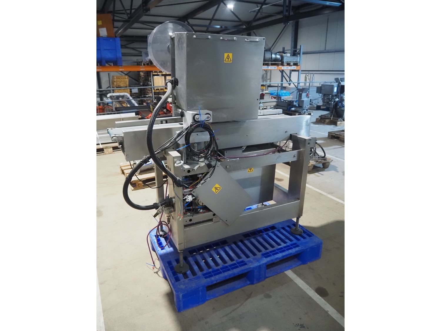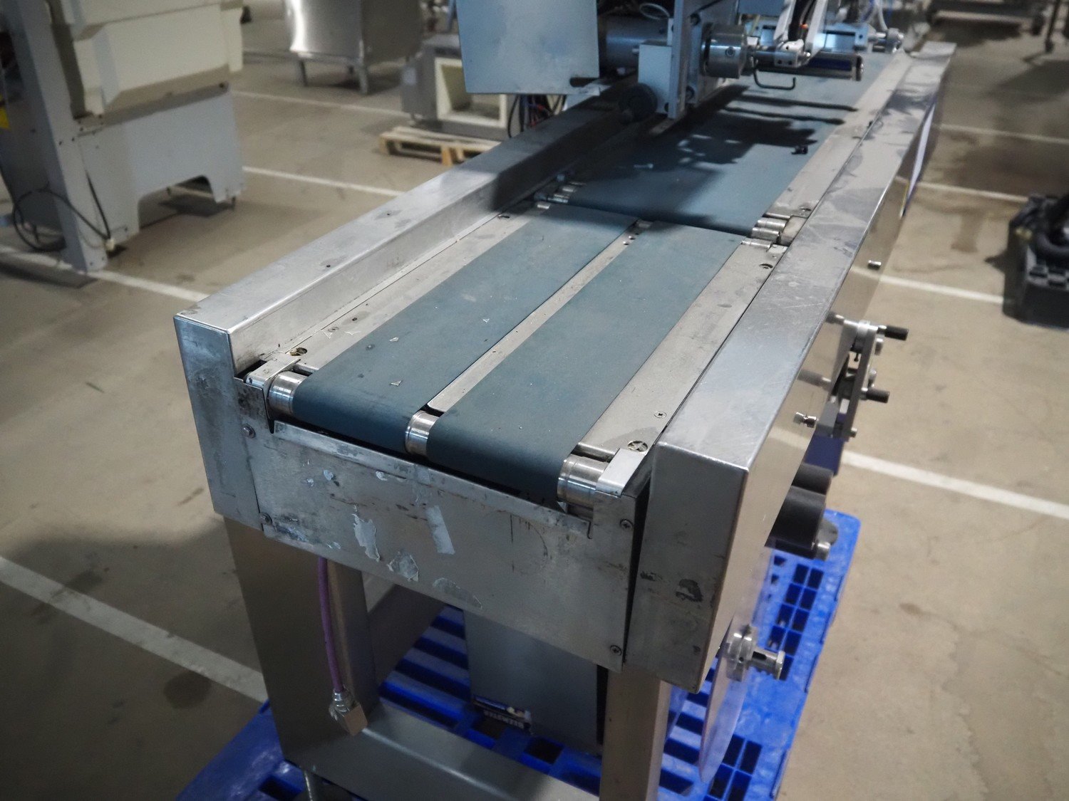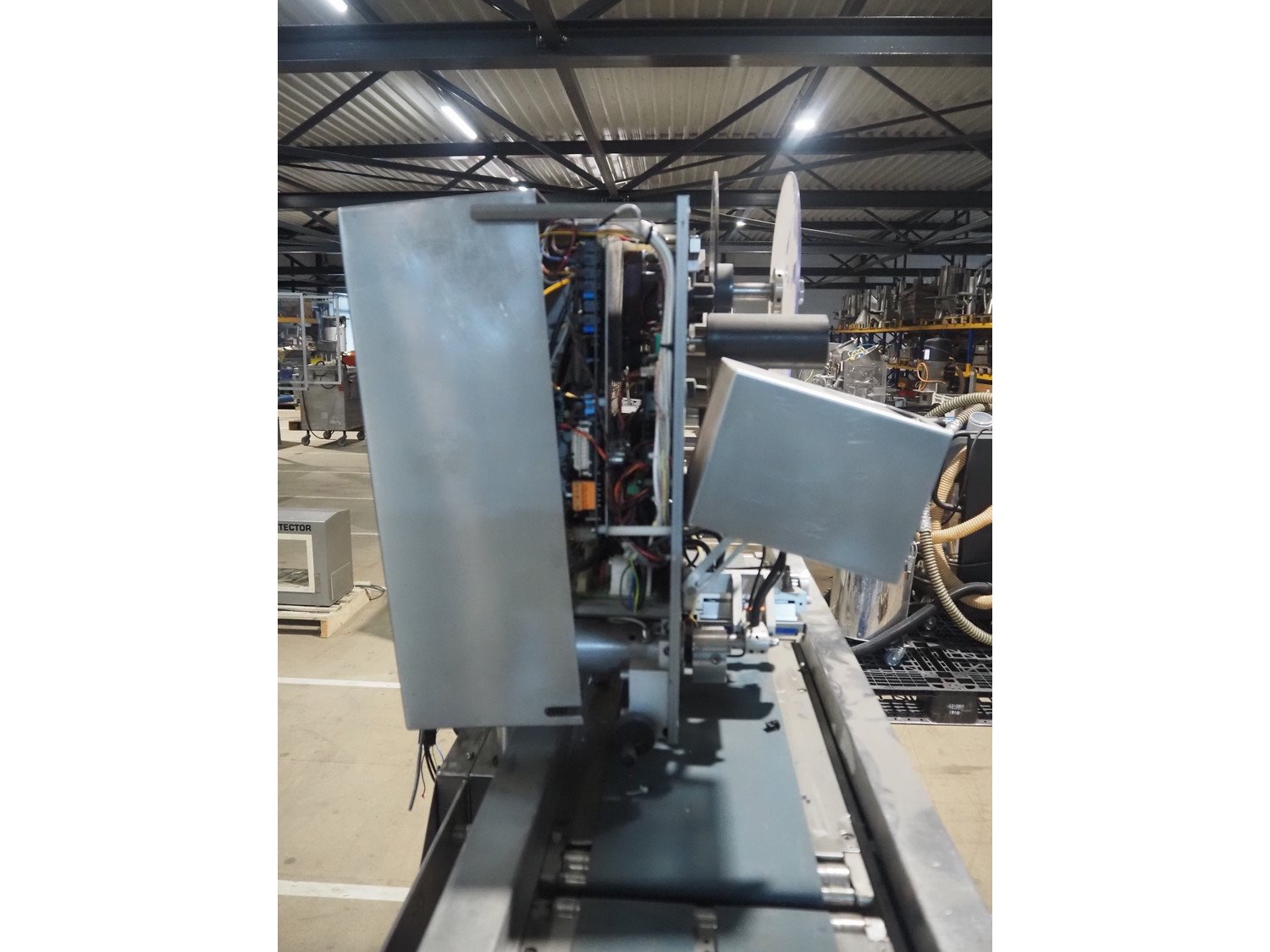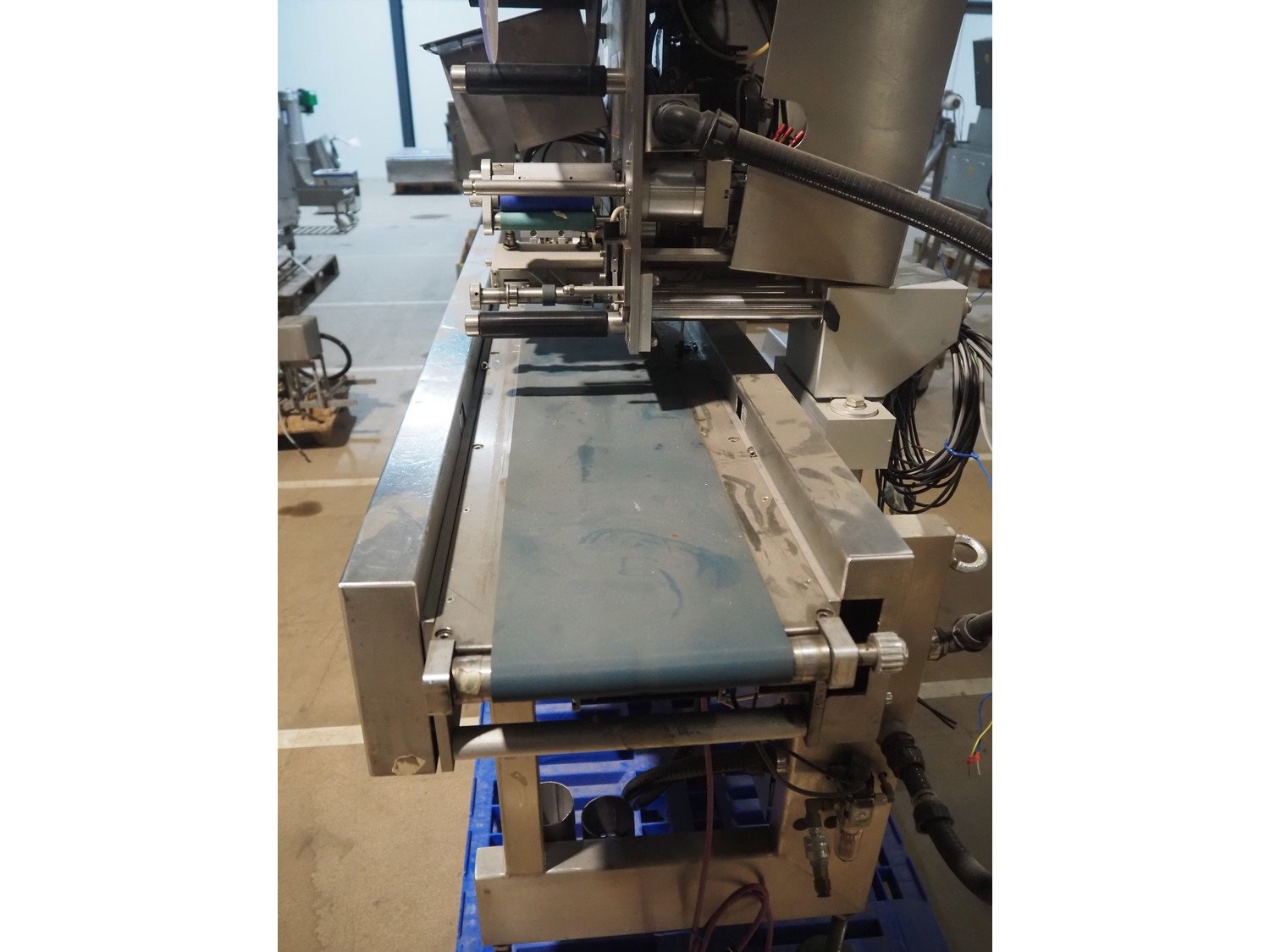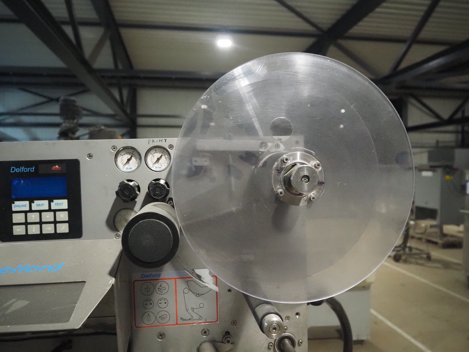 AEW Delford labelling machine with top and bottom labeller, plastic belts, belt width: (1x) 195 mm, (2x) 90 mm, total dimensions: 1500 mm x 600 mm x 1580 mm.