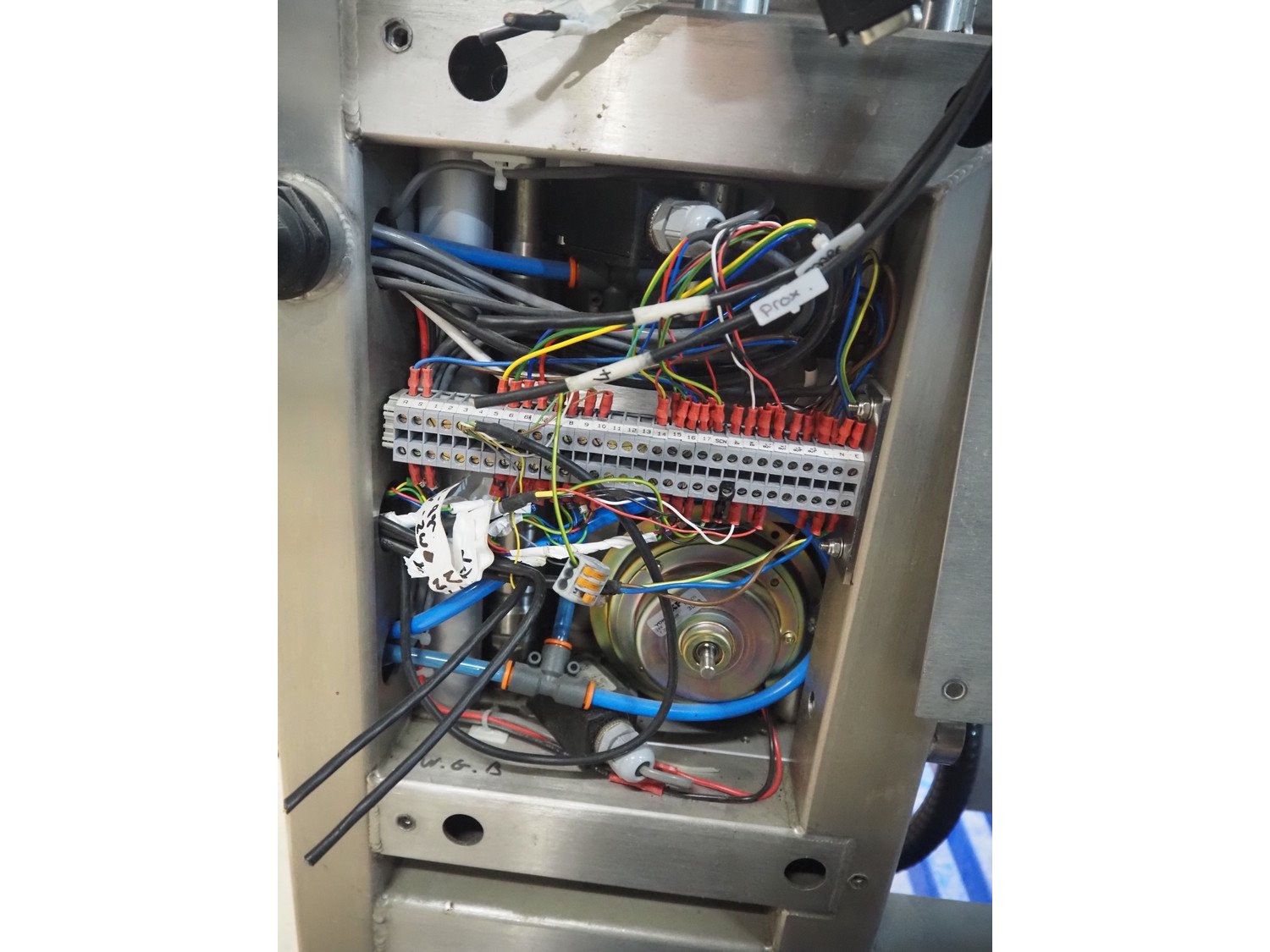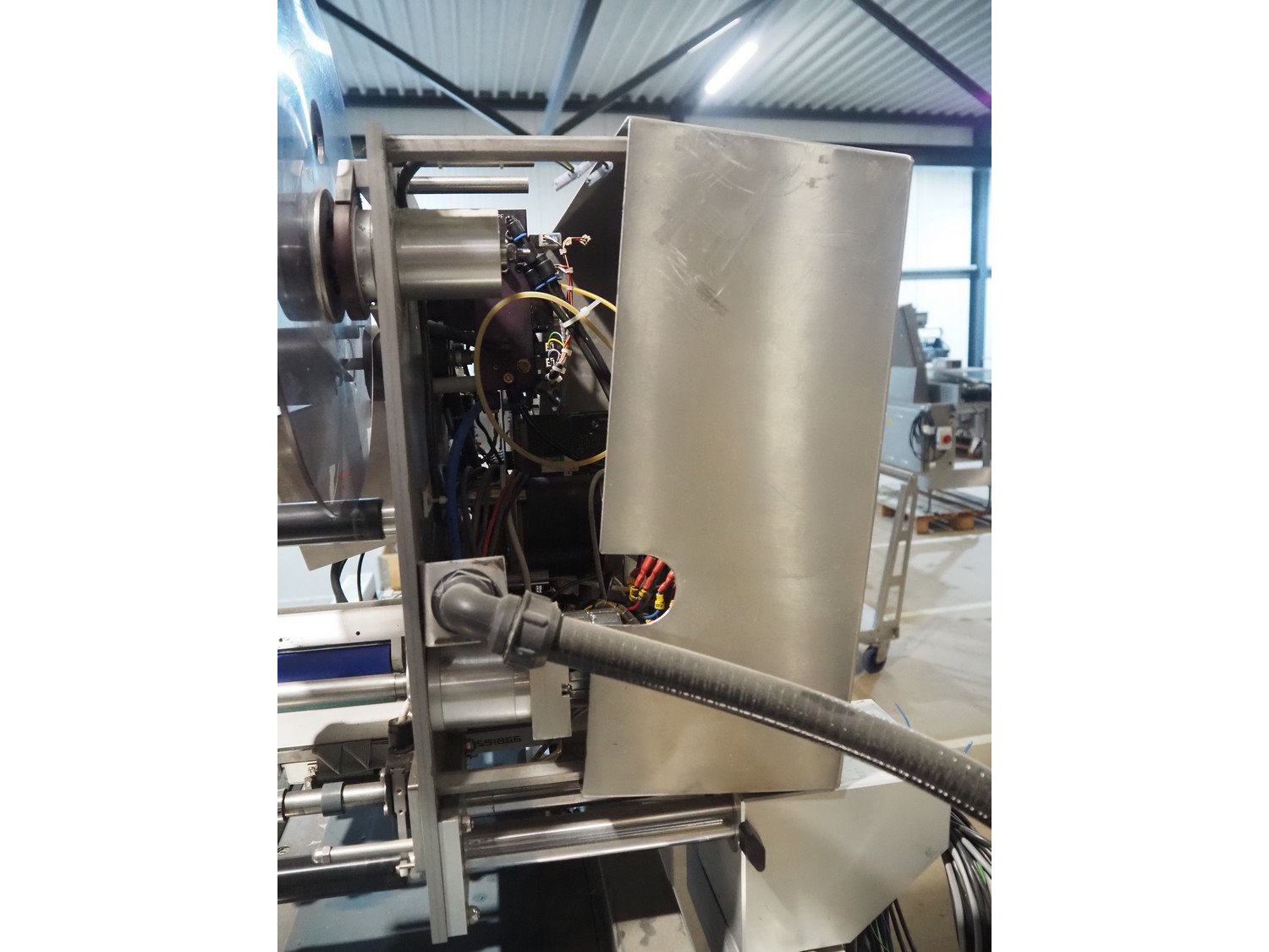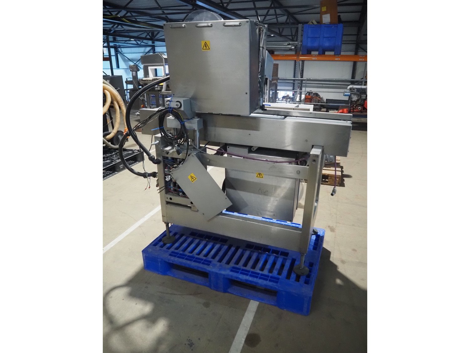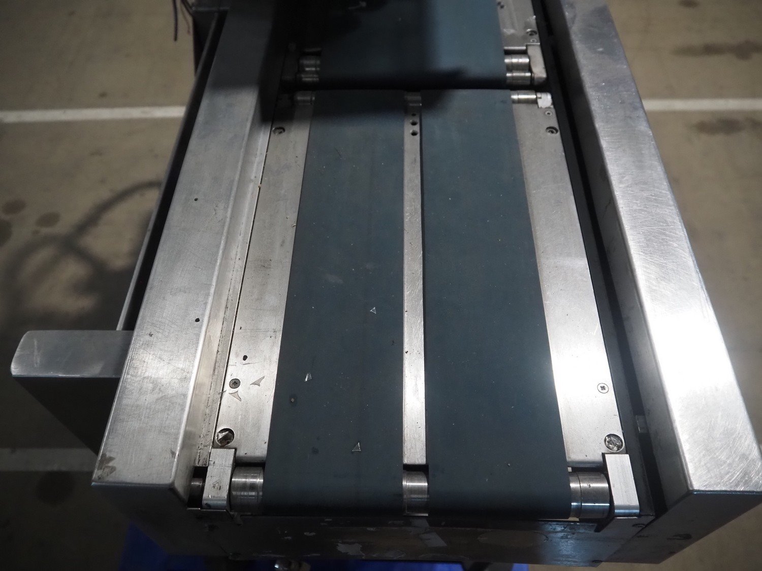 AEW Delford labelling machine with top and bottom labeller, plastic belts, belt width: (1x) 195 mm, (2x) 90 mm, total dimensions: 1500 mm x 600 mm x 1580 mm.