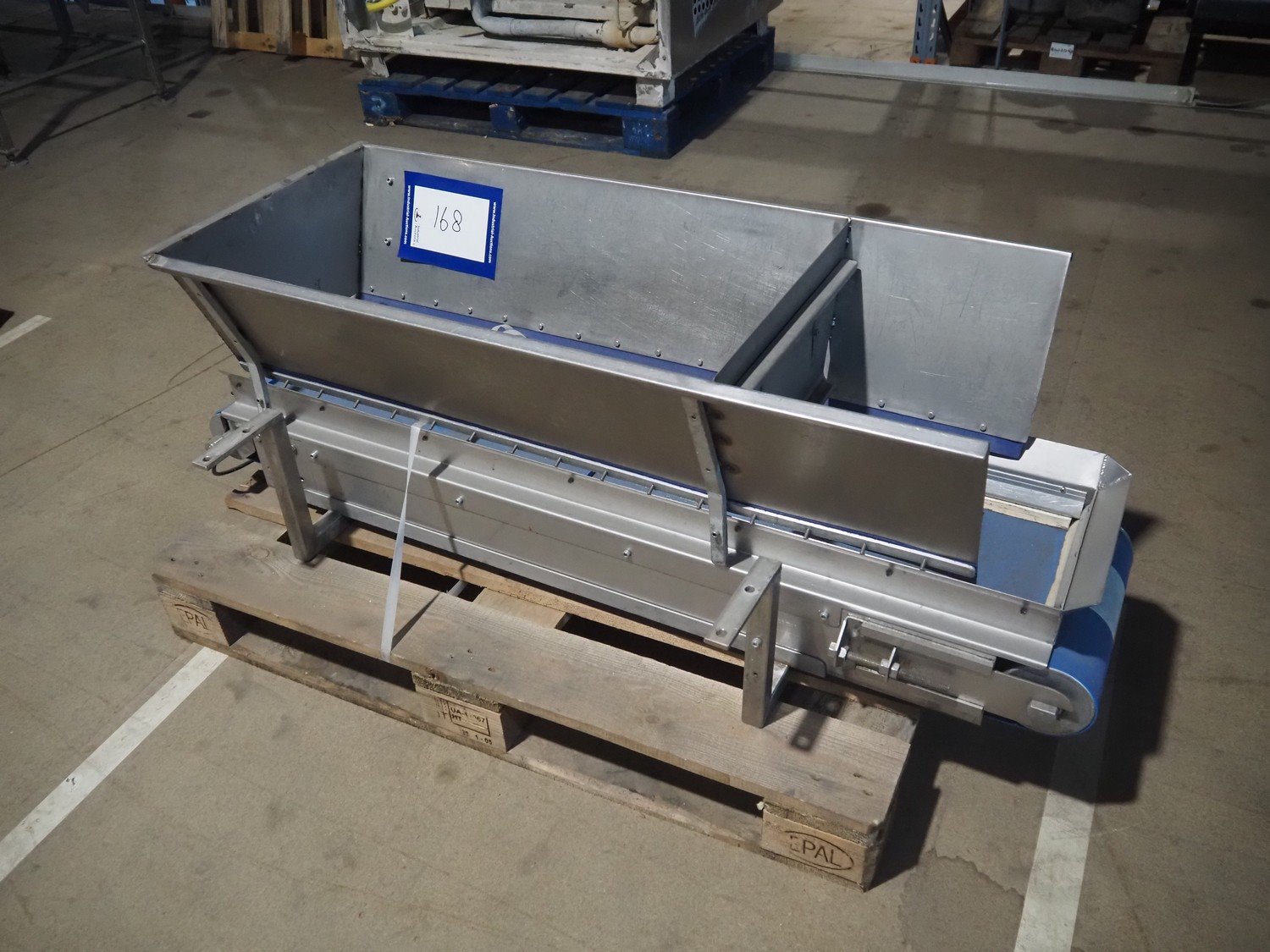 Transport belt, s/s frame, plastic belt, belt width: 290 mm, total dimensions: 1500 mm x 600 mm x 500 mm.