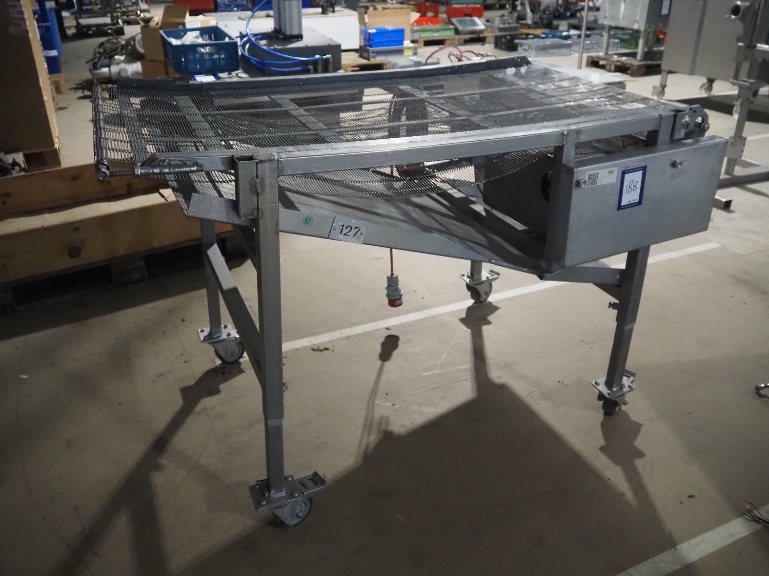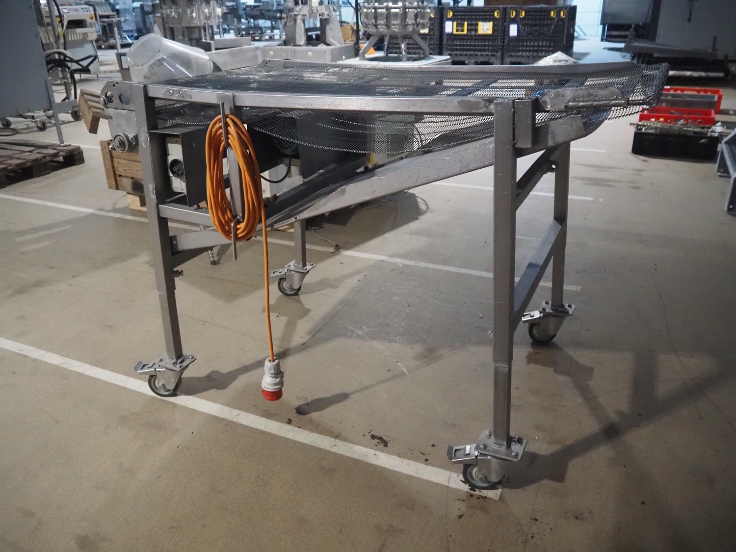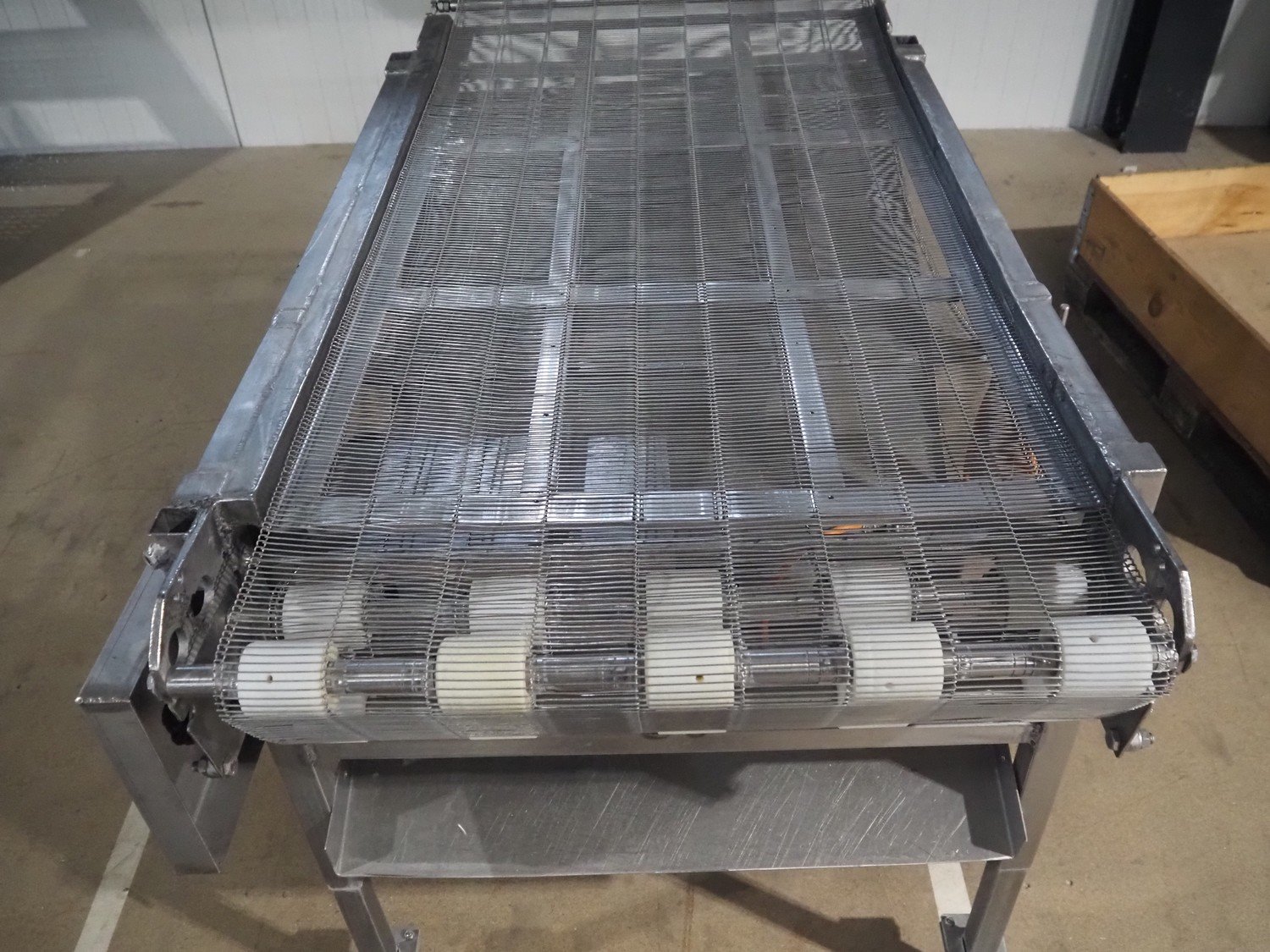 Mobile mesh belt, s/s frame, belt width: 700 mm, total dimensions: 1450 mm x 880 mm x 950 mm.