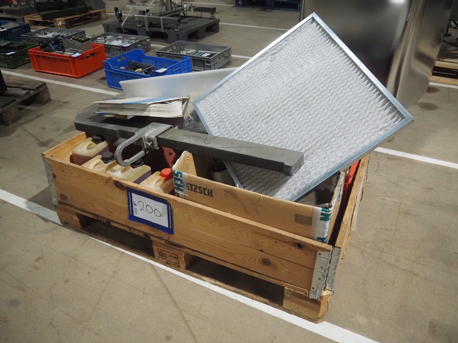 Pallet with machine parts, dimensions: 1200 mm x 800 mm x 550 mm.