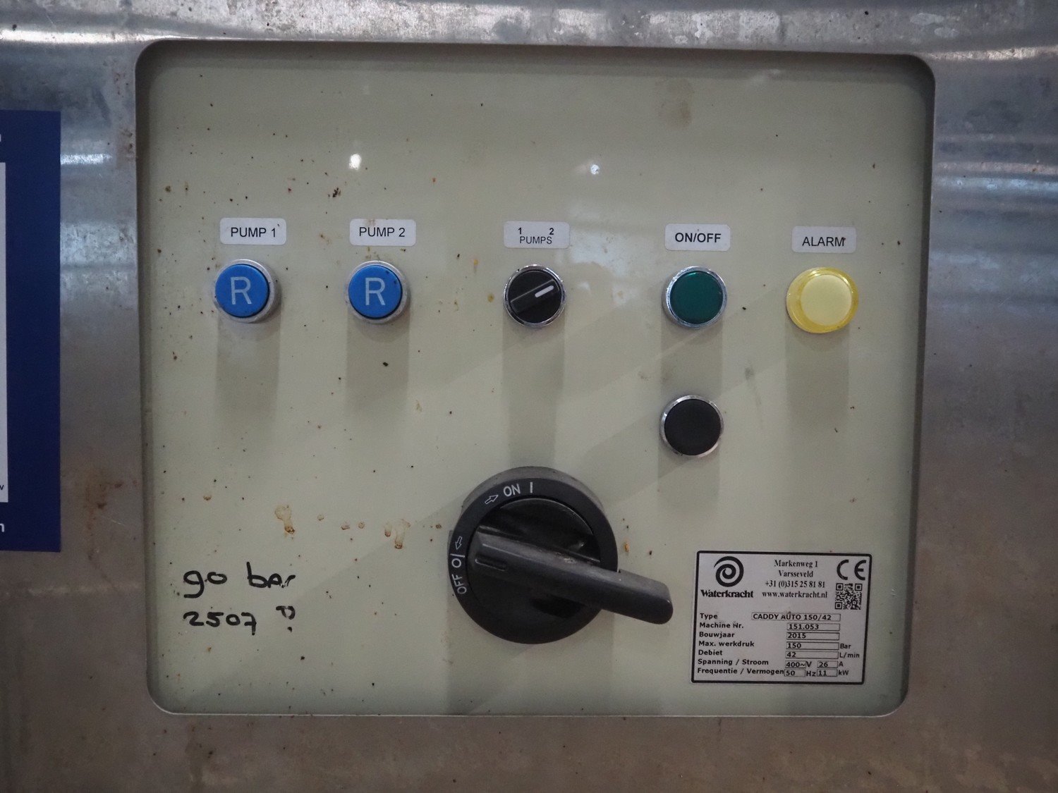 Waterkracht stationary high-pressure installation, type: CADDY AUTO 150/42, machine number: 151.053, year of construction: 2015, 400 V, 3 Ph, 50 Hz, 26 A, 11 kW, capacity: 42 l/min, dimensions: 900 mm x 470 mm x 1530 mm.