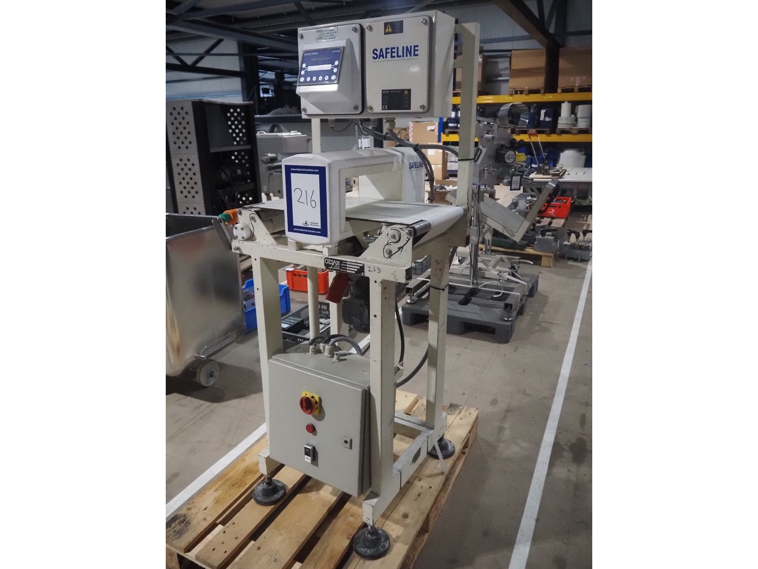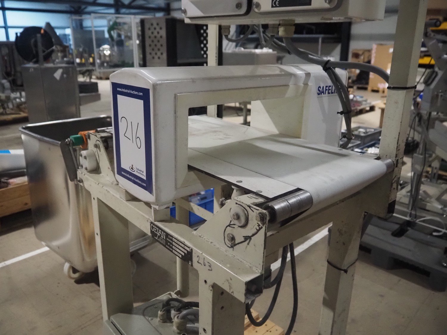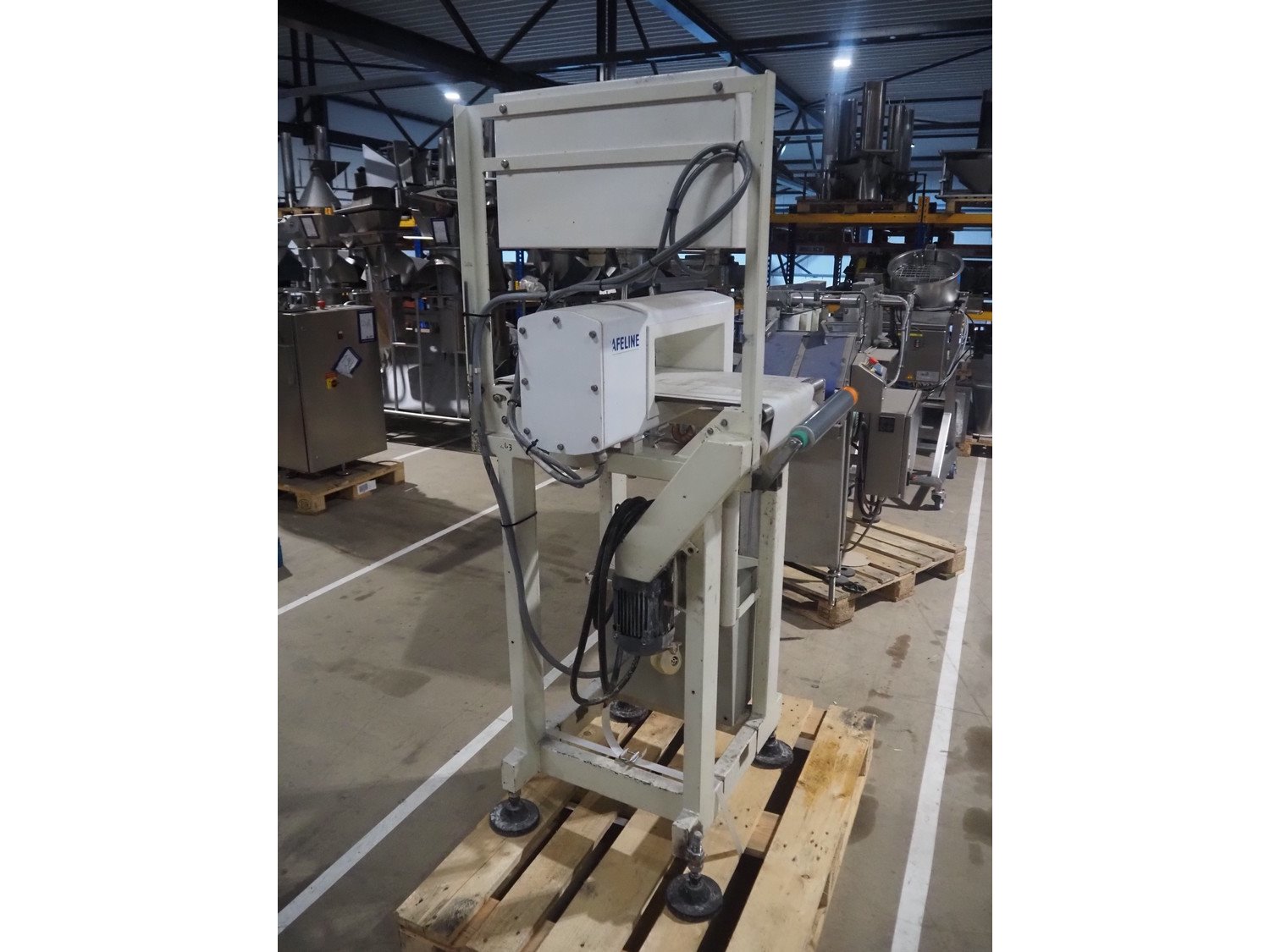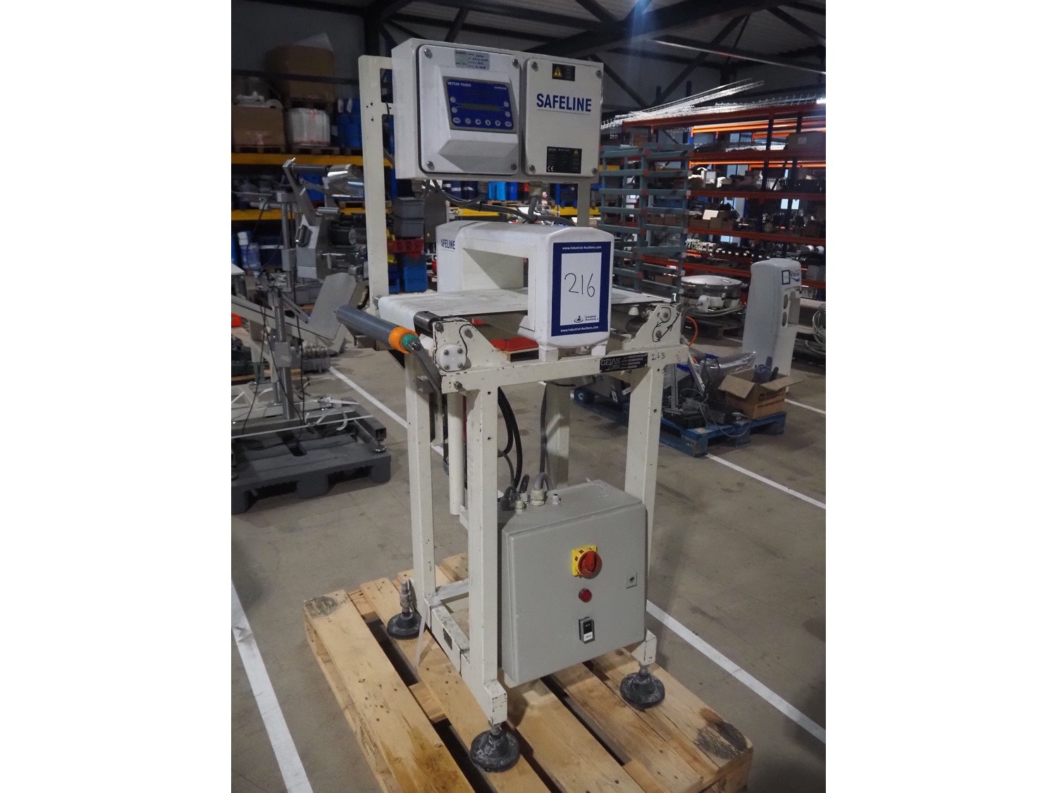 Safeline metal detector, serial number: 119579, plastic belt, belt width: 250 mm, clearance: 350 mm x 110 mm, total dimensions: 700 mm x 650 mm x 1600 mm.