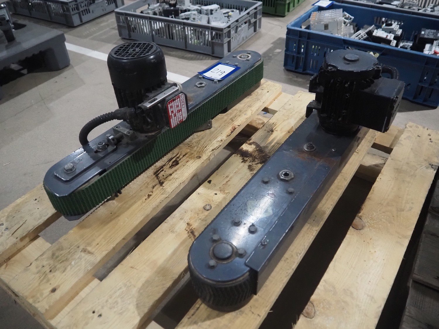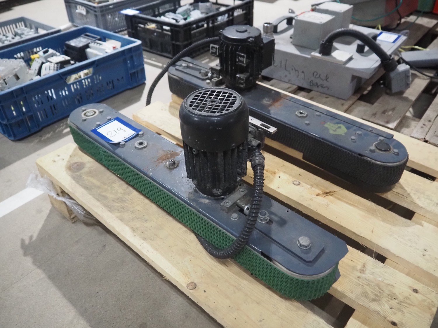 2 conveyors for box closing machine, belt width: 50 mm, total dimensions: (2x) 700 mm x 150 mm x 250 mm.