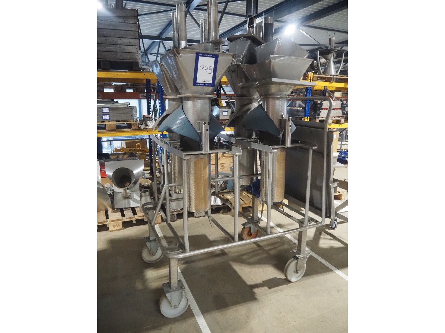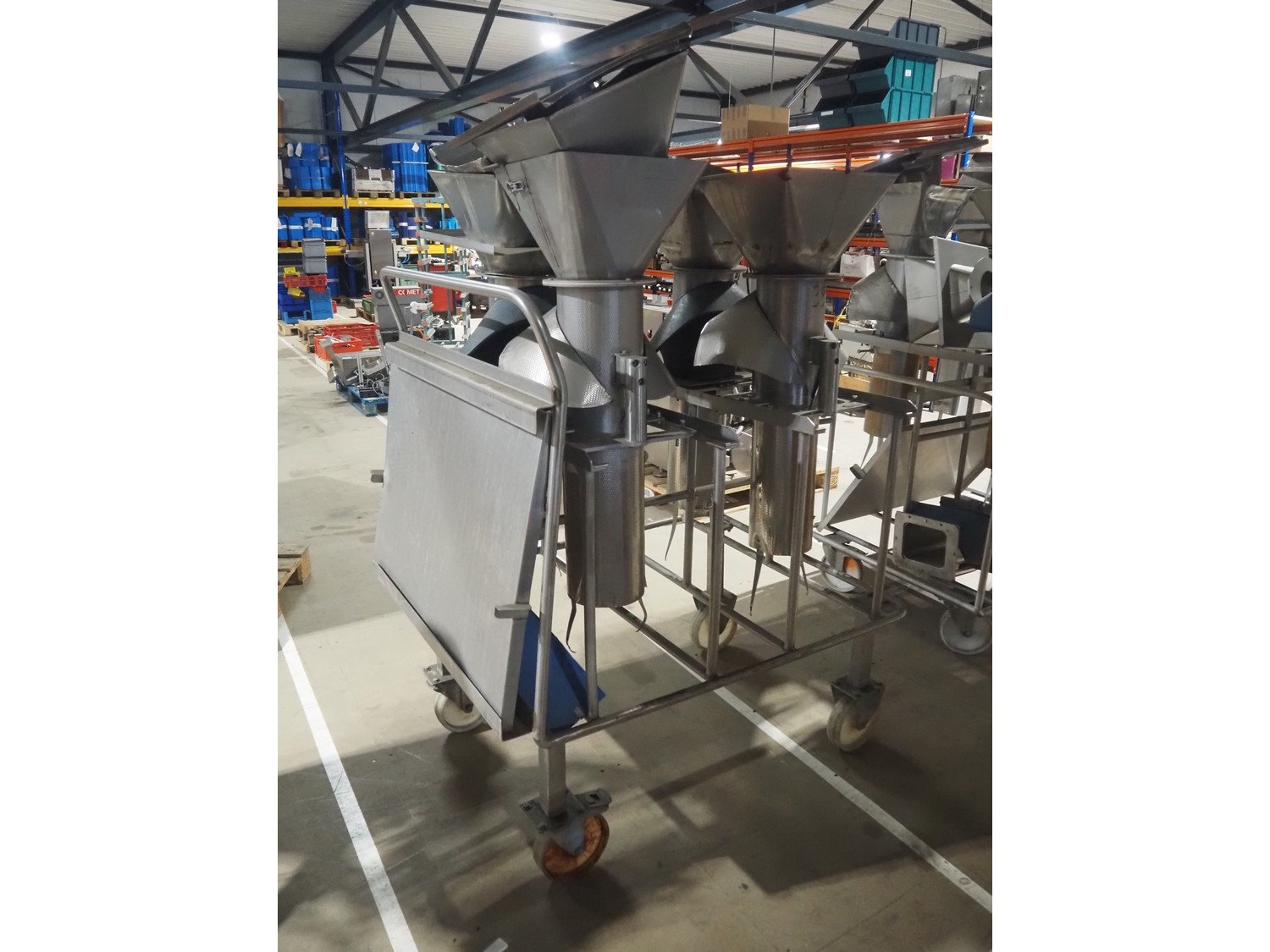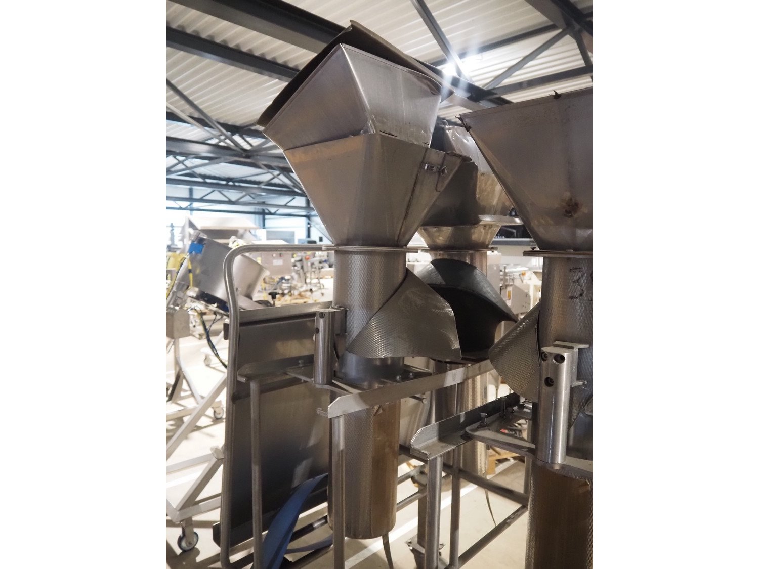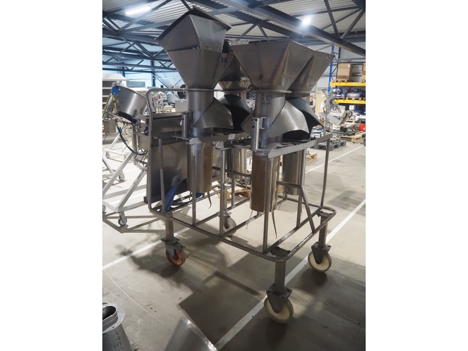 S/s trolley with 4 s/s filling pipes for GEA SX 400 vertical bag form, fill, and sealing machine, pipe dimensions: (4x) Ø 185 mm x 1050 mm, total dimensions: 1300 mm x 1000 mm x 1900 mm.