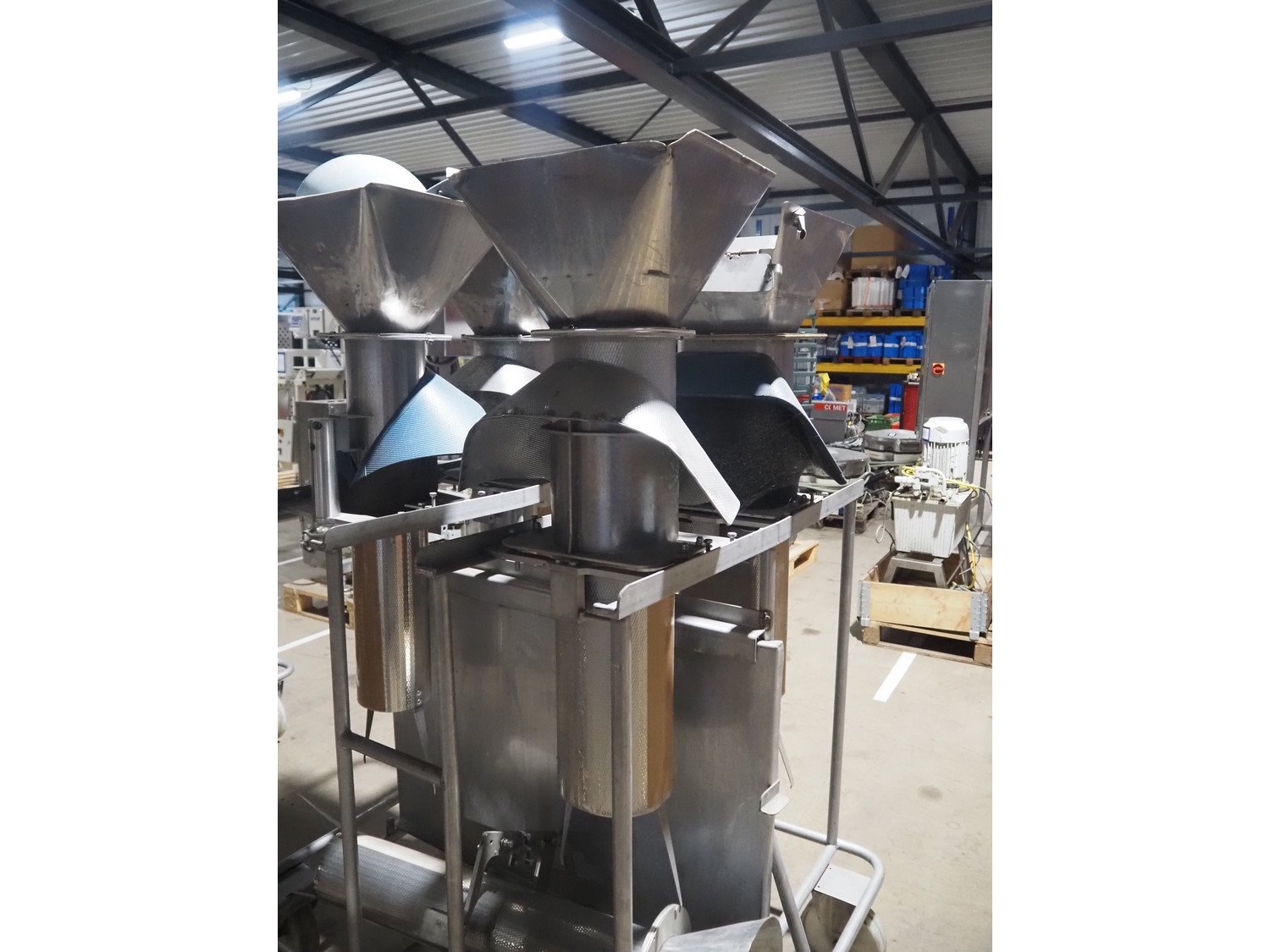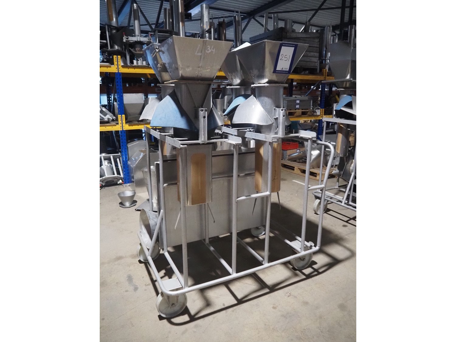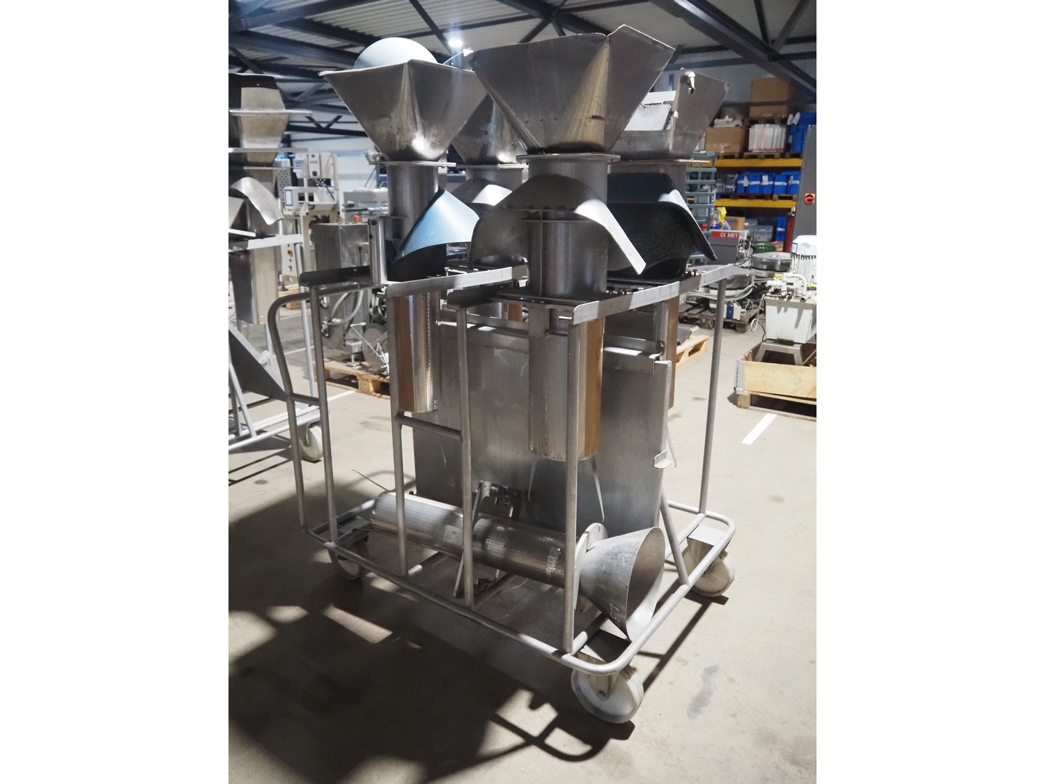 S/s trolley with 4 s/s filling pipes for GEA SX 400 vertical bag form, fill, and sealing machine, pipe dimensions: (2x) Ø 200 mm x 1000 mm, (1x) Ø 150 mm x 1000, (1x) 210 mm x 160 mm x 1000 mm, total dimensions: 1300 mm x 1000 mm x 1900 mm.