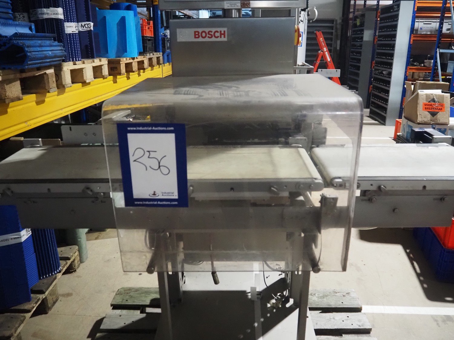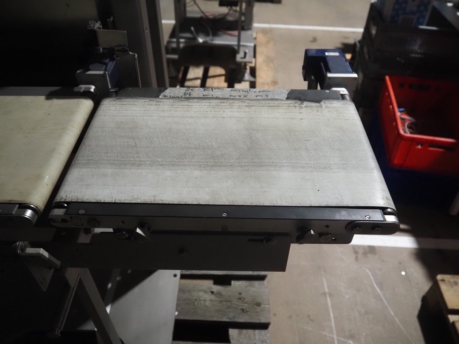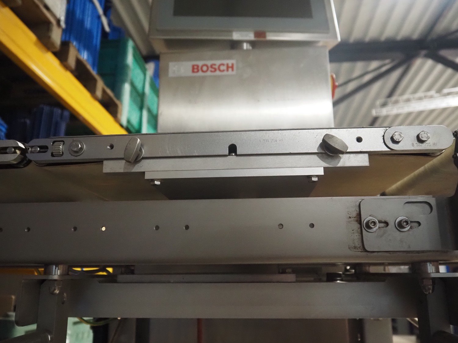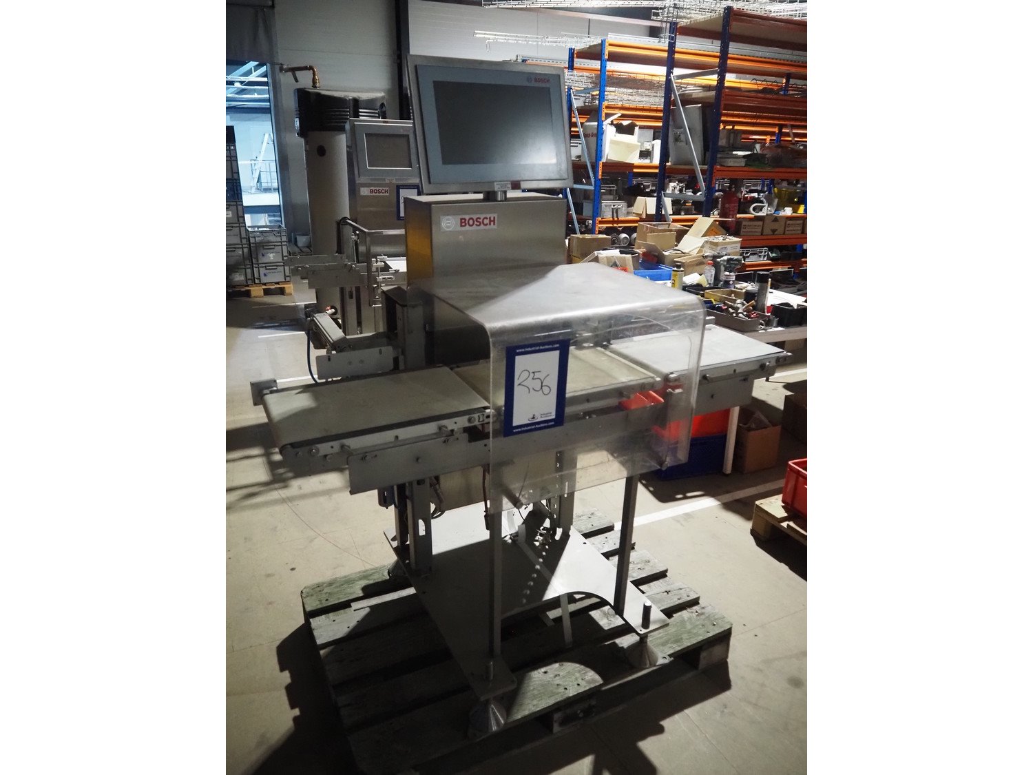 Bosch checkweigher, type: KWE 6000 A, serial number: 732379, year of construction: 2017, 230 V, 50 Hz, 24 VDC, max: 800 gram, min: 100 gram, e= 0.5 gram, plastic belt, belt width: 250 mm, total dimensions: 1200 mm x 800 mm x 1700 mm.