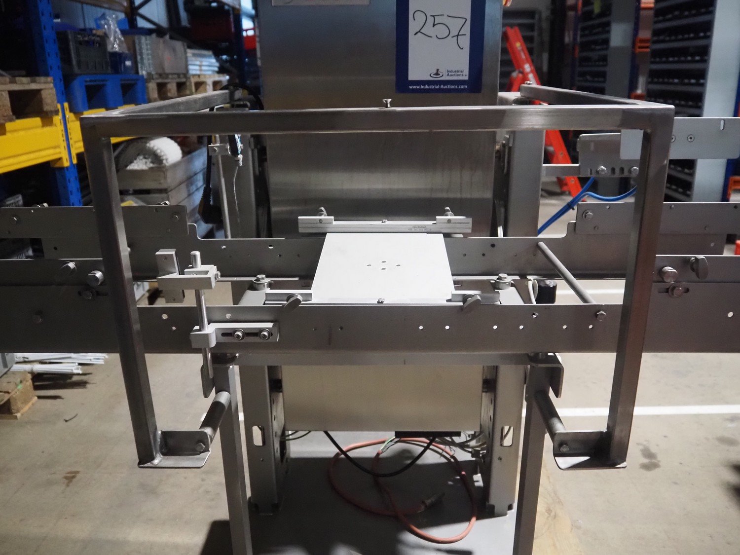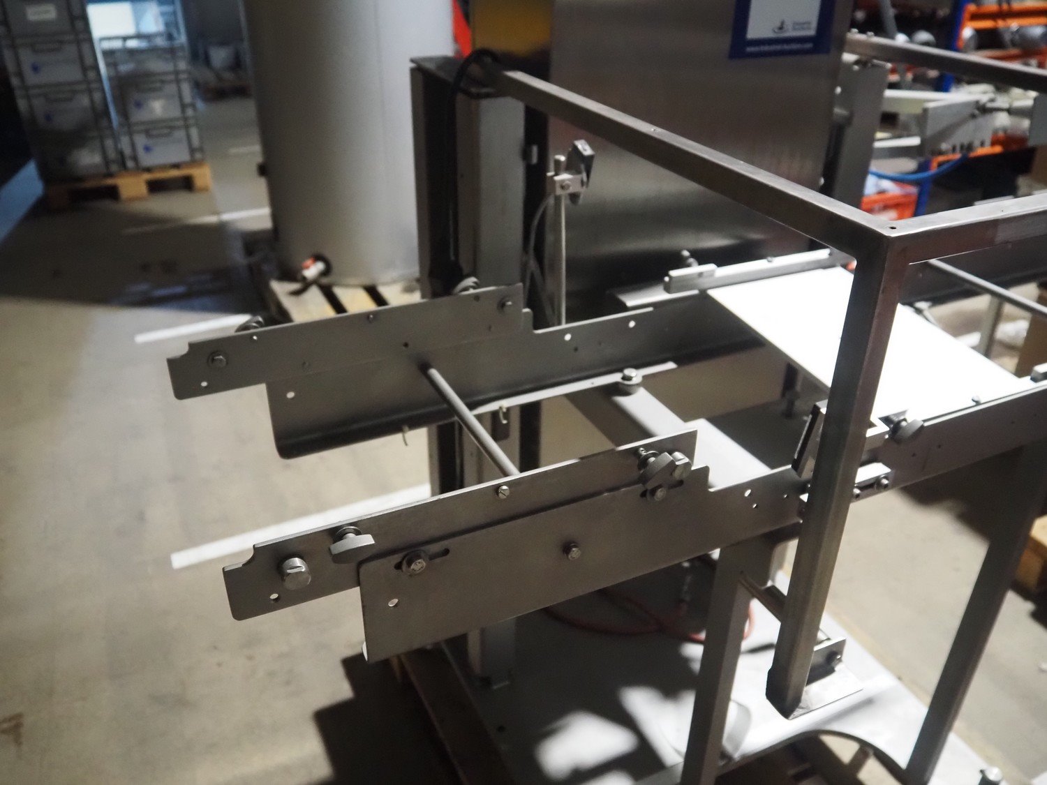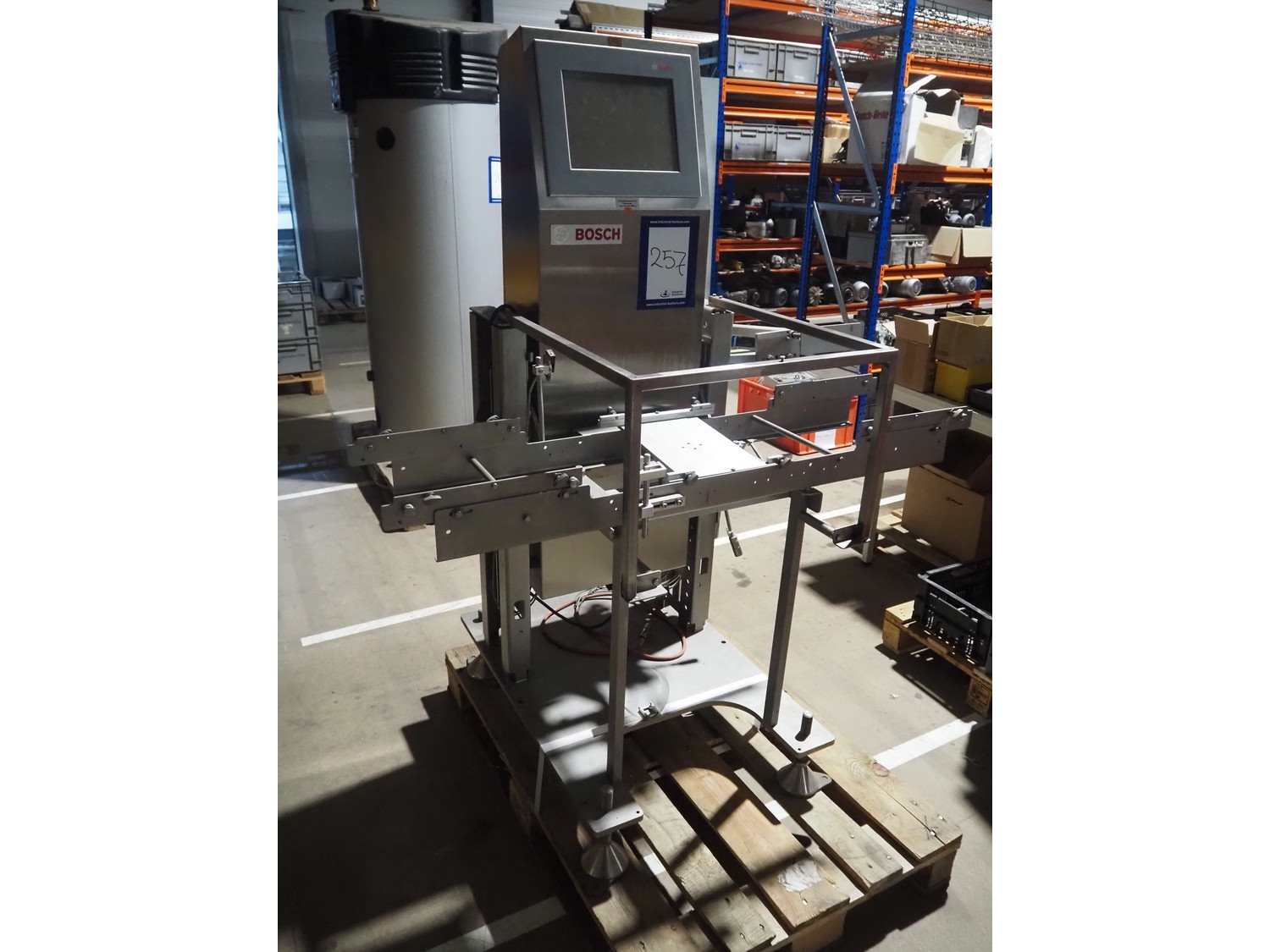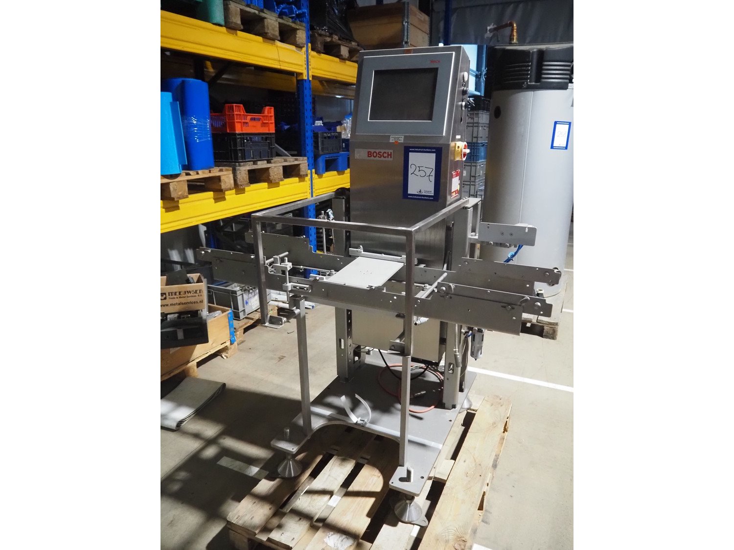Bosch checkweigher, type: KWE 6000 A, year of construction: 2014, 230 V, 50 Hz, maximum weight: 600 gram, minimum weight: 100 gram, e=d= 0.5 gram, plastic belt, belt width: 250 mm, total dimensions: 1350 mm x 760 mm x 1350 mm. Incomplete.