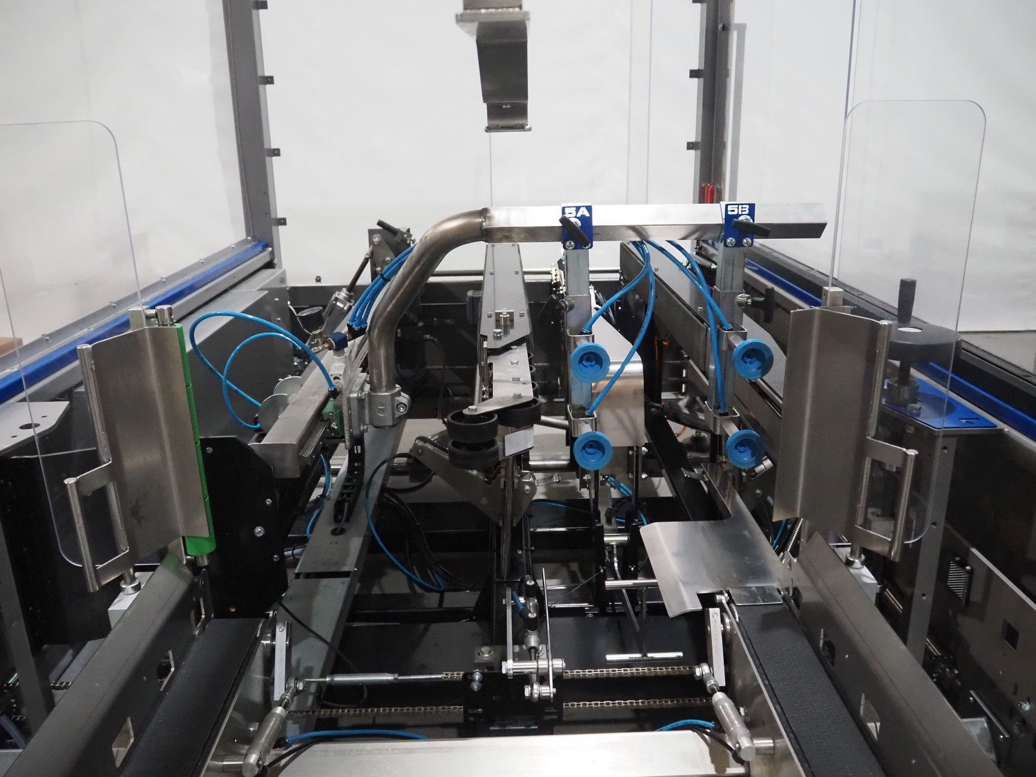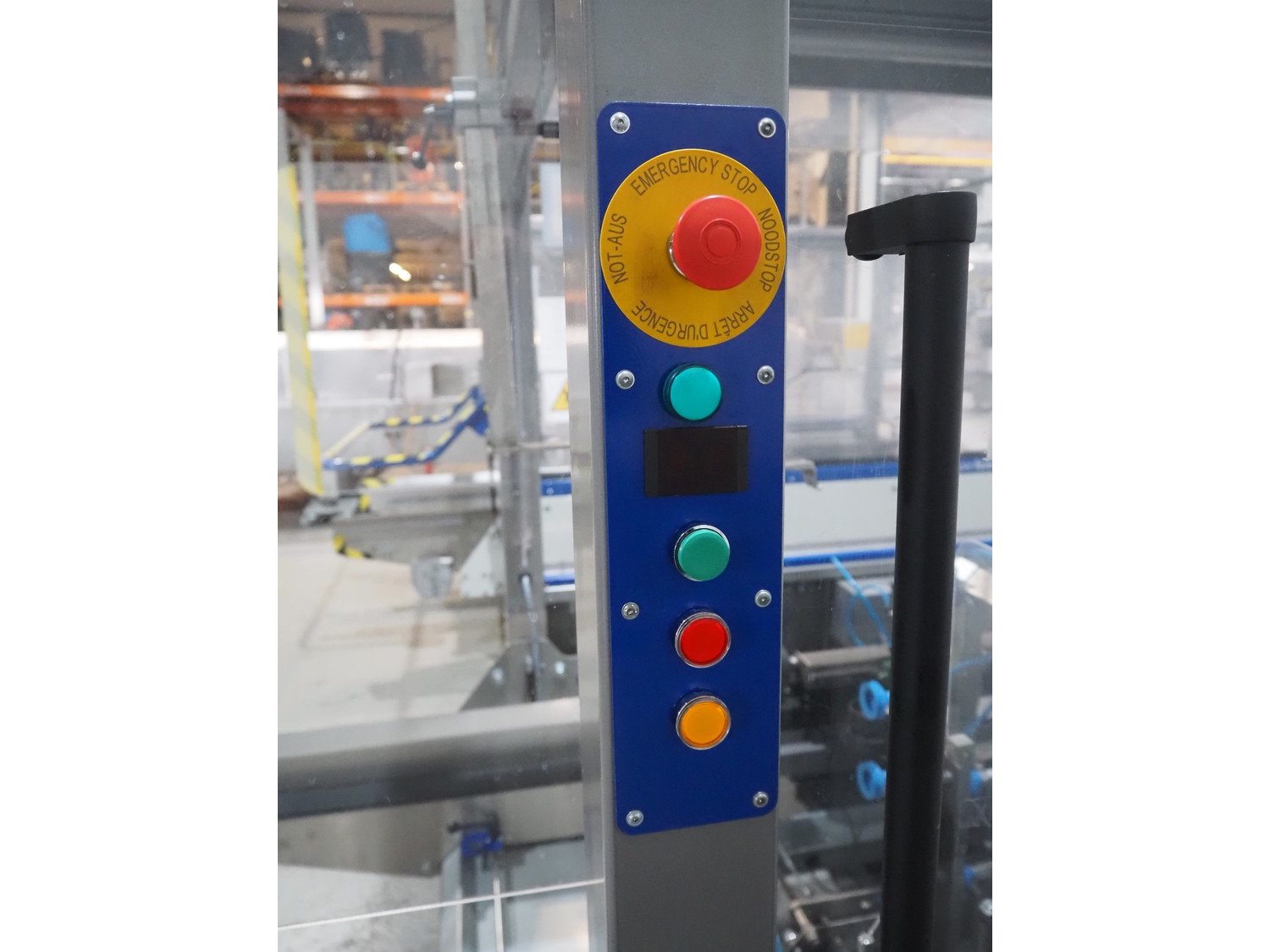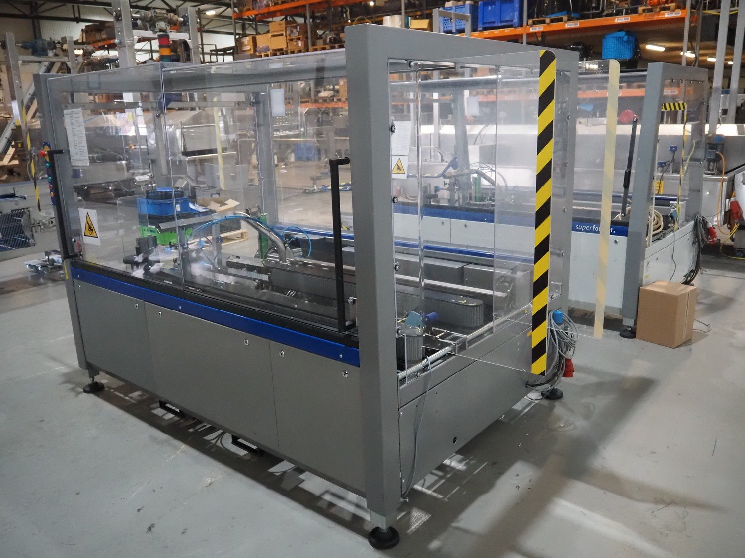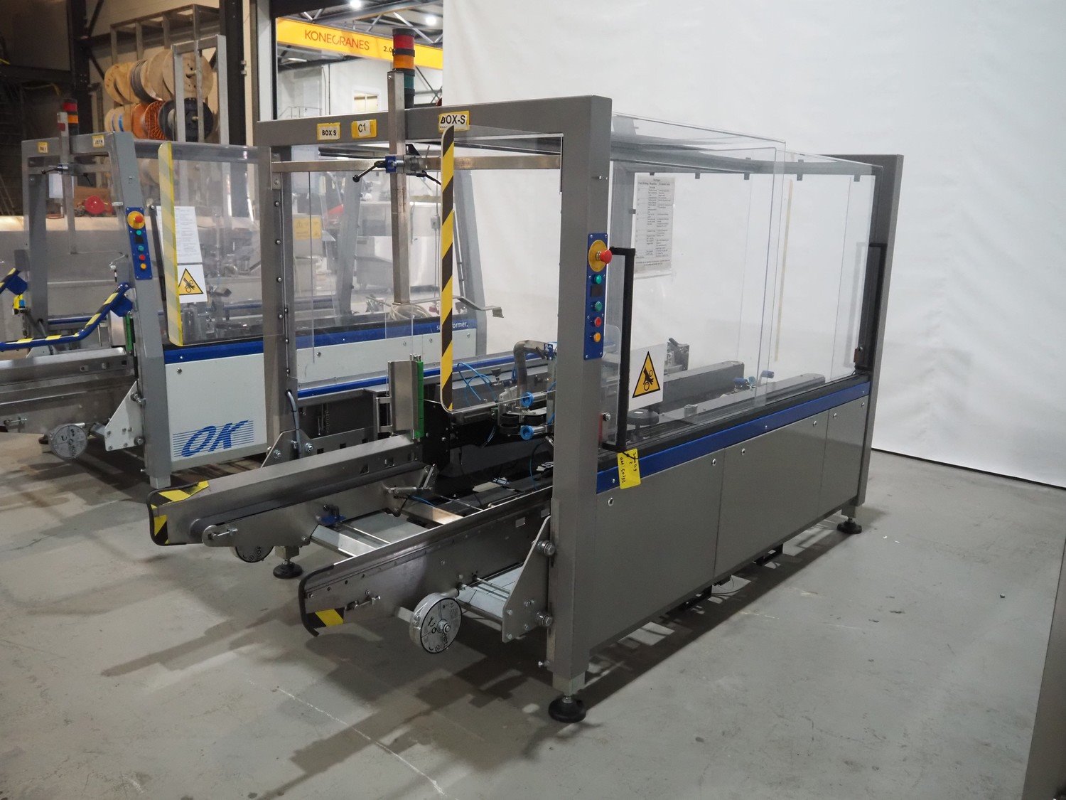 O/K Packaging Systems bv case erector, type: Superformer-1, serial number: 10-21790, year of construction: 2010, 400 V, 3 Ph, 50 Hz, 10 A, weight: 1200 kg, maximum box width: 350 mm, plastic belts, belt width: (2x) 95 mm, total dimensions: 3750 mm x 1700 mm x 2130 mm.