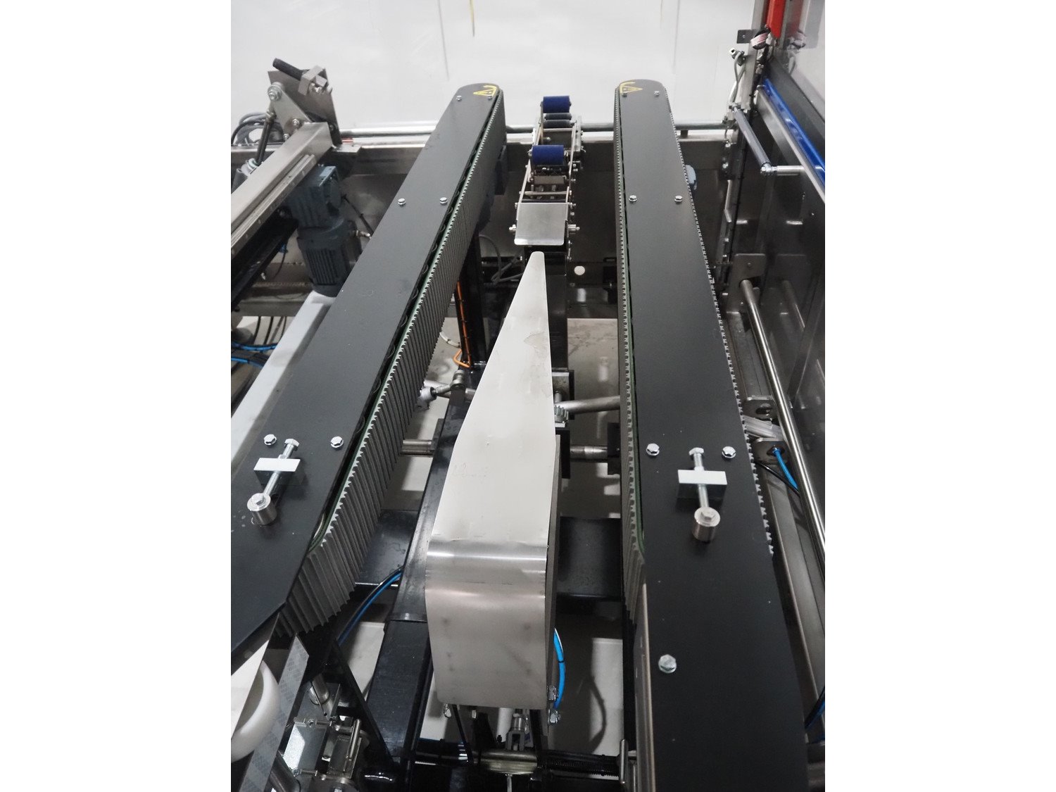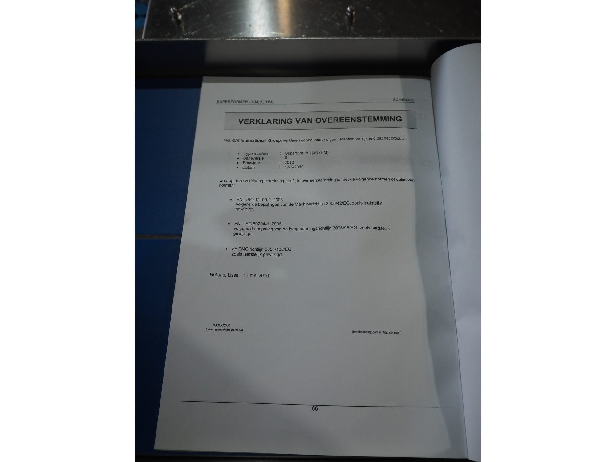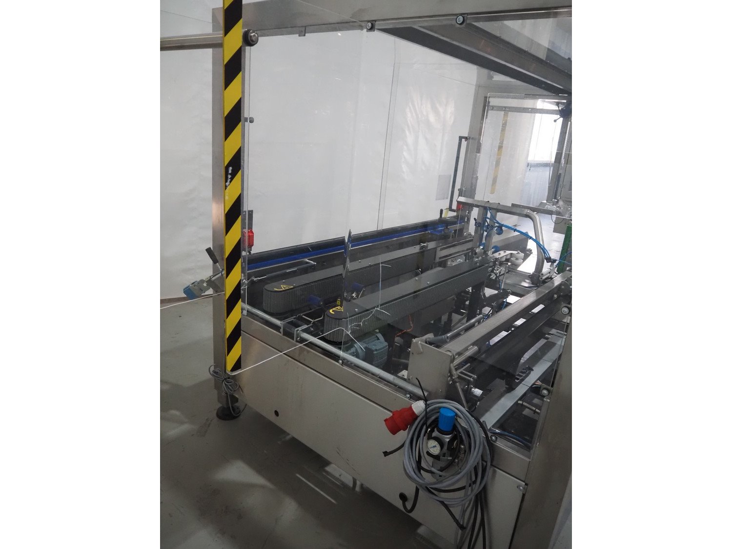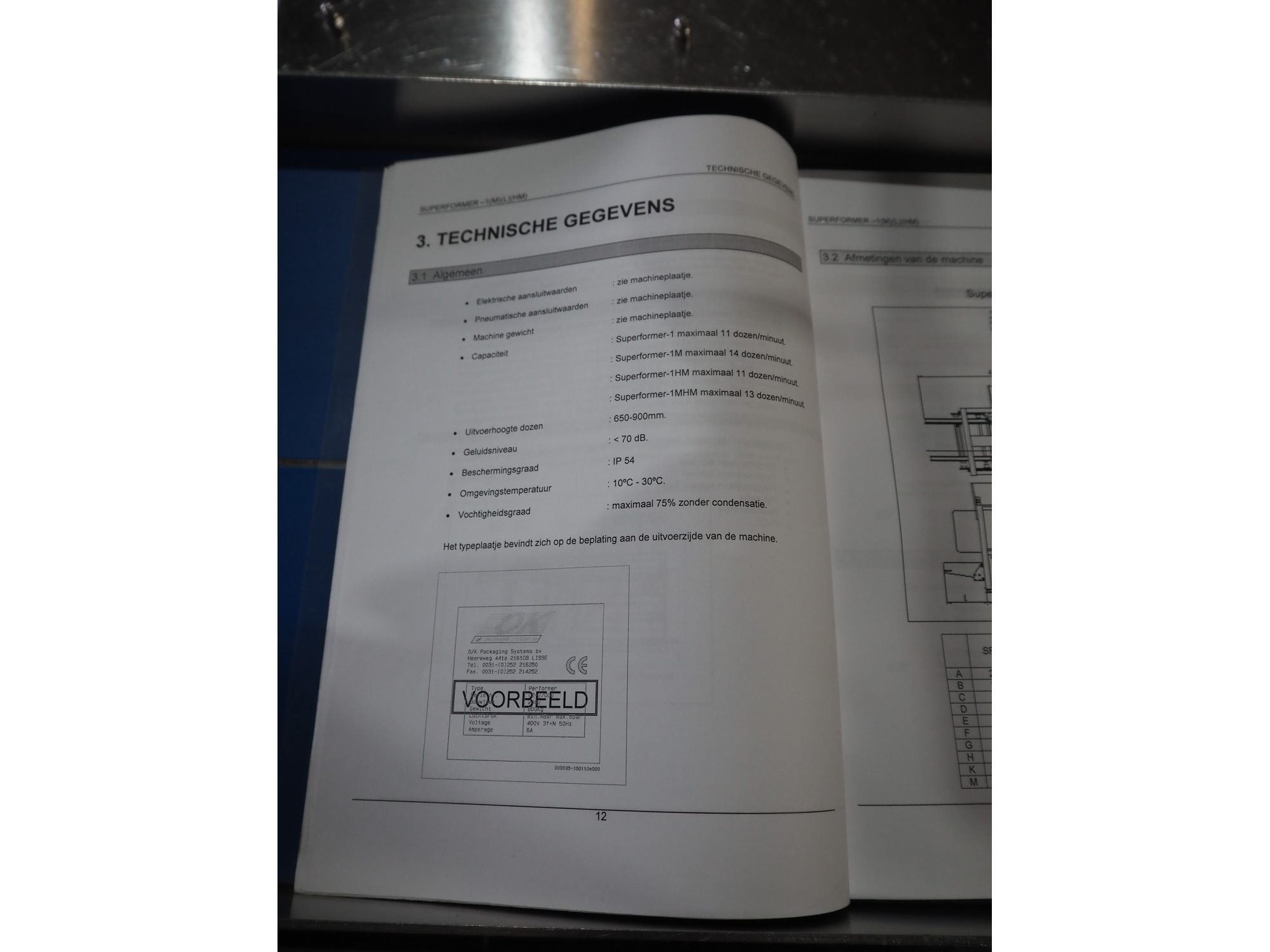 O/K Packaging Systems bv case erector, type: Superformer-1, serial number: 16-22018, year of construction: 2016, 400 V, 3 Ph, 50 Hz, 10 A, weight: 1200 kg, plastic belts, belt width: (2x) 95 mm, total dimensions: 3750 mm x 1700 mm x 2130 mm.
