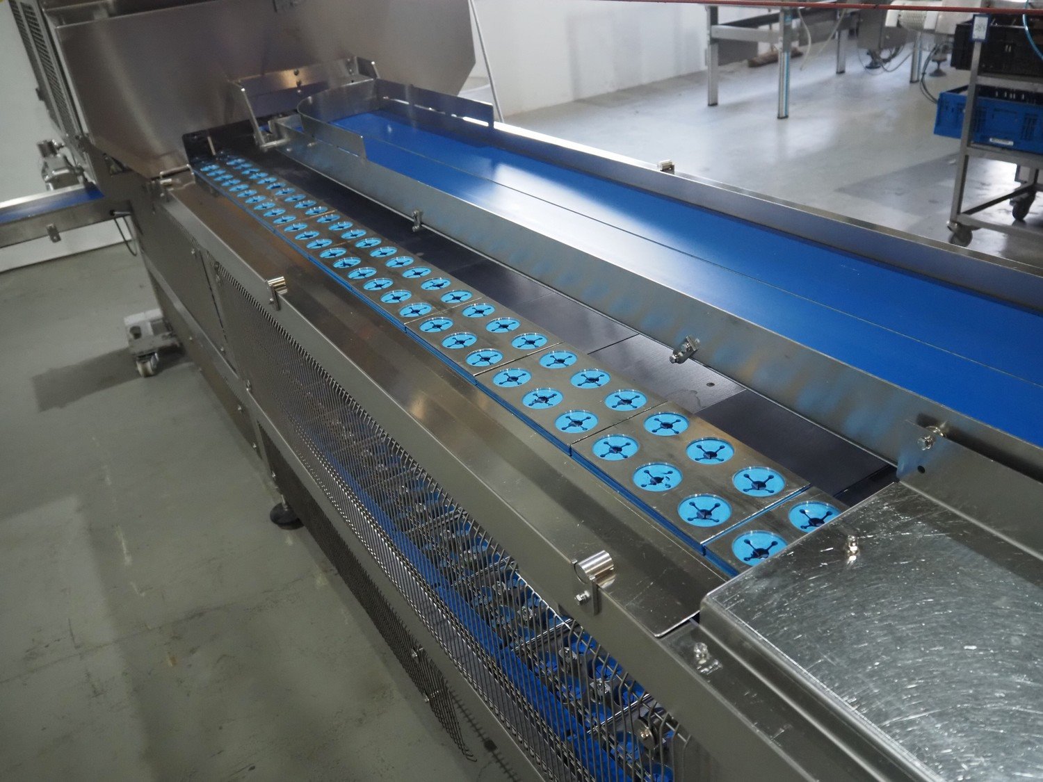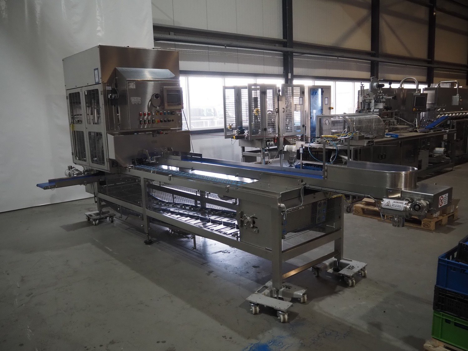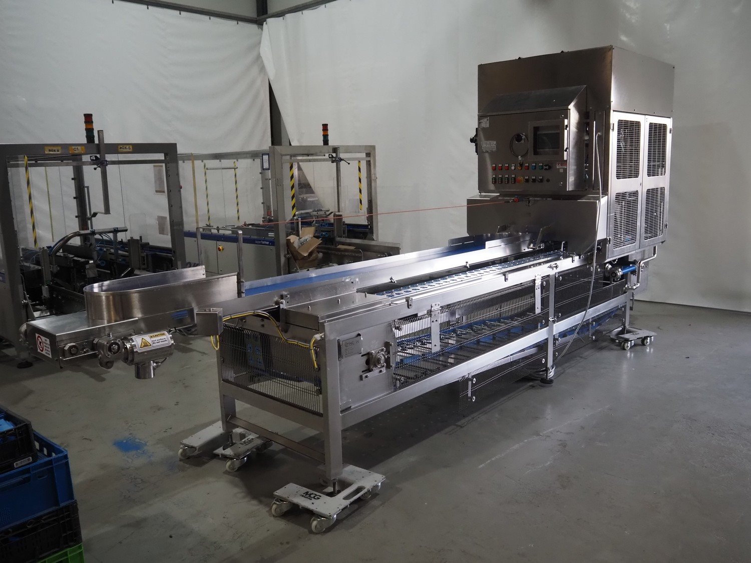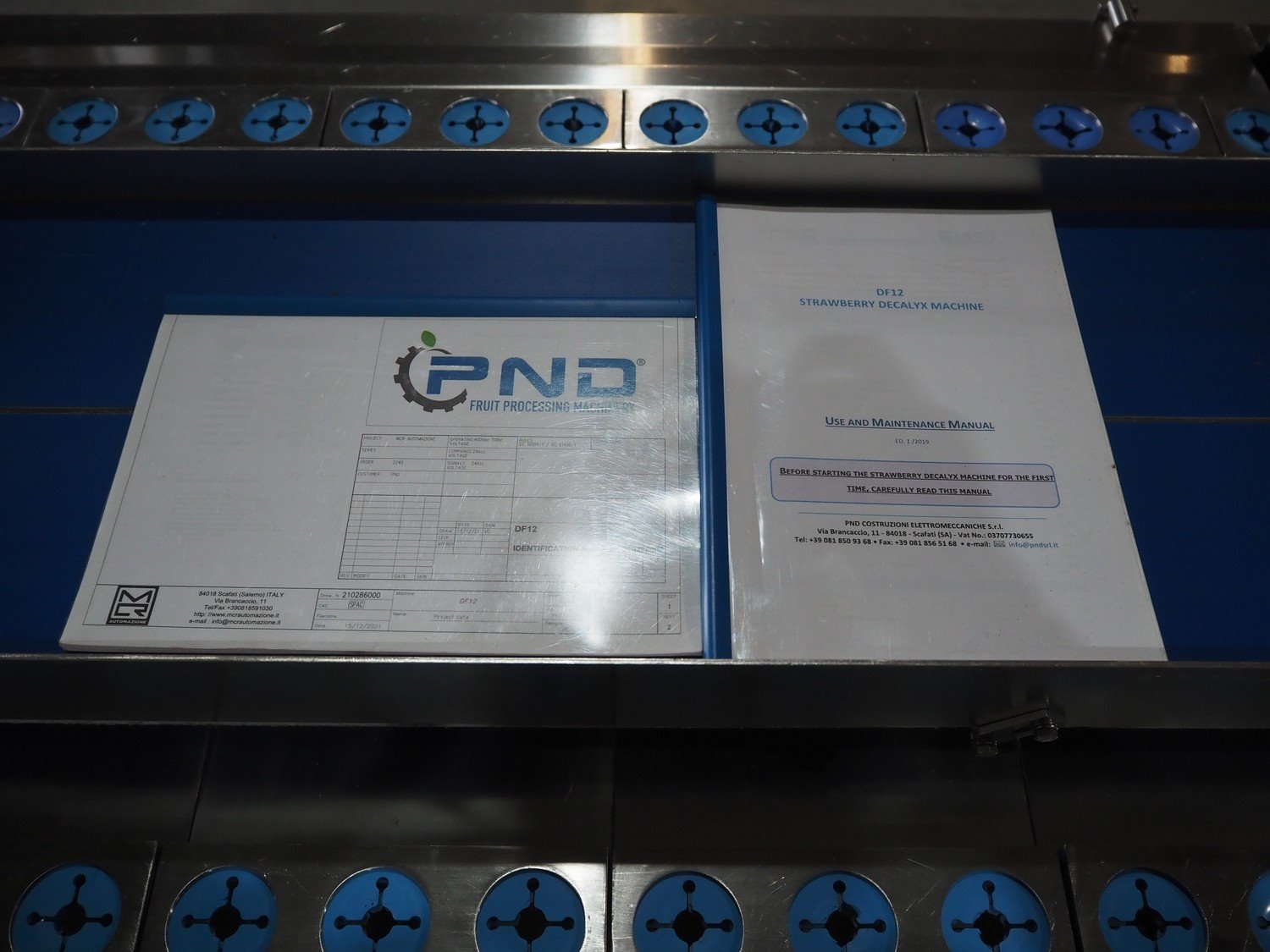 M.C.R. Automazione SRL strawberry de-crowning and slicing machine, model: DF12, number: 220159000, year of construction: 06/2022, 400 V, 3 Ph, 50 Hz, 6 A, 3.5 kW, plastic infeed belt, belt width: 305 mm, clearance: Ø 50 mm, plastic outfeed belt, belt width: 305 mm, total dimensions: 5500 mm x 1900 mm x 2450 mm. Including pallet with parts, without rollies.
