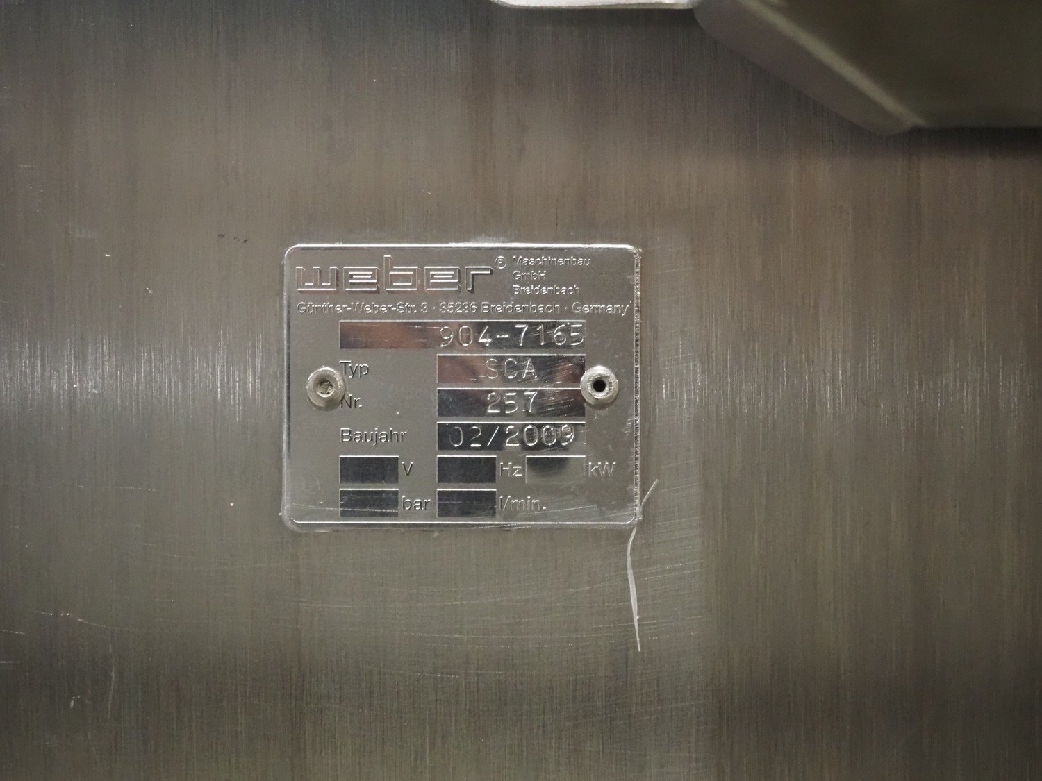 Weber slicer line, consisting of: Weber pre scanner for slicer, type: SCA, number: 257, year of construction: 02/2009, plastic belt, belt width: 500 mm, total dimensions: 1550 mm x 1050 mm x 2050 mm. Weber slicer, type: SLC 904, number: 7165, year of construction: 03/2009, 400 V, 50 Hz, 10 kW, 6 bar, plastic infeed belt, belt width: (2x) 450 mm, plastic wire outfeed belt, belt width: 350 mm, total dimensions: 4200 mm x 1900 mm x 2550 mm. Weber checkweigher, type: CCW, number: 7165, plastic wire belt, belt width: 190 mm, total dimensions: 950 mm x 600 mm x 1200 mm. Weber rejector belt, type: CCR, number: 7165, year of construction: 02/2009, plastic wire belt, belt width: 190 mm, total dimensions: 950 mm x 500 mm x 1200 mm. Weber buffer belt, type: CCO, number: 7165, year of construction: 03/2009, plastic belt belt width: 500 mm, total dimensions: 1050 mm x 560 mm x 1420 mm. Weber buffer belt, type: CEB, number: 101-7165, year of construction: 2009, 400 V, 50 Hz, 4 kW, plastic belts, belt width: (3x) 500 mm, plastic wire belts, belt width: 300 mm, total dimensions: 3100 mm x 1000 mm x 1350 mm.