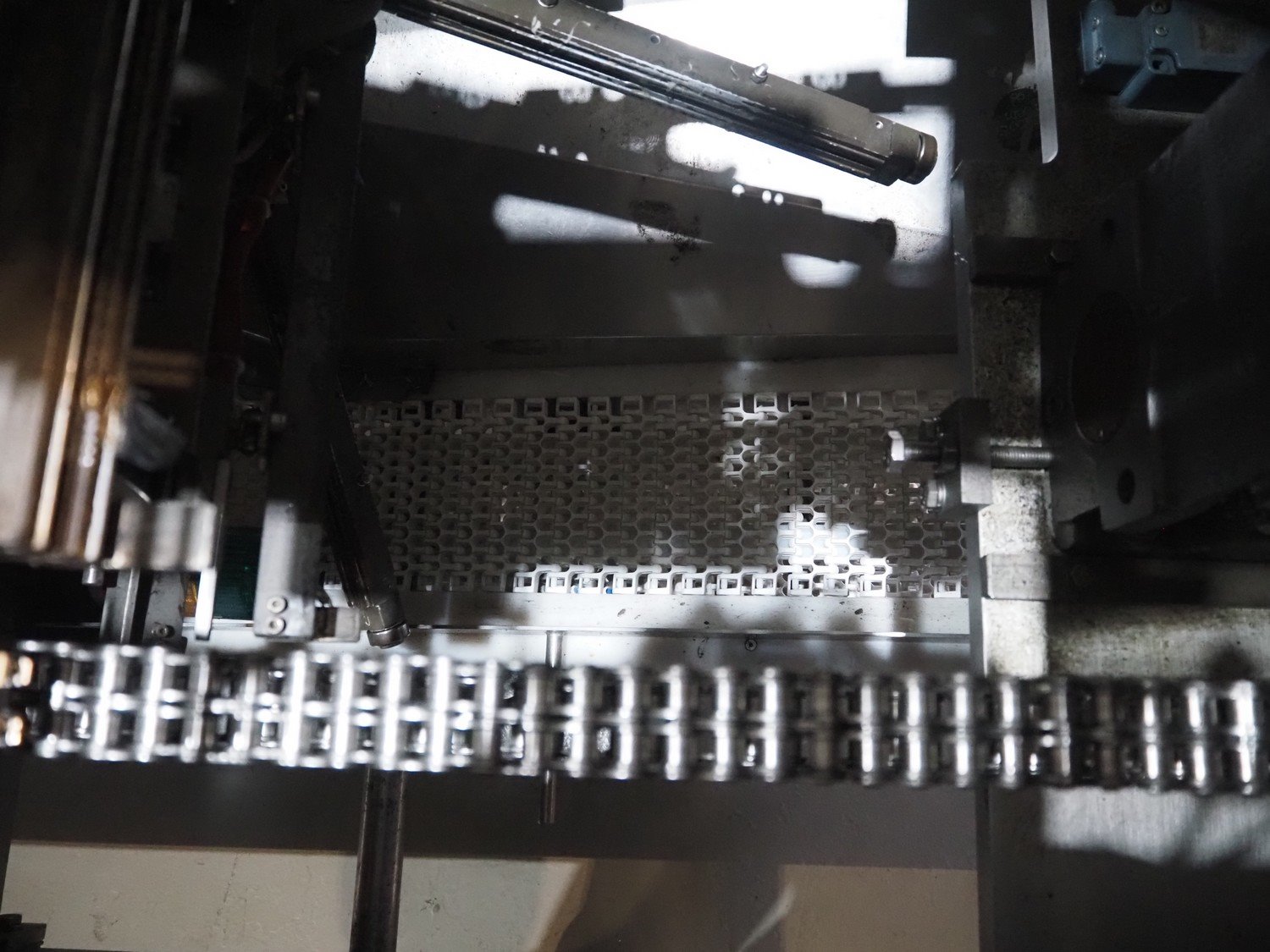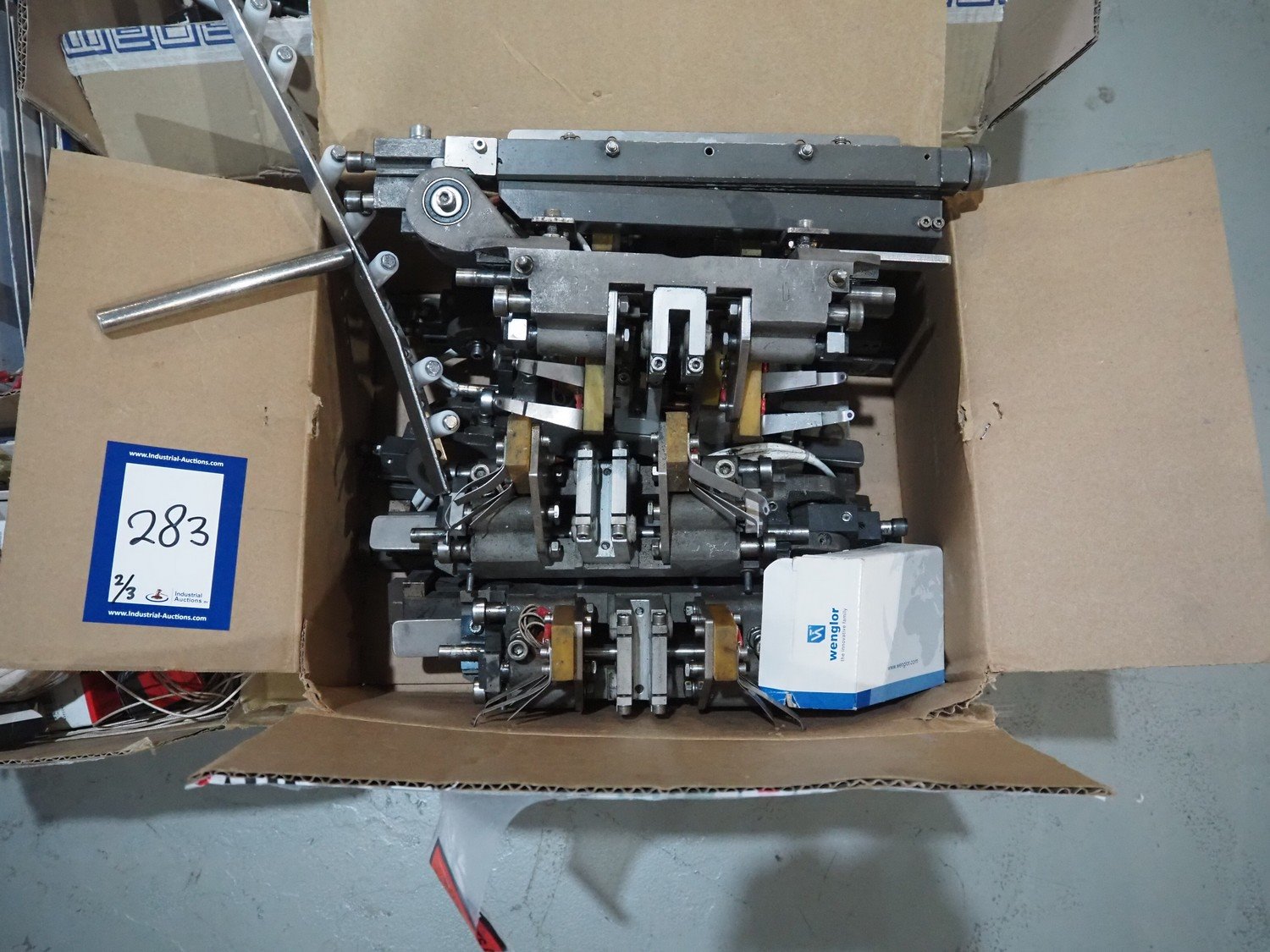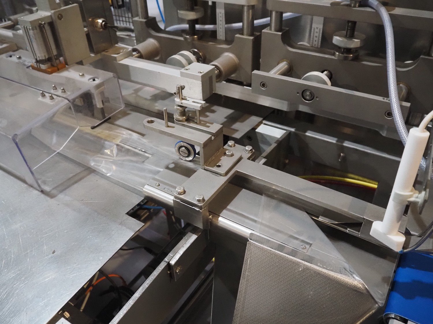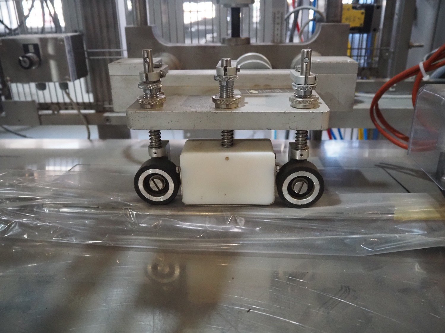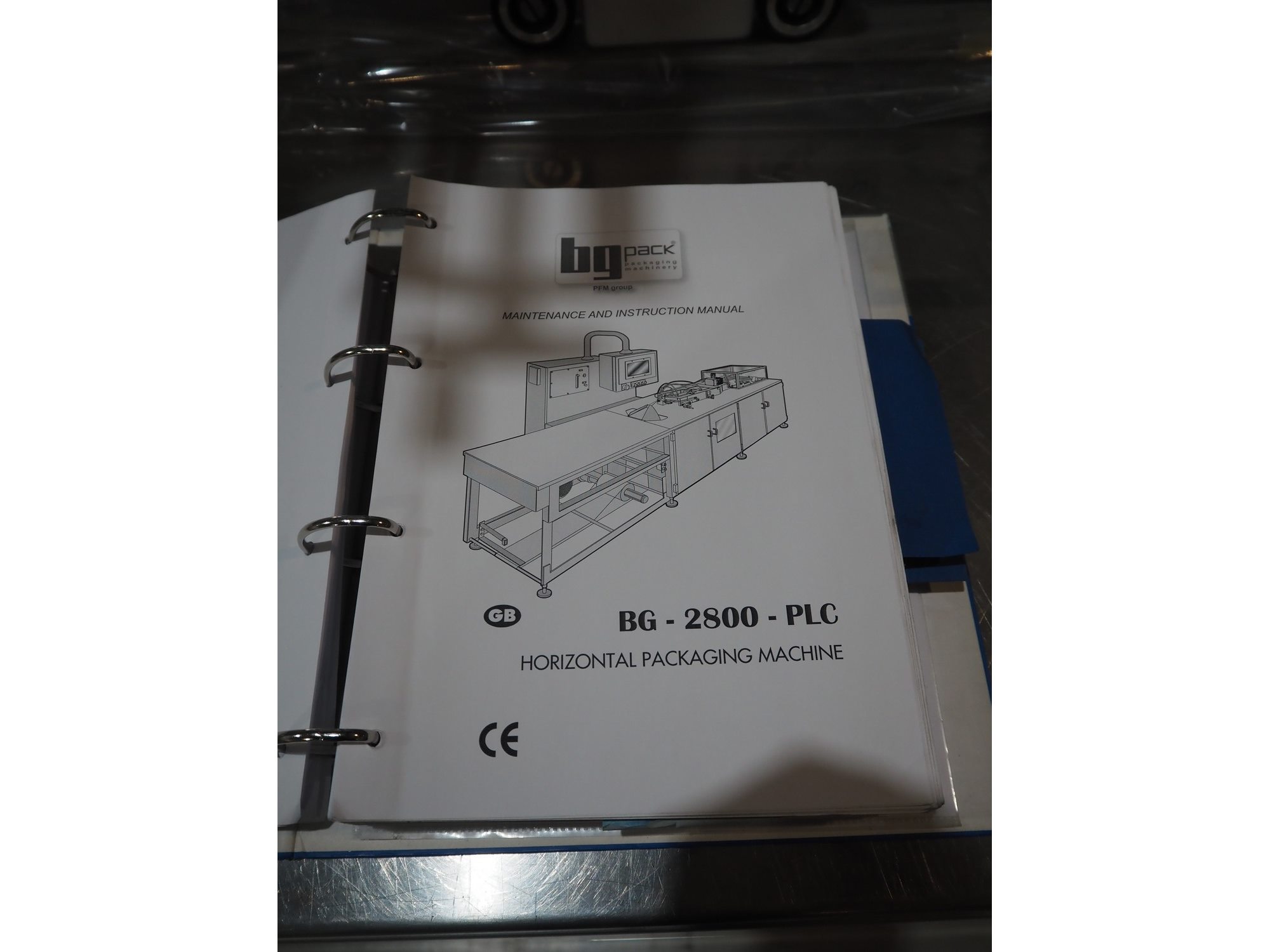 BG Pack SpA flowpacker with labelling machine, model: BG2800 EWL210-Left, serial number: 99404, year of construction: 2011, 400 V, 50 Hz, 32 A, 10 kW, plastic belt, belt width: 150 mm, film width: 400 mm, total dimensions: 4600 mm x 1450 mm x 2300 mm. Including s/s trolley with parts and pallet with parts, dimensions trolley: 1100 mm x 600 mm x 1150 mm.