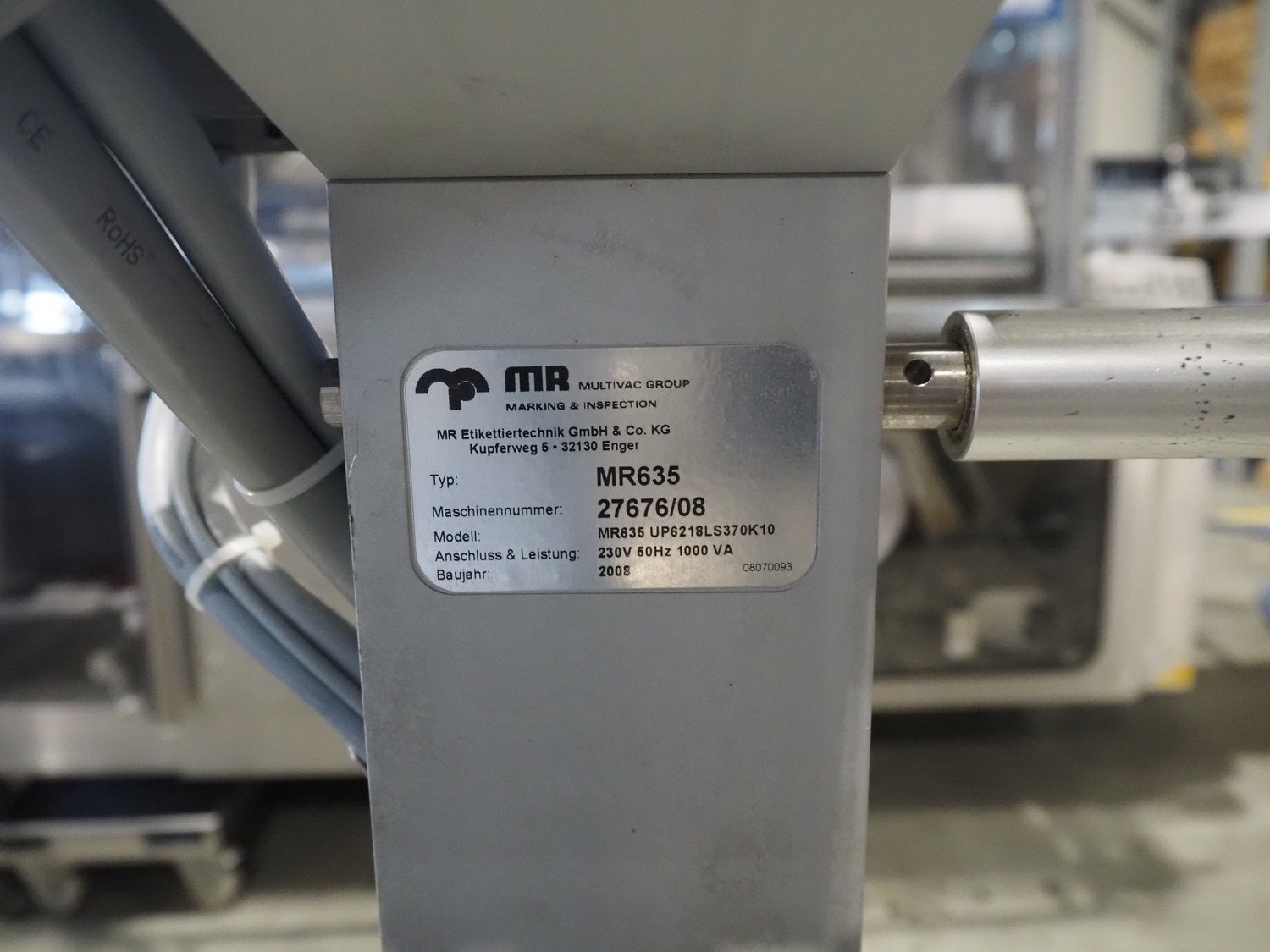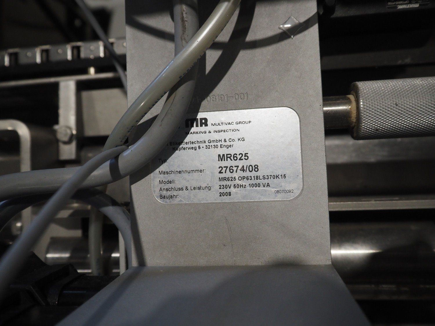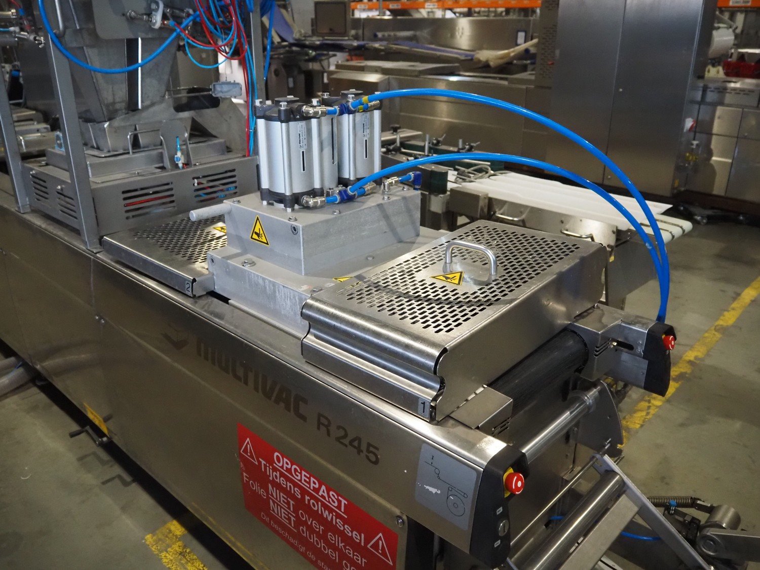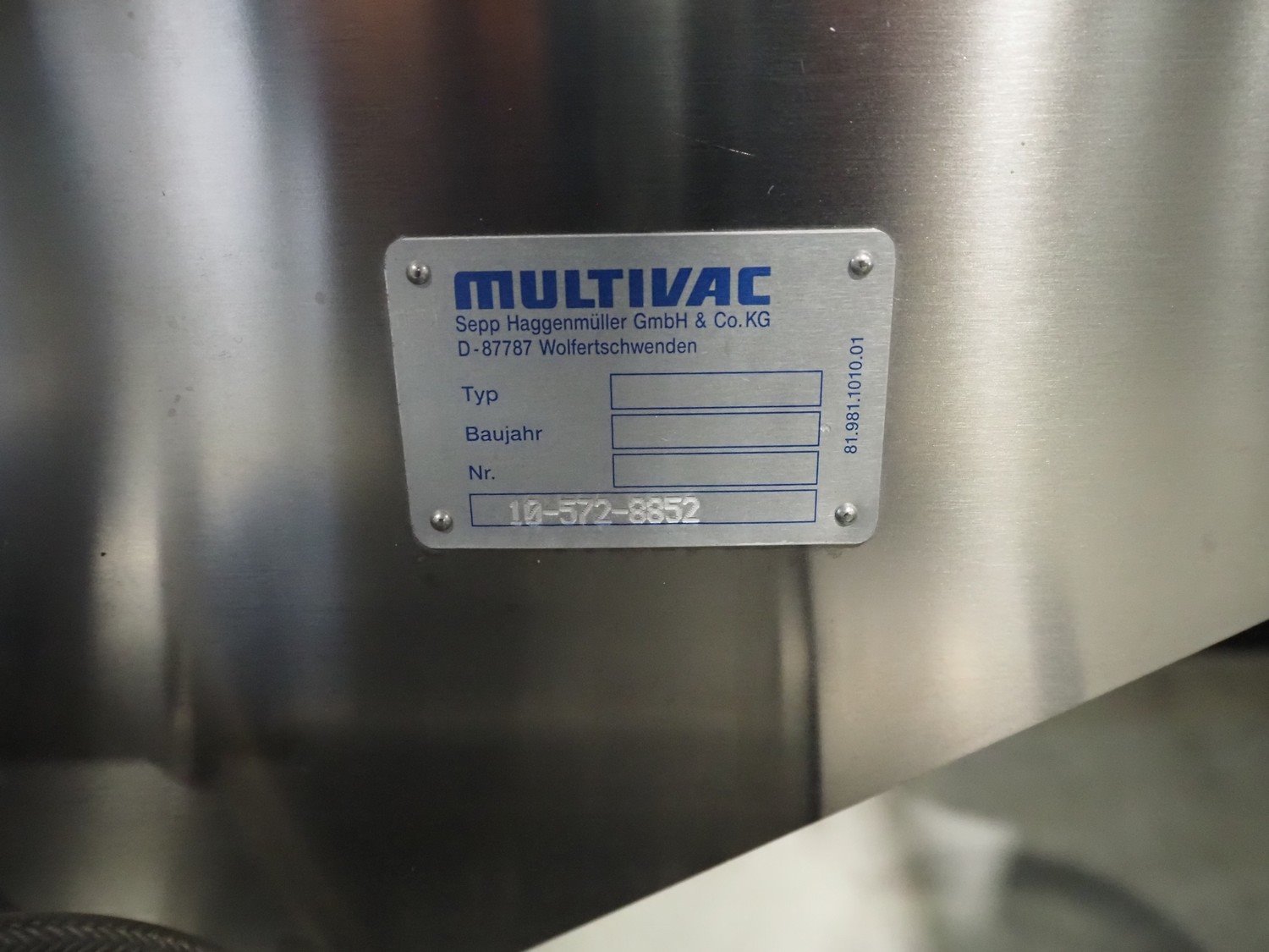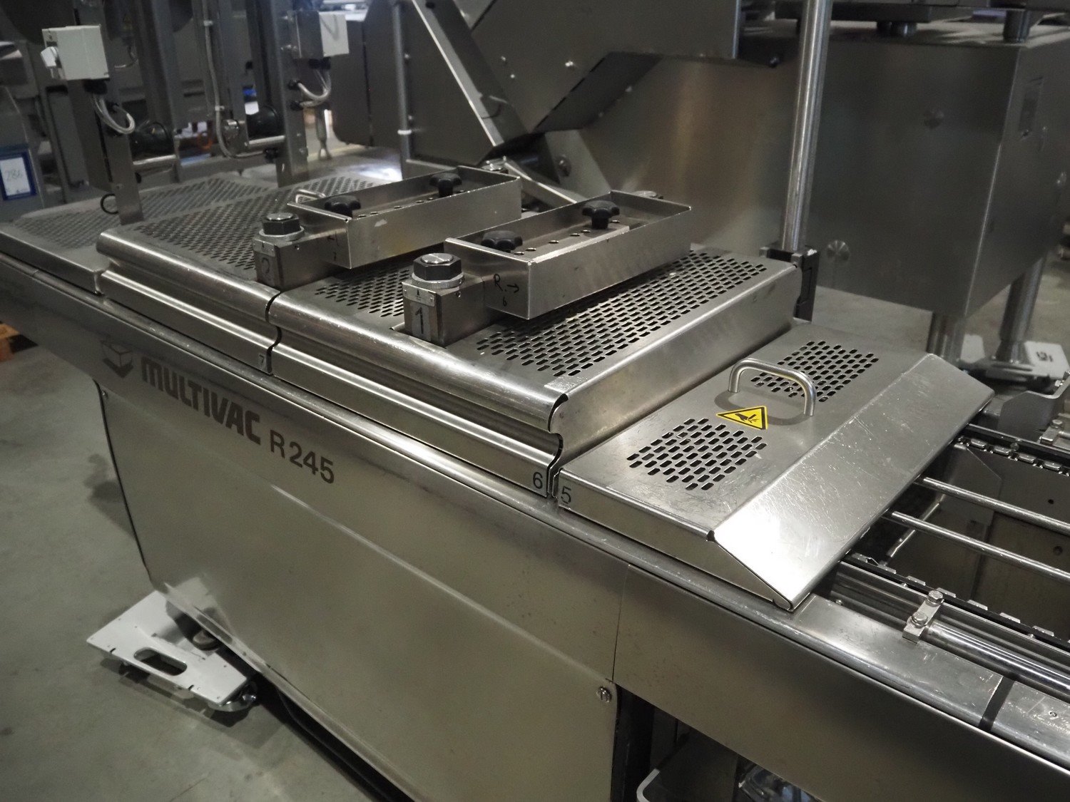 Multivac thermoformer with MR Etikettiertechnik GmbH labelling unit, model: R245, machine number: 124685, year of construction: 2008, 400 V, 3 Ph, 50 Hz, 18 A, 7 kW, type labelling unit: MR 6318, type Witt-Gasetechnik gas mixing station: KM 100-2 MEM, dye: (6x) 103 mm x 90 mm, total dimensions: 8300 mm x 1600 mm x 2250 mm. Including Multivac inliner, belt width: (3x) 70 mm, (1x) 315 mm, total dimensions: 2050 mm x 600 mm x 1050 mm, and pallet with parts, dimensions: 1200 mm x 800 mm x 500 mm. Without rollies.