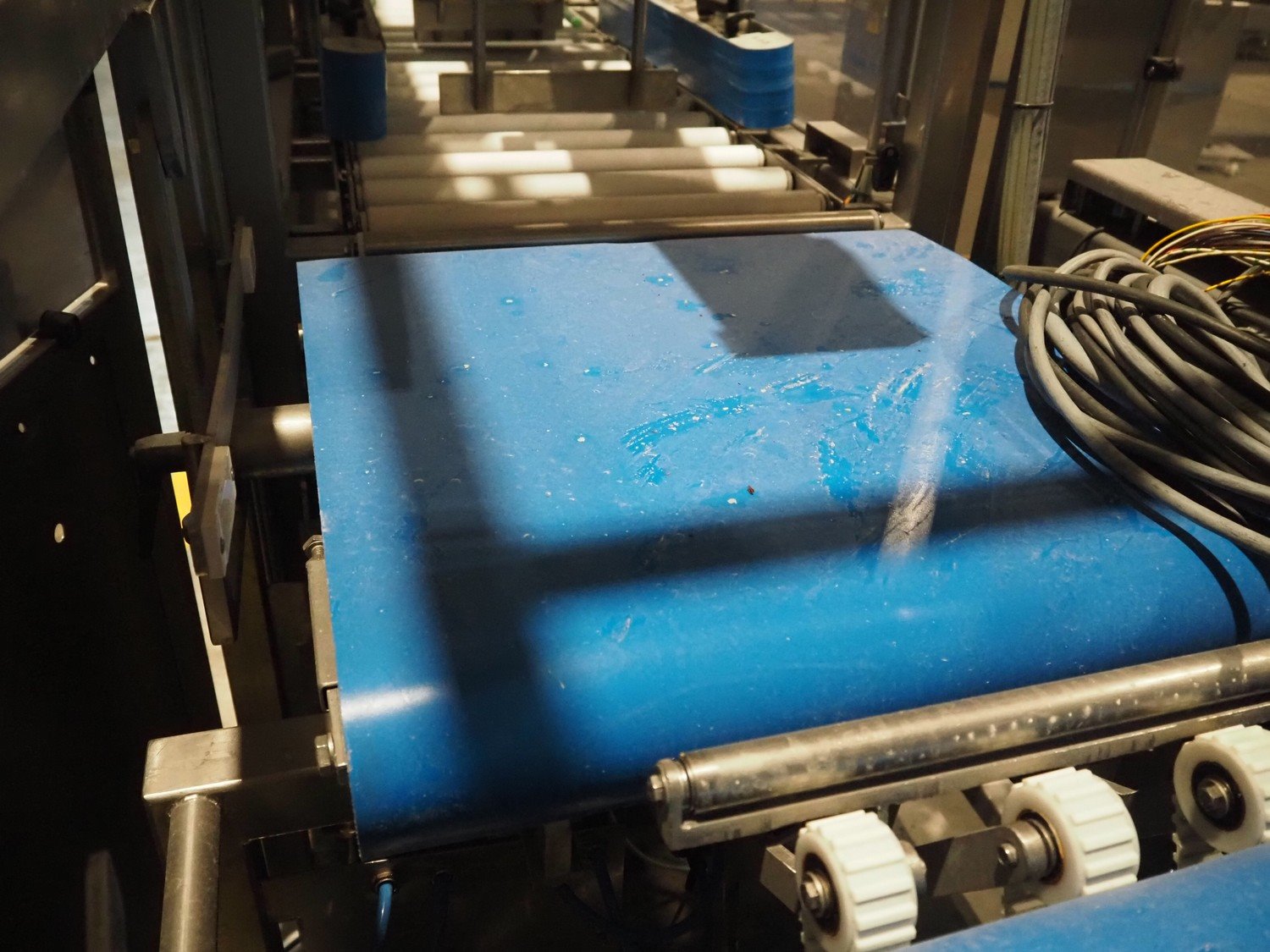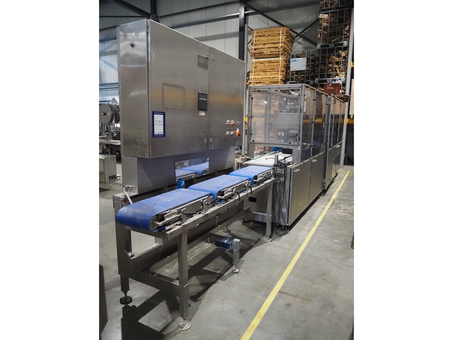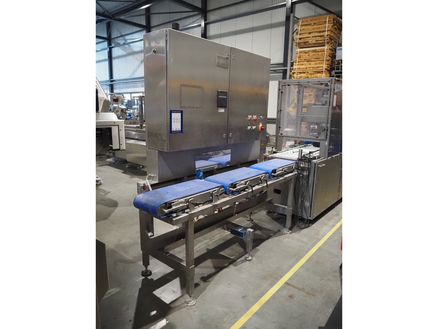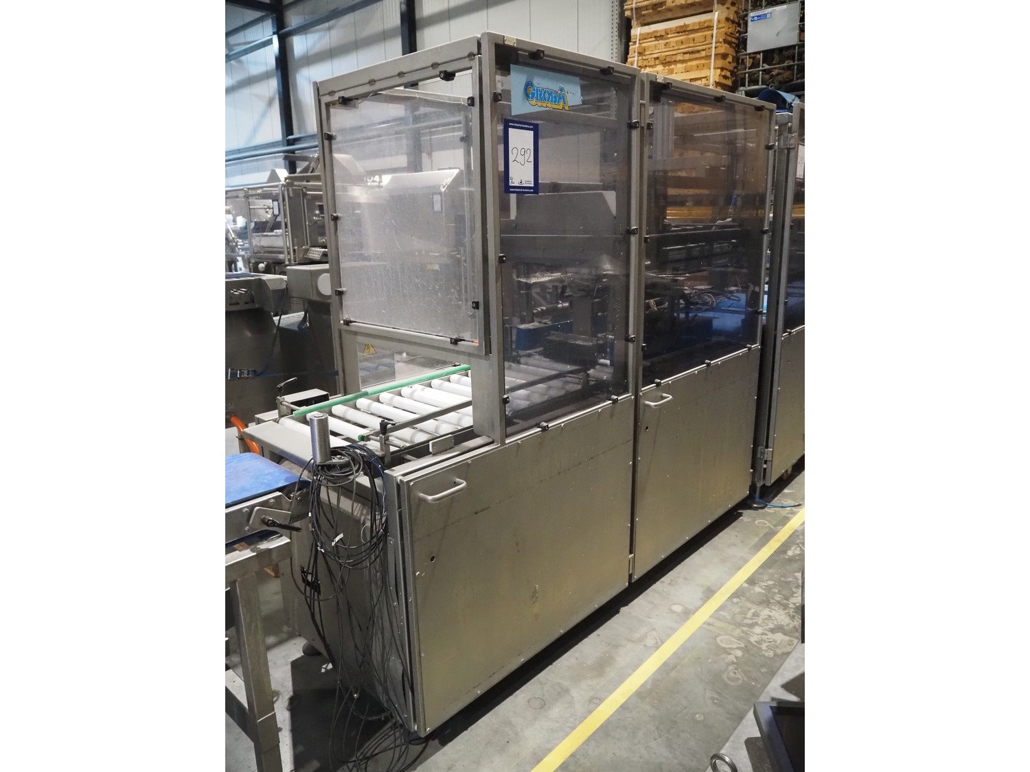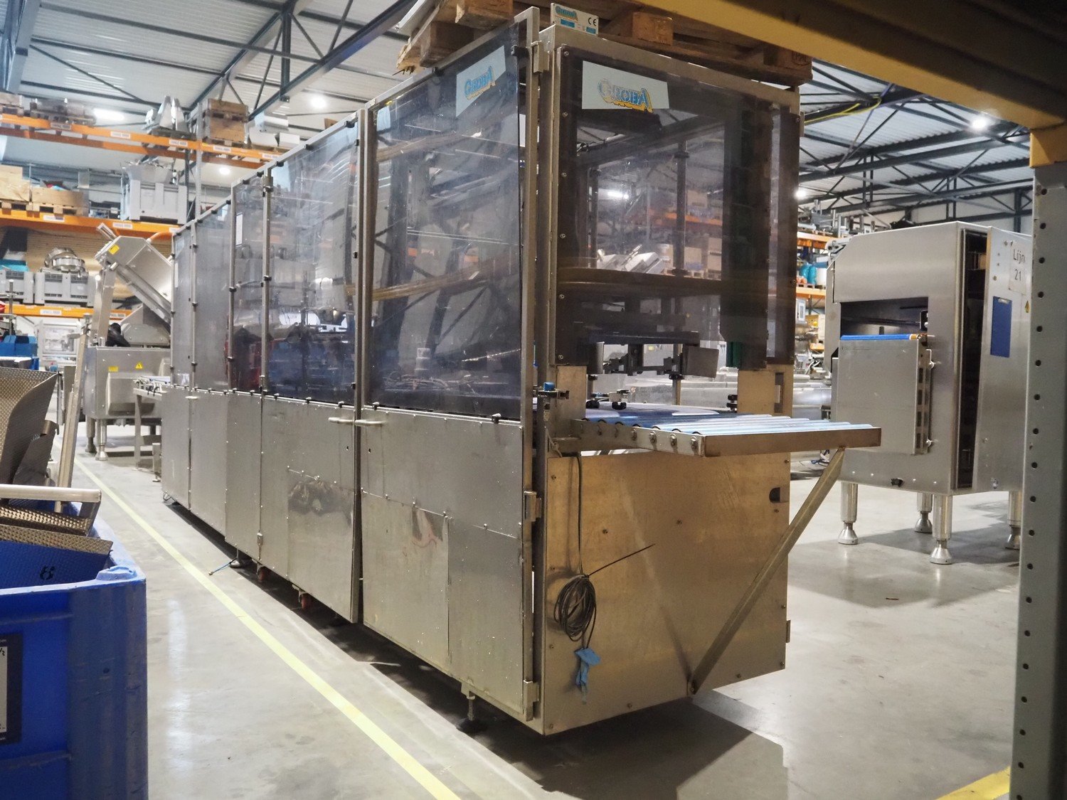 Groba cheese defoiling machine with infeed system for slicer and buffer belt, type: PHDM-520, number: 199910103, year of construction: 2000, weight: 600 kg, plastic rollers, roller width: 520 mm, plastic belt, belt width: 550 mm, roll width: 550 mm, dimensions infeed system: 3000 mm x 1250 mm x 2250 mm, dimensions defoiling machine: 2650 mm x 1000 mm x 2130 mm and dimensions buffer belt: 2330 mm x 750 mm x 2230 mm.