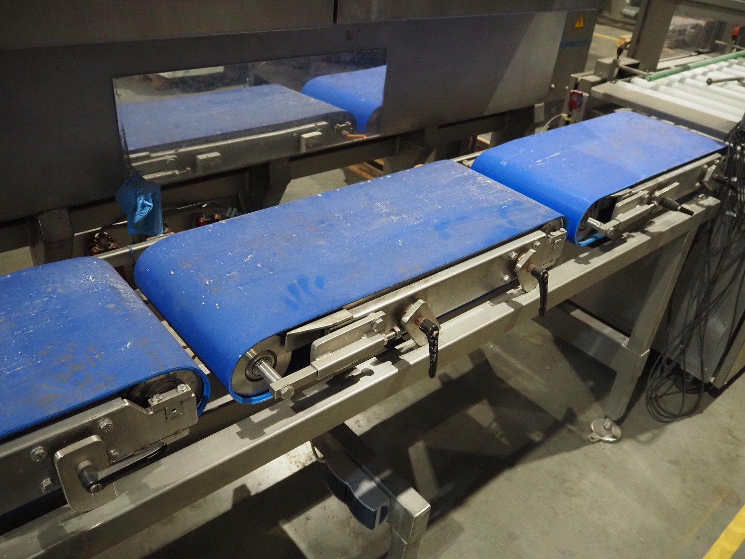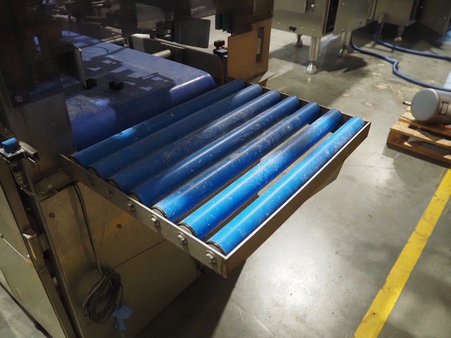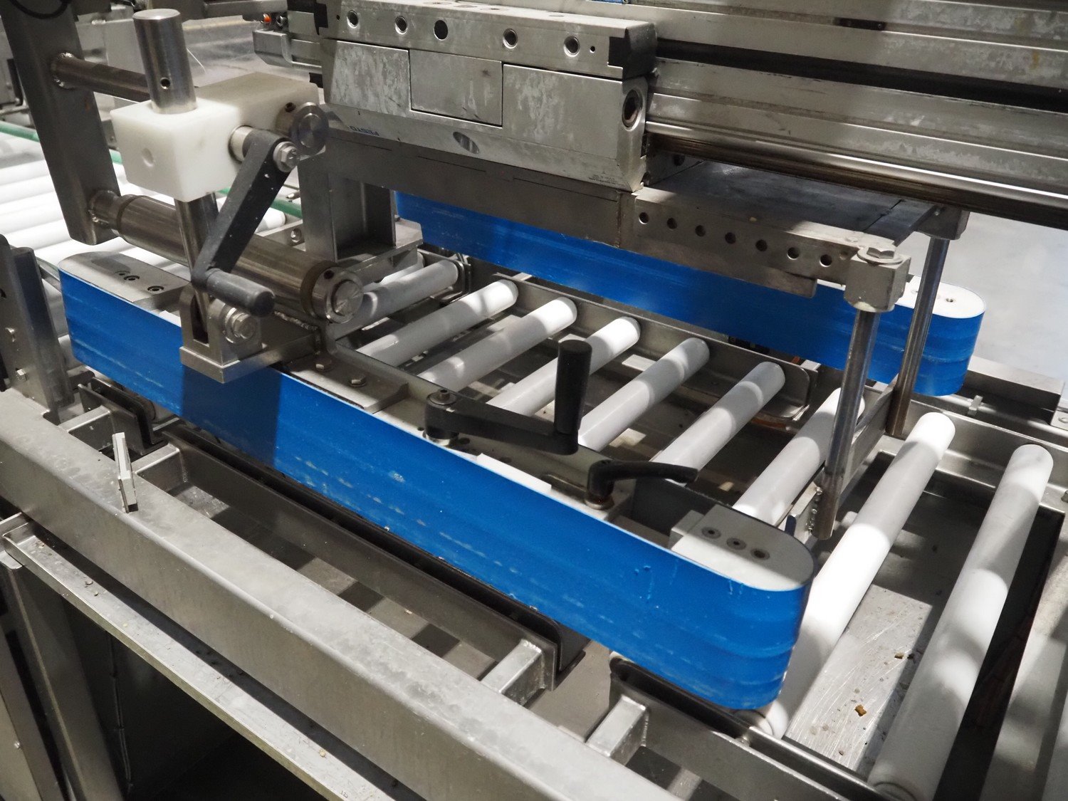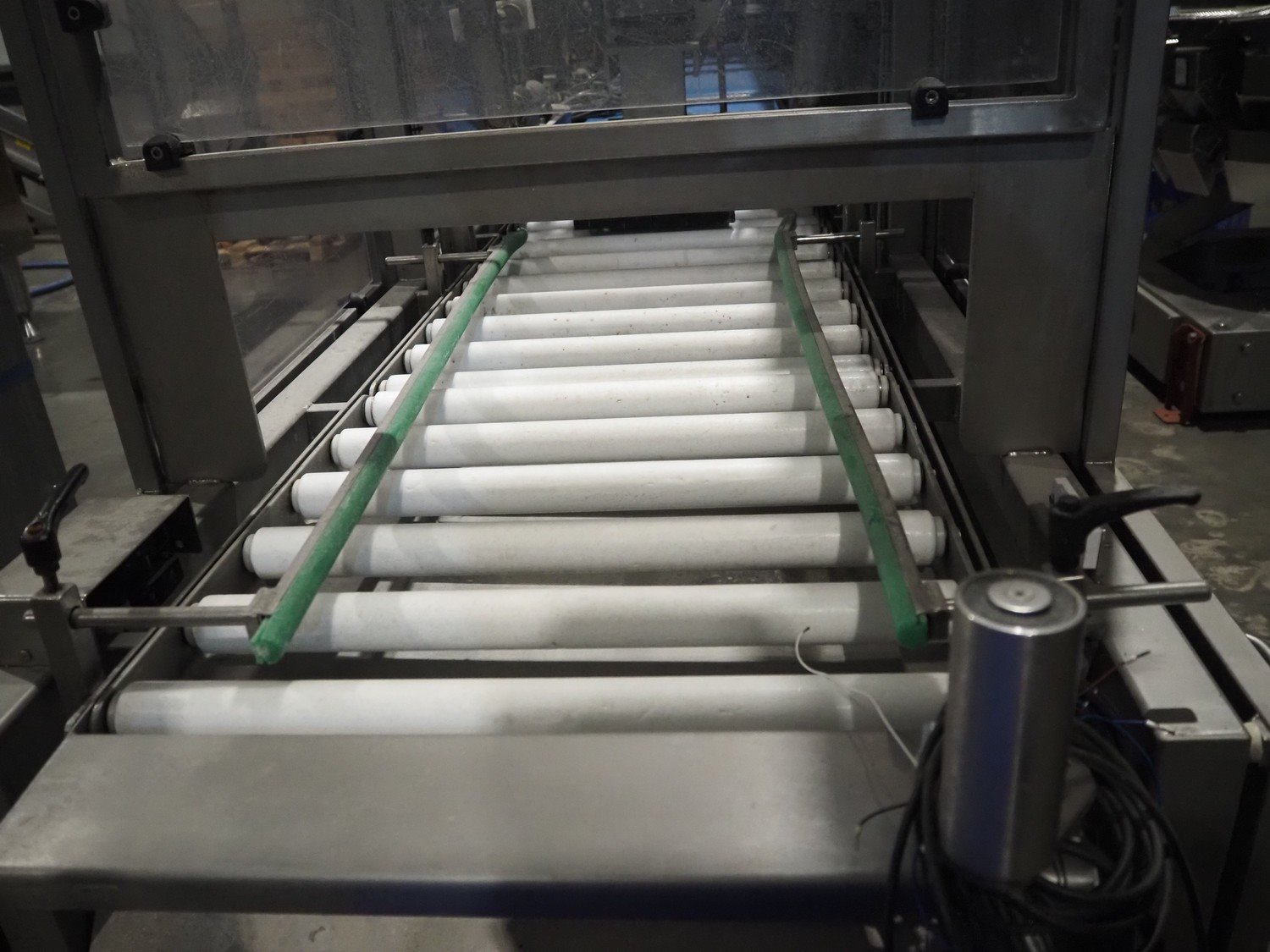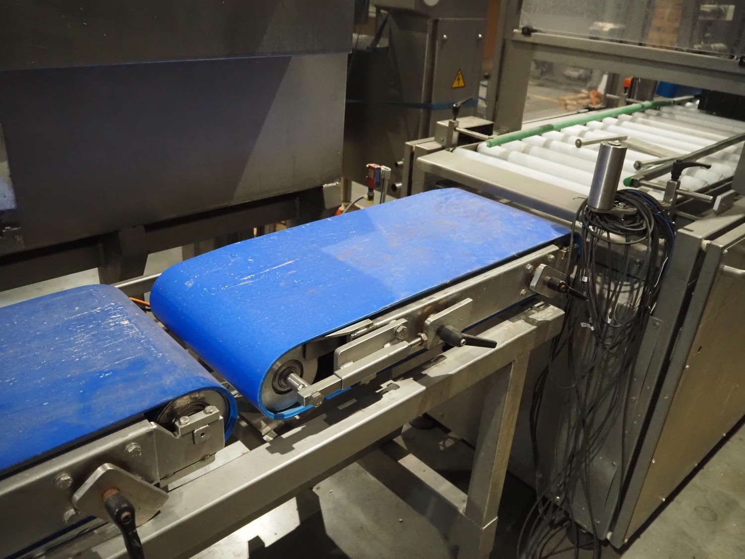 Groba cheese defoiling machine with infeed system for slicer and buffer belt, type: PHDM-520, number: 199910103, year of construction: 2000, weight: 600 kg, plastic rollers, roller width: 520 mm, plastic belt, belt width: 550 mm, roll width: 550 mm, dimensions infeed system: 3000 mm x 1250 mm x 2250 mm, dimensions defoiling machine: 2650 mm x 1000 mm x 2130 mm and dimensions buffer belt: 2330 mm x 750 mm x 2230 mm.