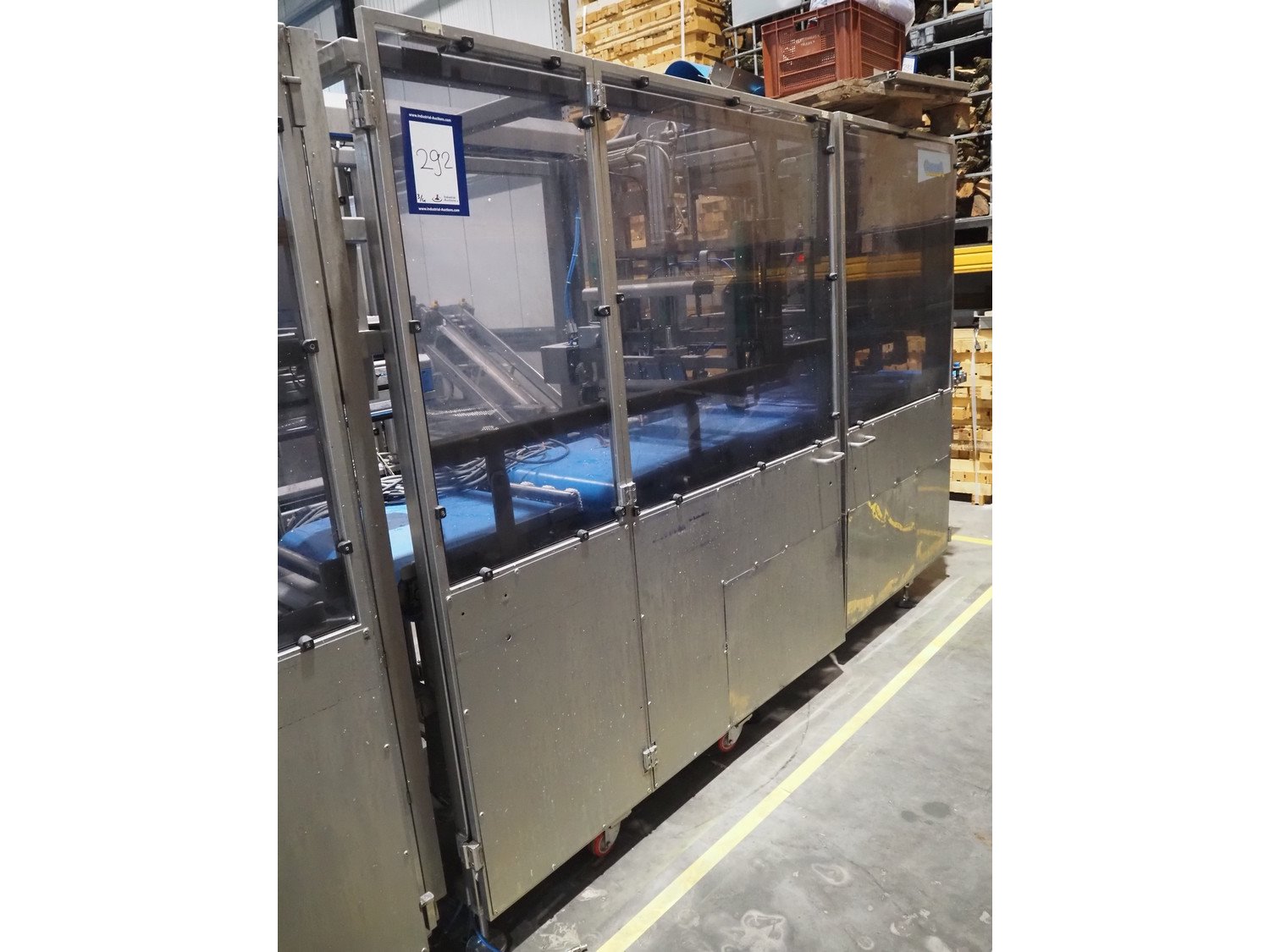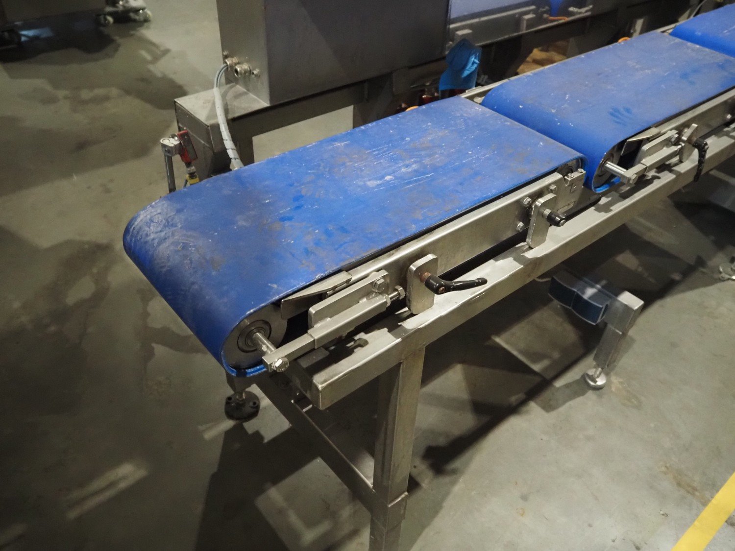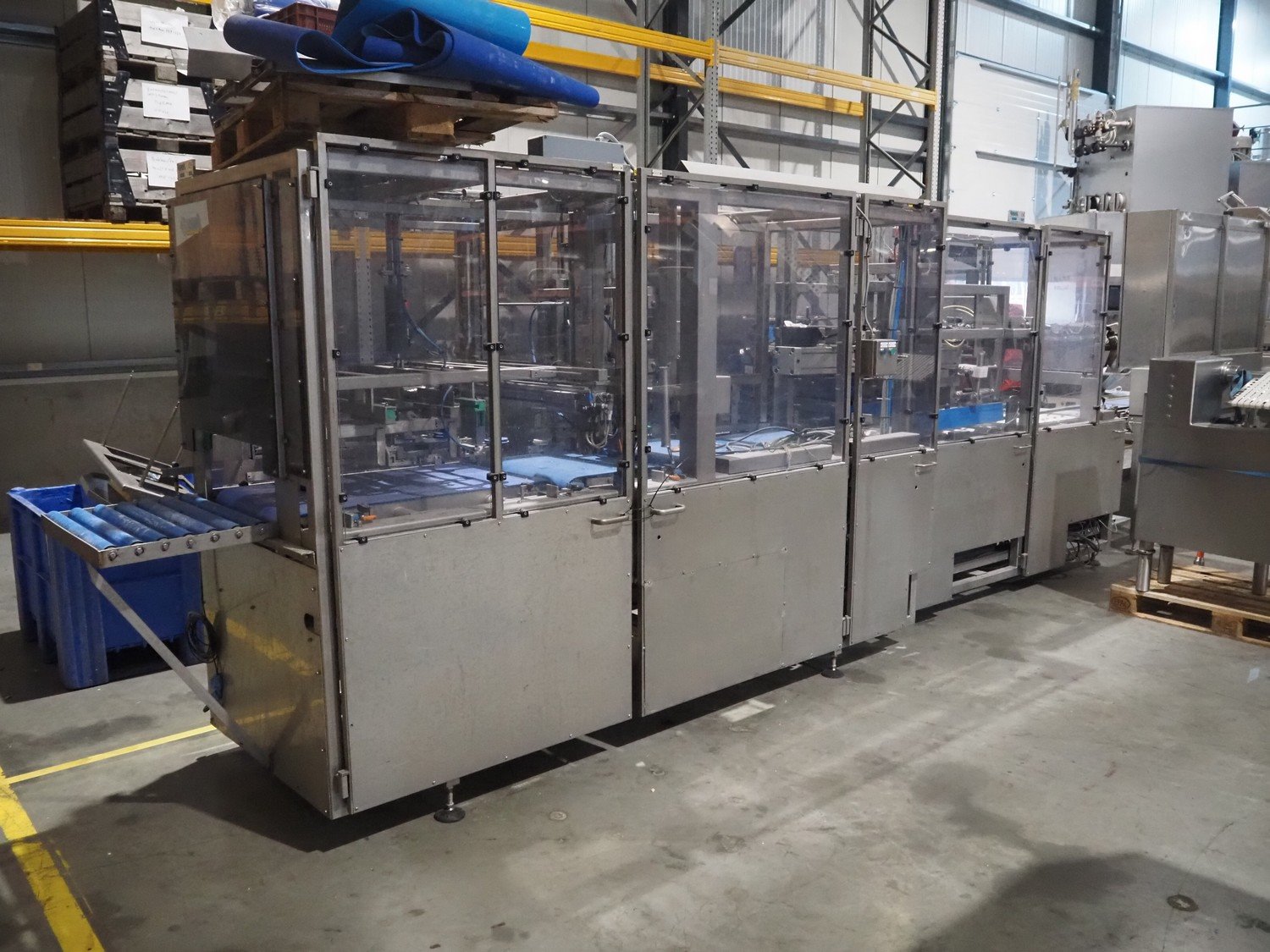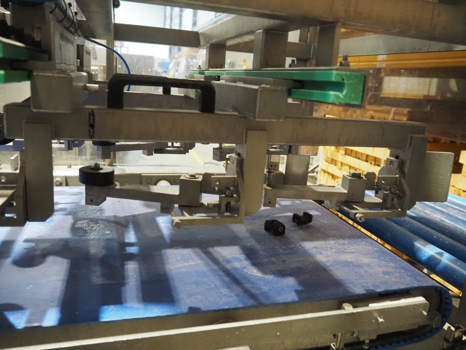 Groba cheese defoiling machine with infeed system for slicer and buffer belt, type: PHDM-520, number: 199910103, year of construction: 2000, weight: 600 kg, plastic rollers, roller width: 520 mm, plastic belt, belt width: 550 mm, roll width: 550 mm, dimensions infeed system: 3000 mm x 1250 mm x 2250 mm, dimensions defoiling machine: 2650 mm x 1000 mm x 2130 mm and dimensions buffer belt: 2330 mm x 750 mm x 2230 mm.