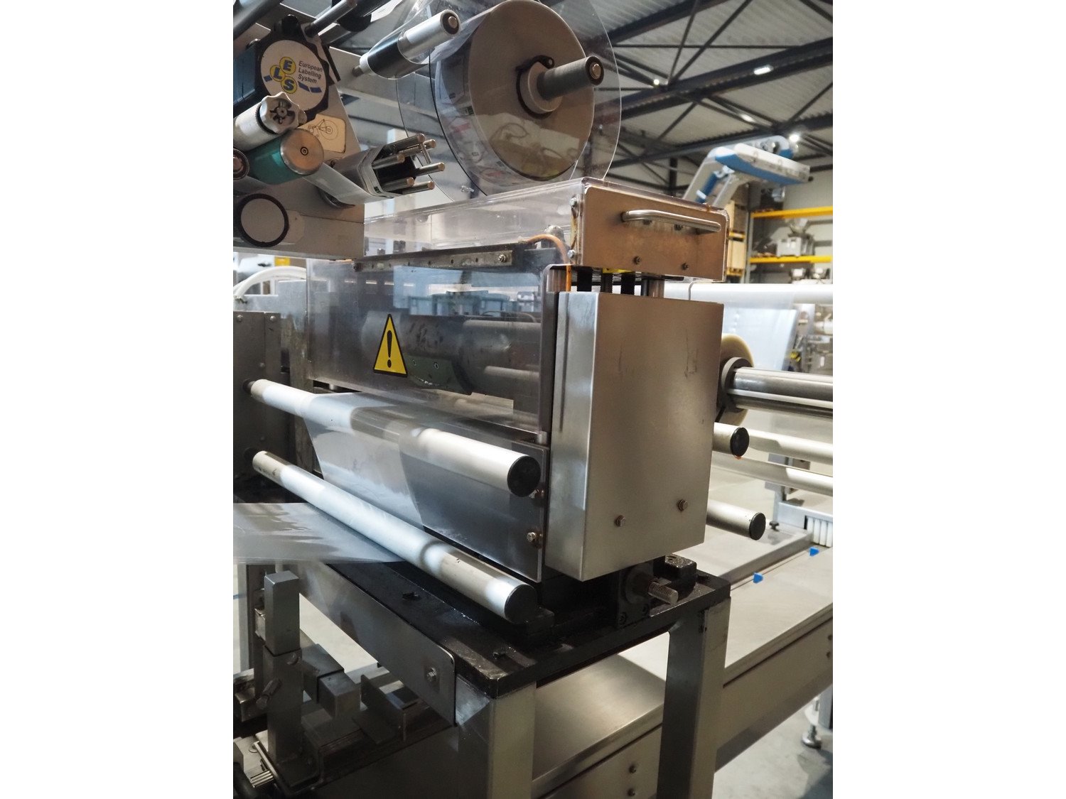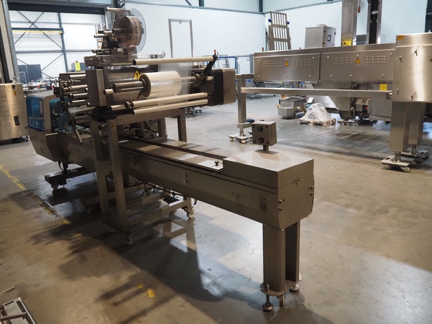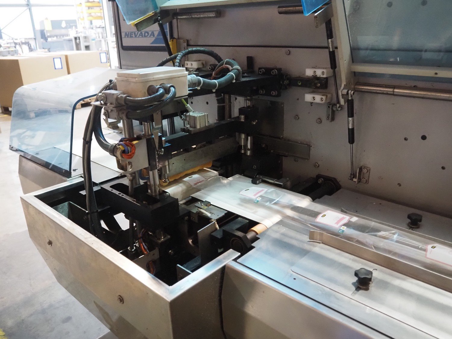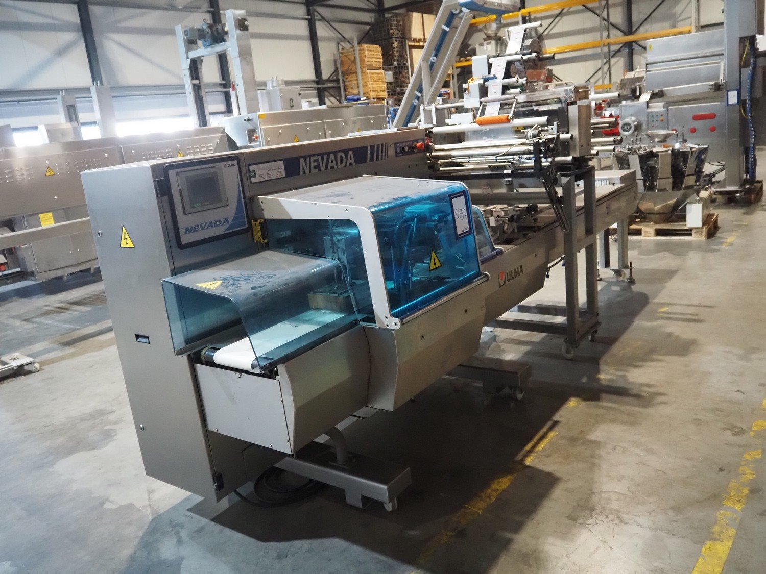Ulma mobile flowpacker, model: Nevada BS, number: 130052, year of construction: 2003, 380 V, 50 Hz, 23 A, 5 kW, ELS labelling machine, infeed belt with dividers, belt width: 150 mm, distance between dividers: 300 mm, divider height: 30 mm, seal width: 300 mm, plastic outfeed belt, belt width: 200 mm, total dimensions: 4500 mm x 1300 mm x 1150 mm.