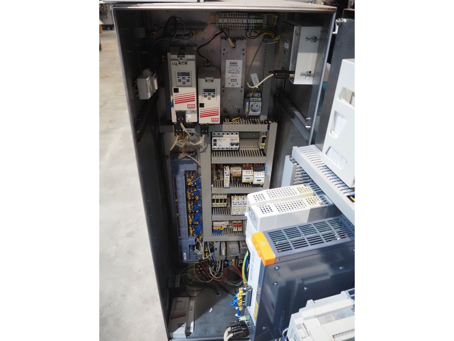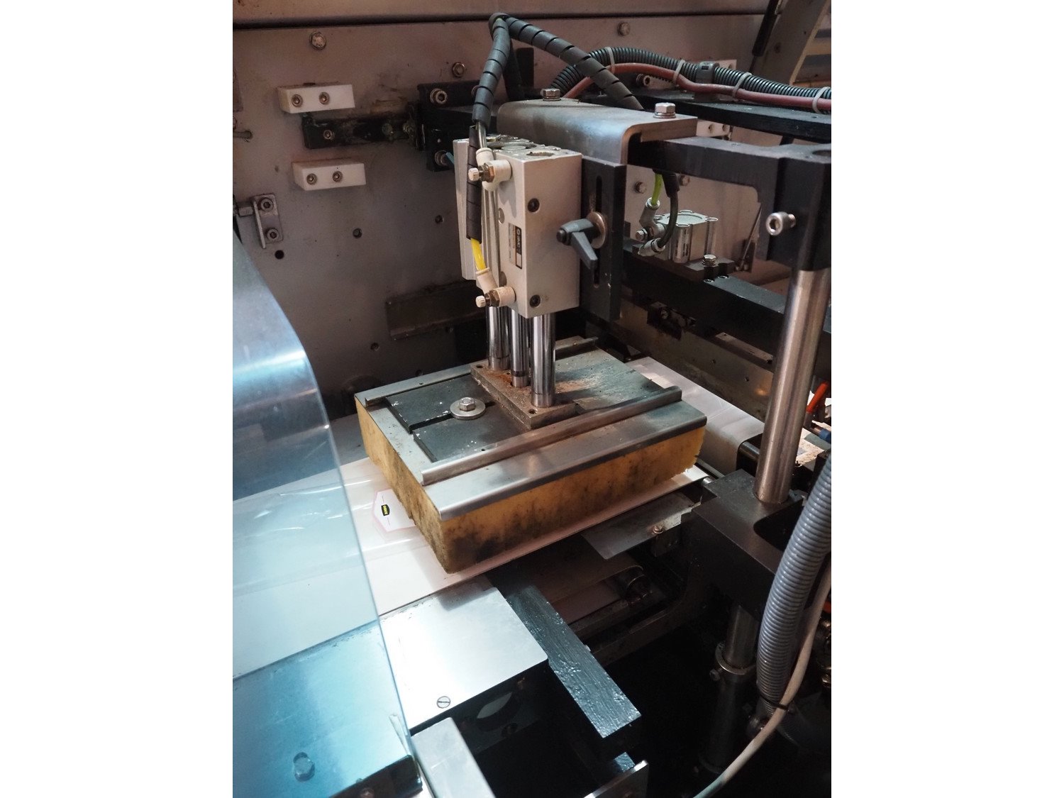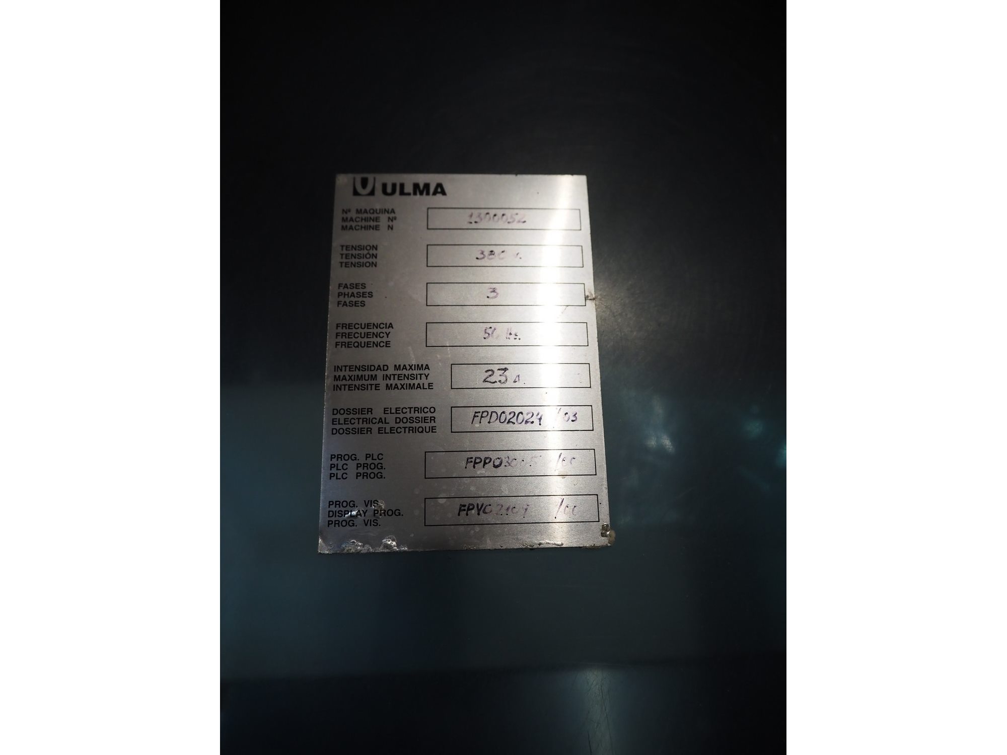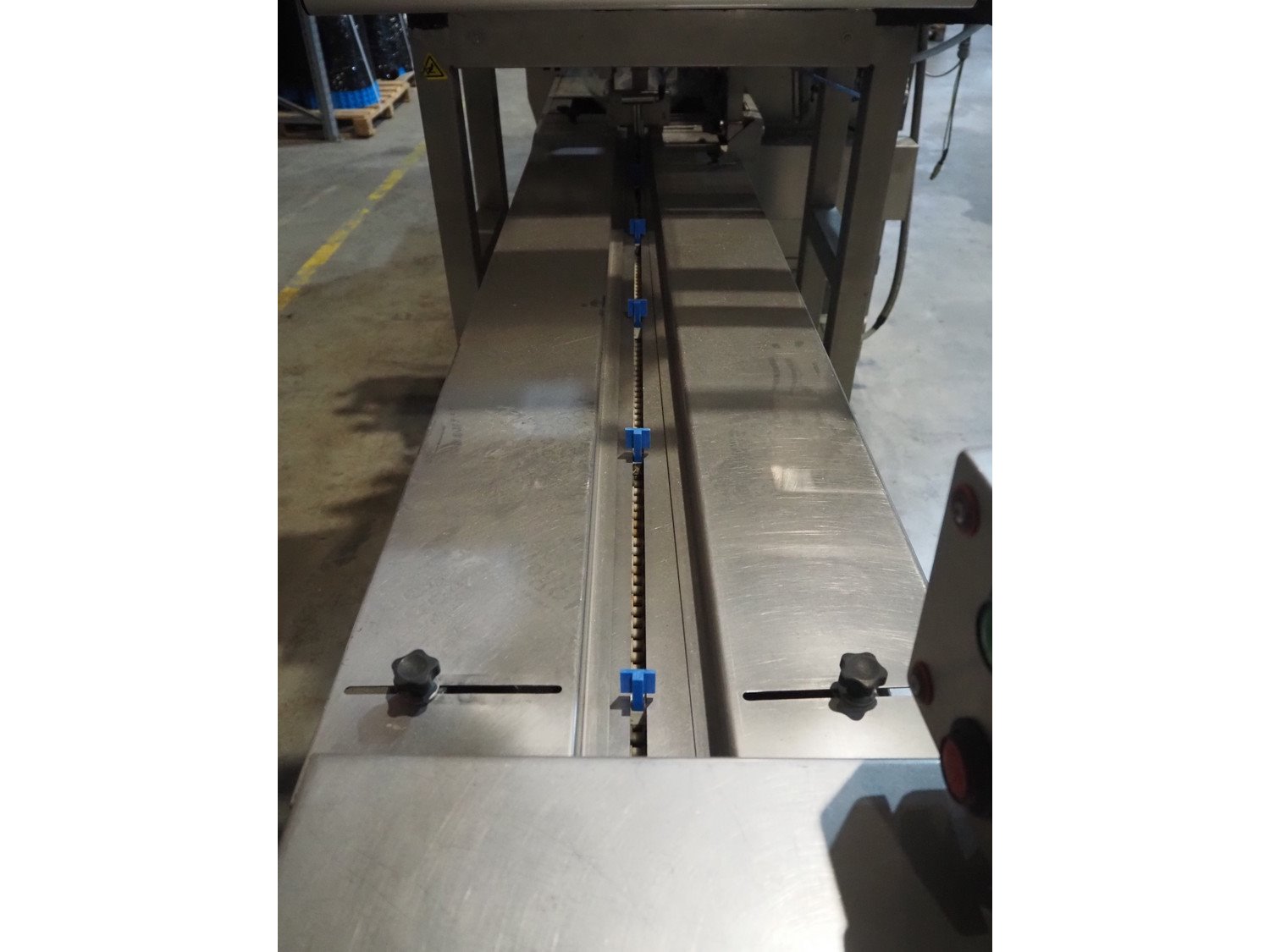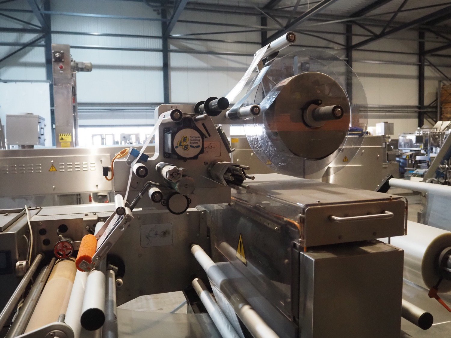 Ulma mobile flowpacker, model: Nevada BS, number: 130052, year of construction: 2003, 380 V, 50 Hz, 23 A, 5 kW, ELS labelling machine, infeed belt with dividers, belt width: 150 mm, distance between dividers: 300 mm, divider height: 30 mm, seal width: 300 mm, plastic outfeed belt, belt width: 200 mm, total dimensions: 4500 mm x 1300 mm x 1150 mm.
