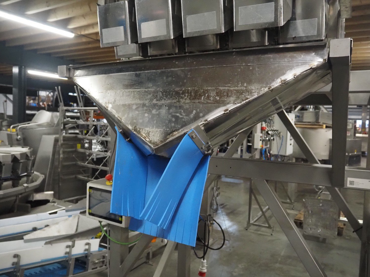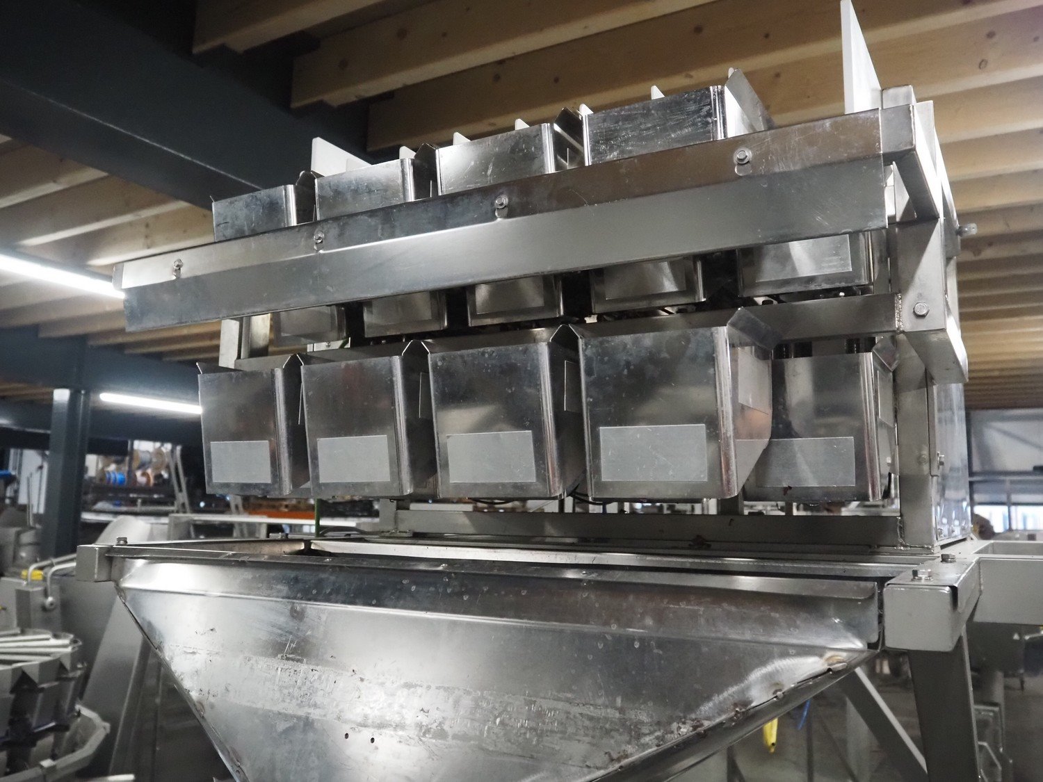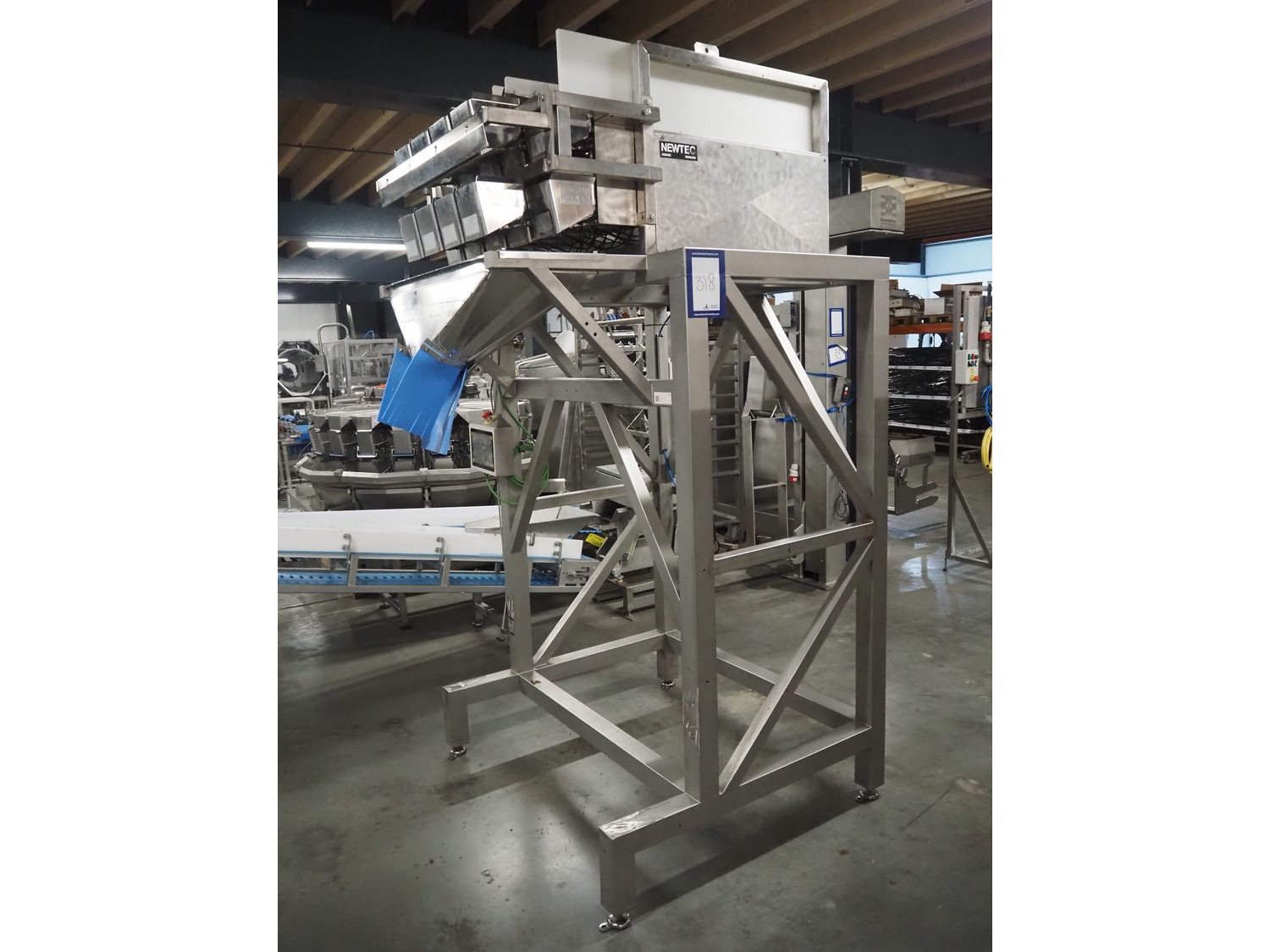 Newtec linear weigher, 9 heads, type: 3009M, number: 8625, year of construction: 2007 (software year of construction: 2019), 220 V, 3 Ph, 60 Hz, 5 A, 1 kW, lane width: 130 mm, total dimensions: 1400 mm x 1500 mm x 2680 mm.