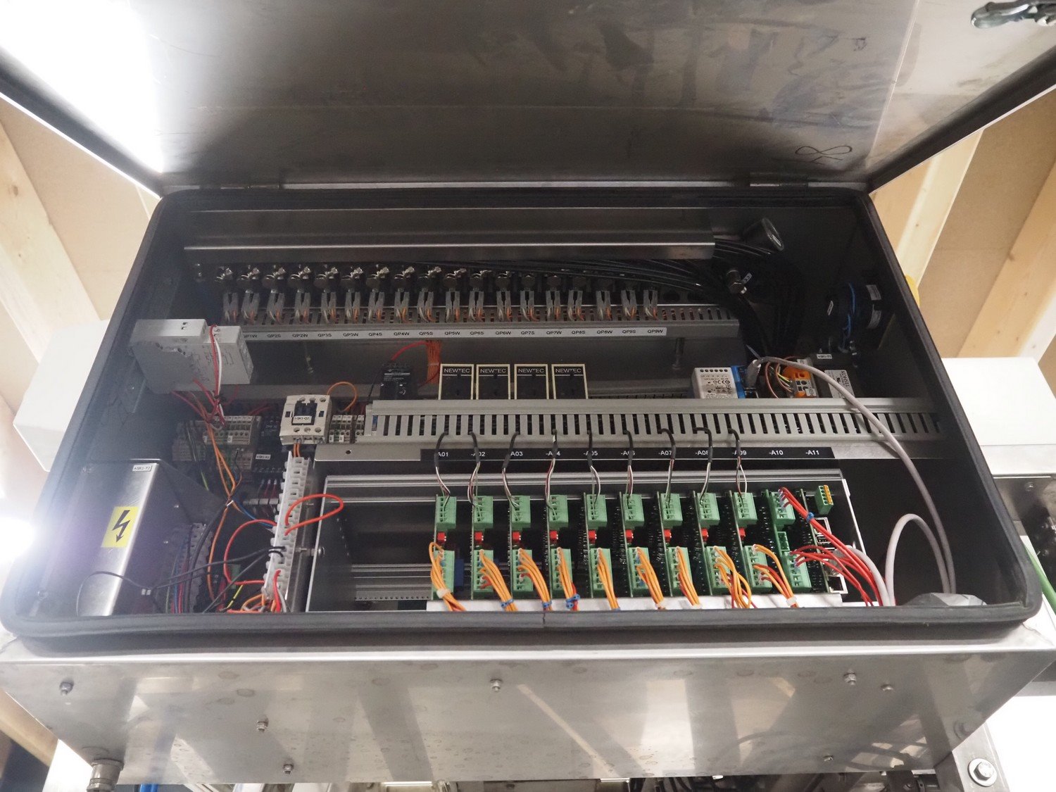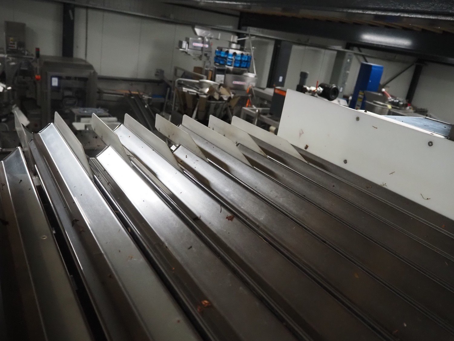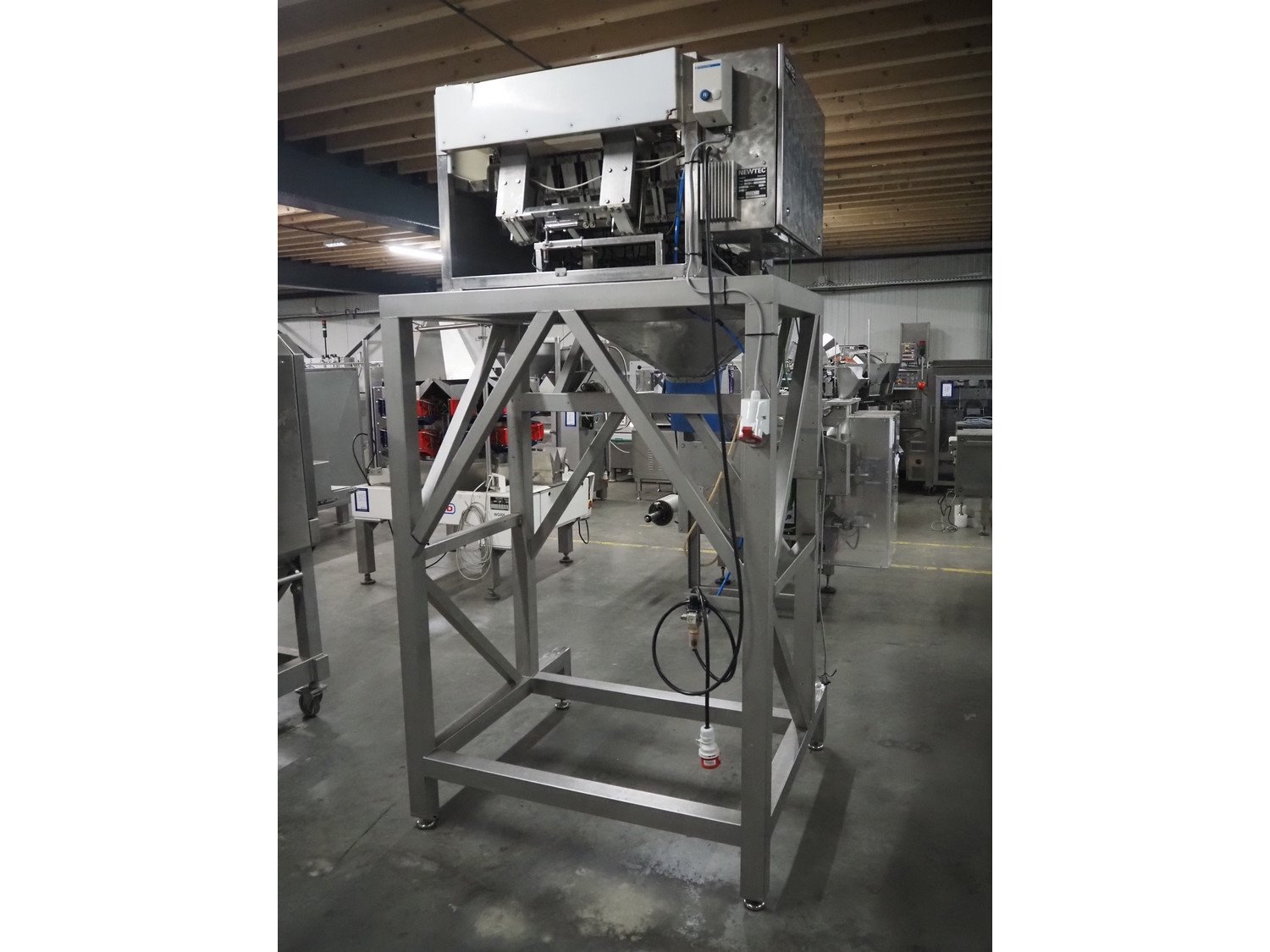 Newtec linear weigher, 9 heads, type: 3009M, number: 8625, year of construction: 2007 (software year of construction: 2019), 220 V, 3 Ph, 60 Hz, 5 A, 1 kW, lane width: 130 mm, total dimensions: 1400 mm x 1500 mm x 2680 mm.