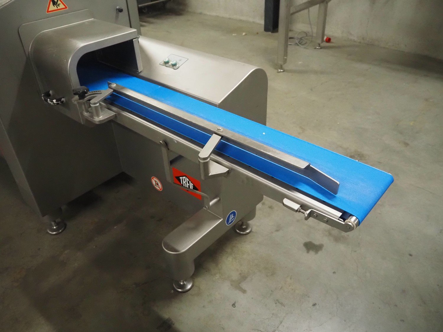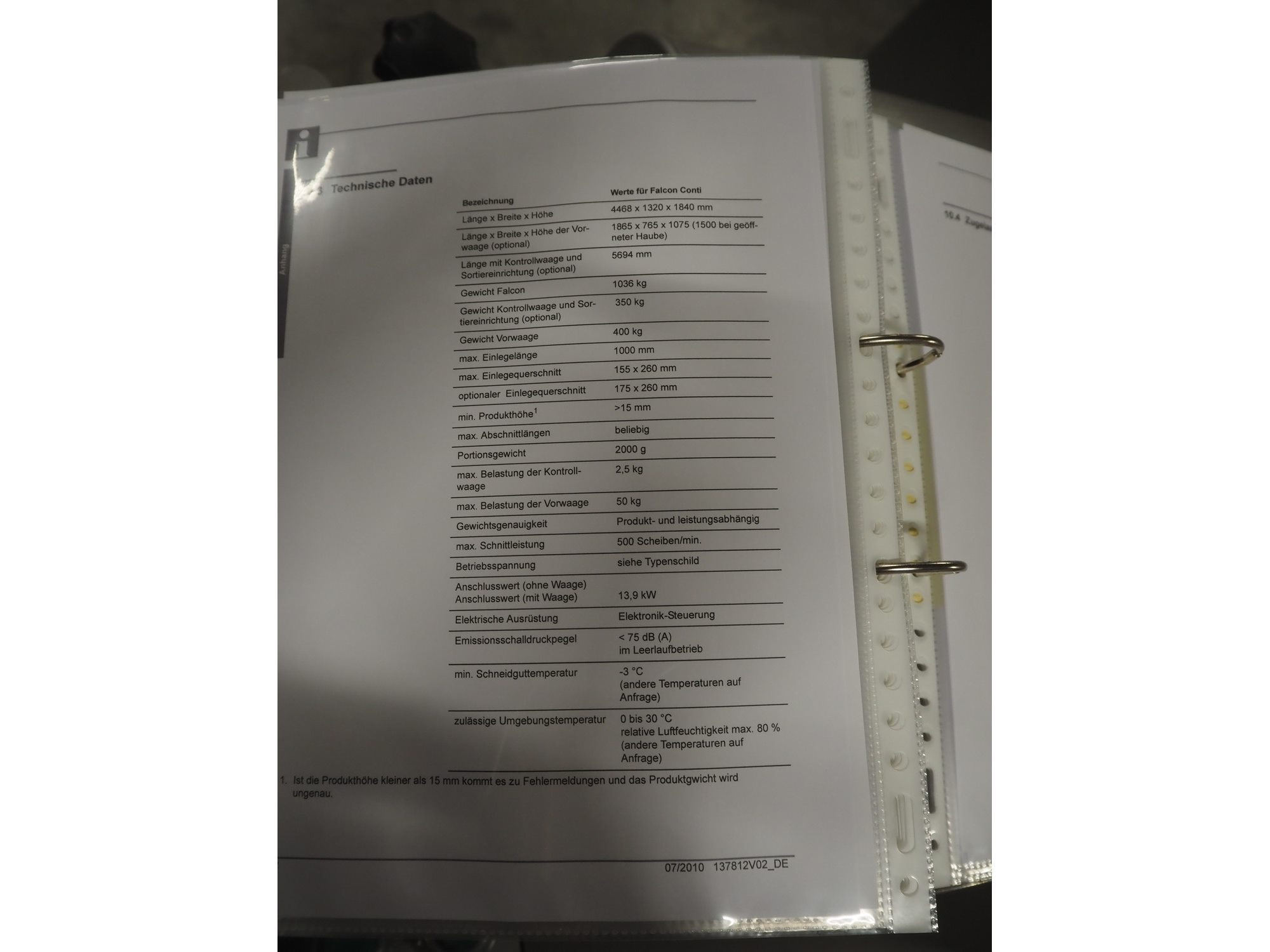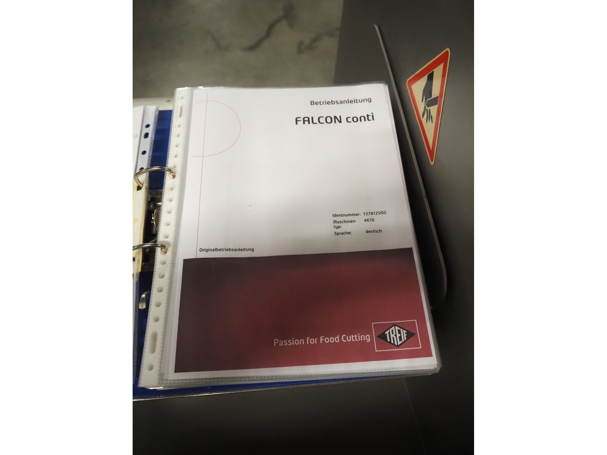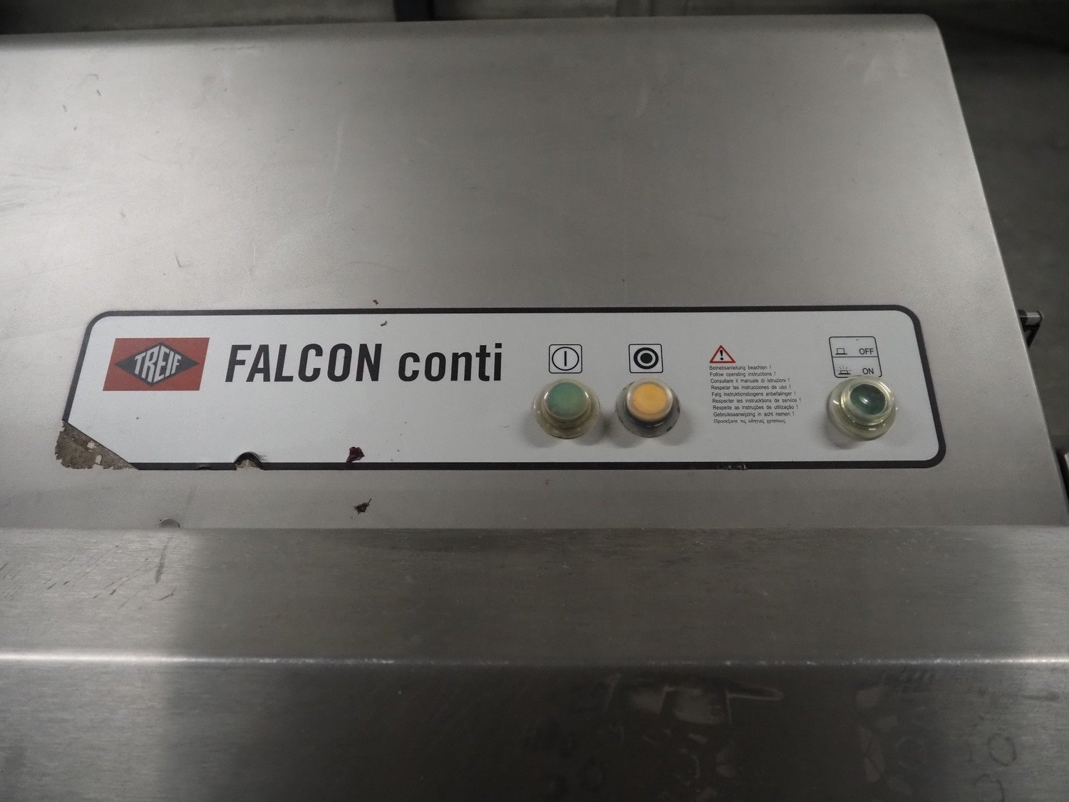 Treif Maschinenbau GmbH slicer and portion cutter, model: FALCON conti, machine number: 461005.154538.110208, year of construction: 2011, 380-480 V, 3 Ph, 50/60 Hz, 32 A, 8.6 kW, weight: 750 kg, plastic belt, belt width: 220 mm, clearance: 290 mm x 180 mm, total dimensions: 4630 mm x 1300 mm x 1900 mm.