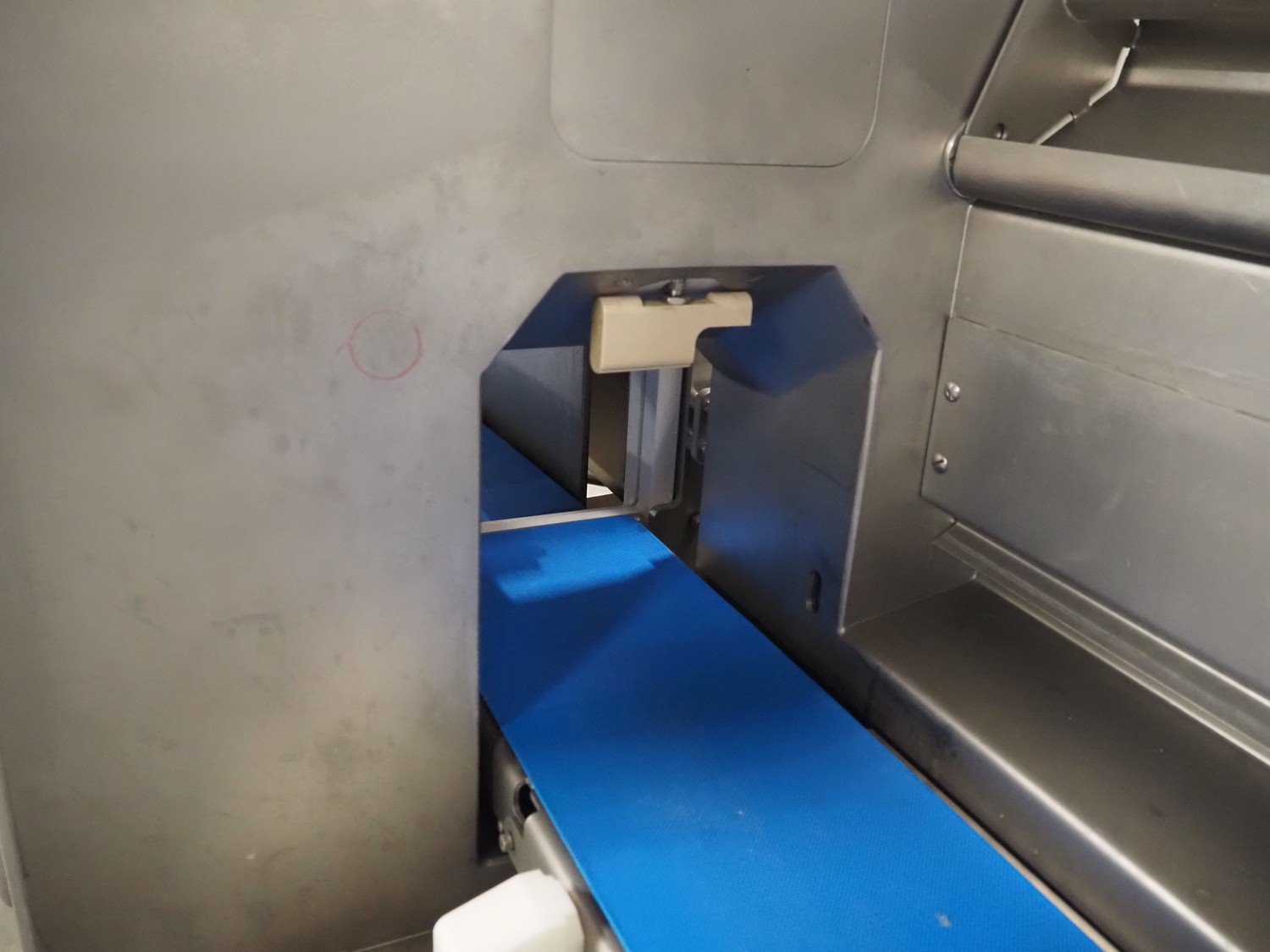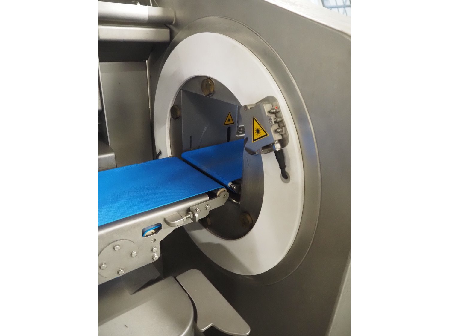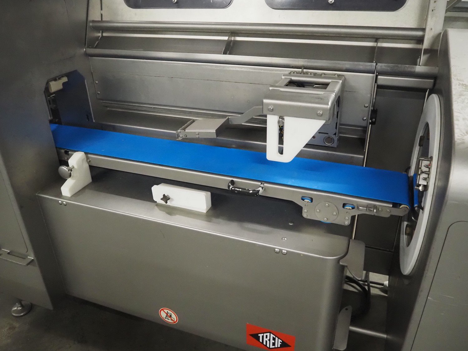 Treif Maschinenbau GmbH slicer and portion cutter, model: FALCON conti, machine number: 461005.154538.110208, year of construction: 2011, 380-480 V, 3 Ph, 50/60 Hz, 32 A, 8.6 kW, weight: 750 kg, plastic belt, belt width: 220 mm, clearance: 290 mm x 180 mm, total dimensions: 4630 mm x 1300 mm x 1900 mm.