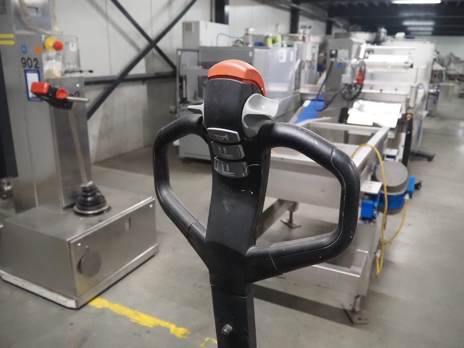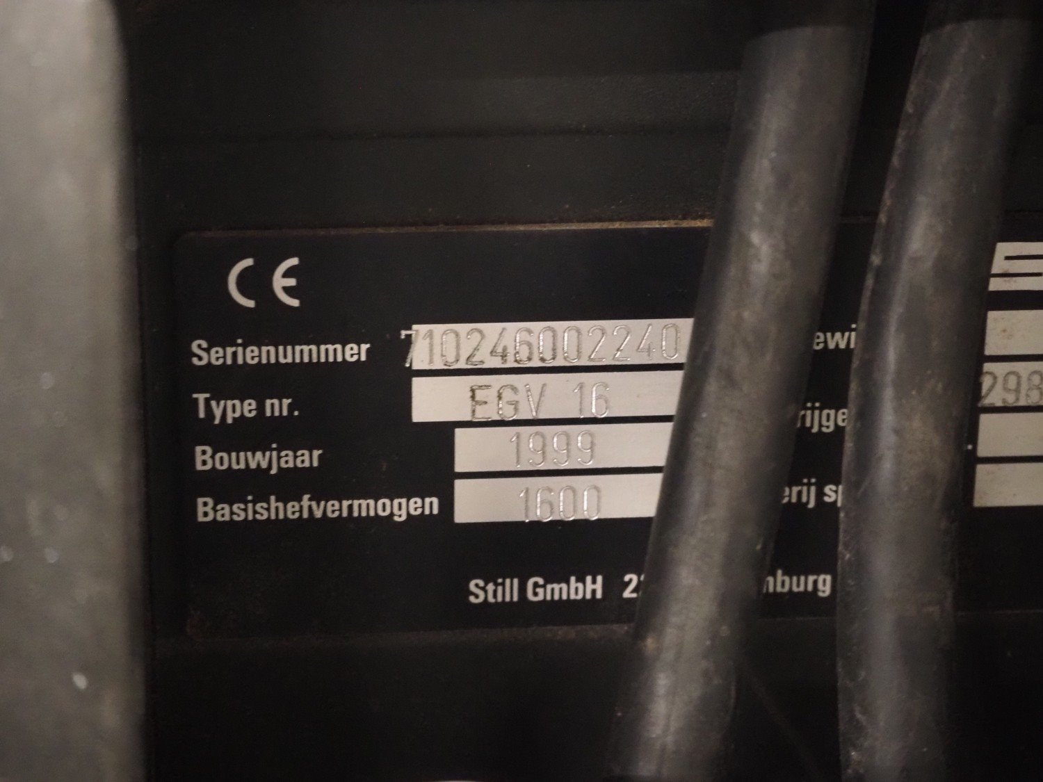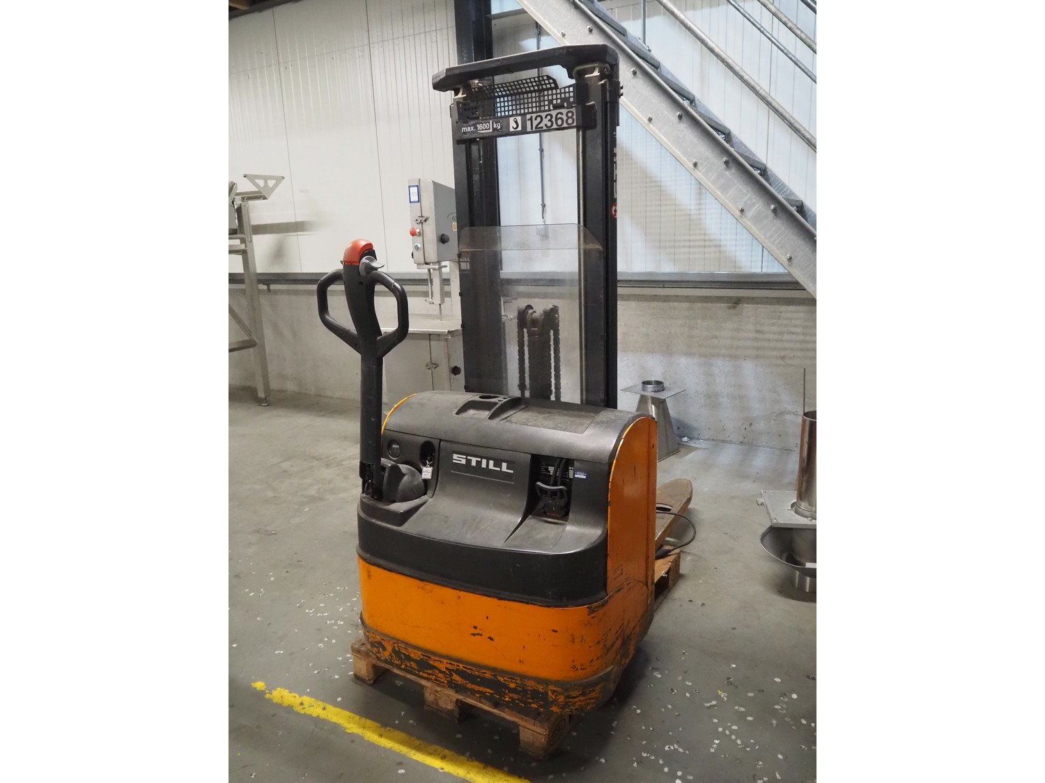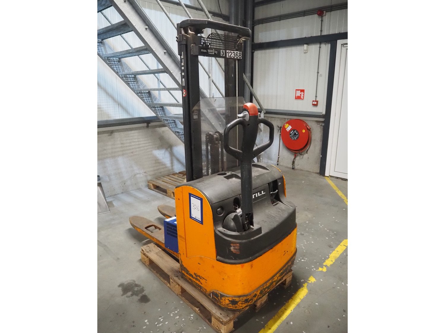 Still electrical pallet lifter, model: Electra stacker, fabrication number: 0240, year of construction: 2002, powered by 2 car batteries, fork length: 1150 mm, total dimensions: 1700 mm x 840 mm x 1940 mm.
