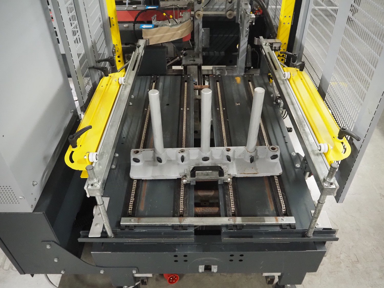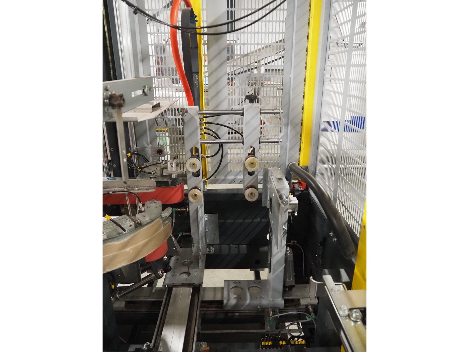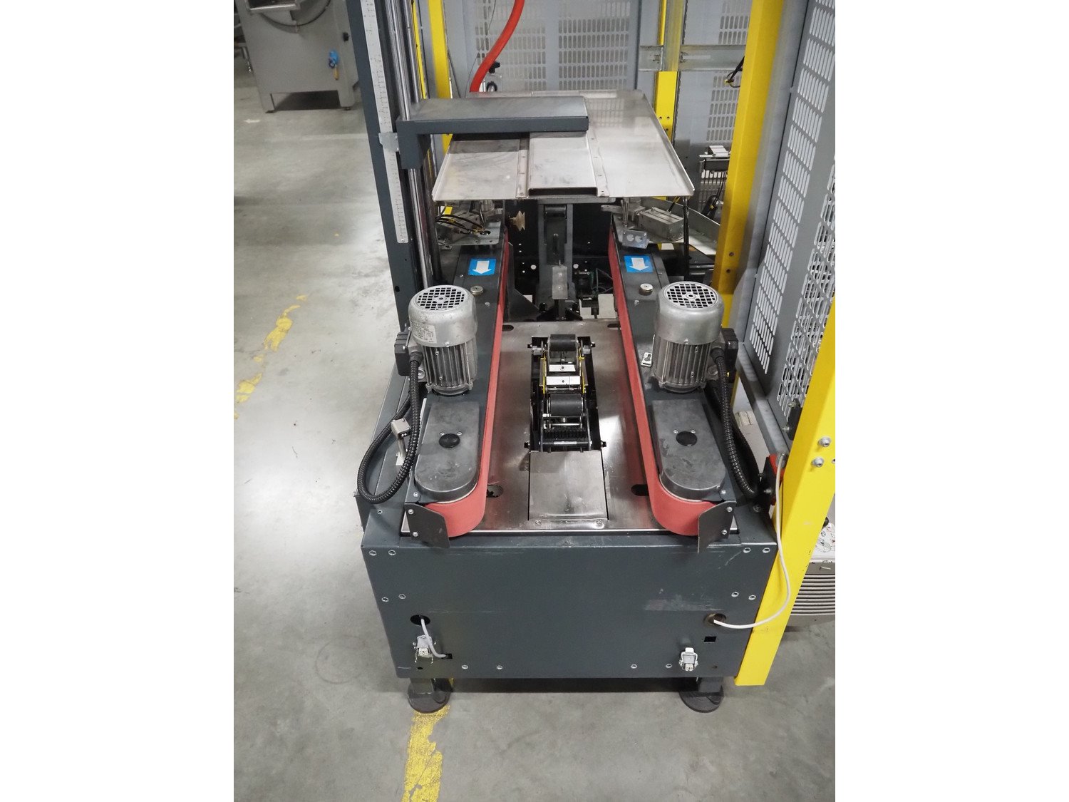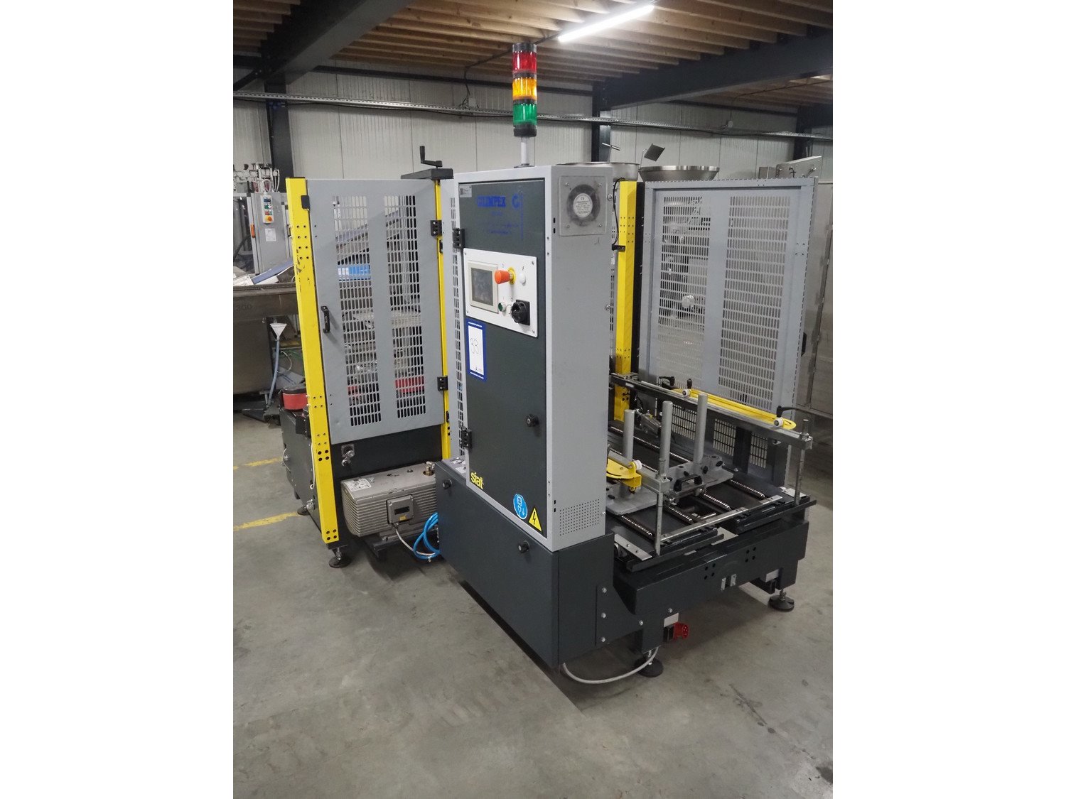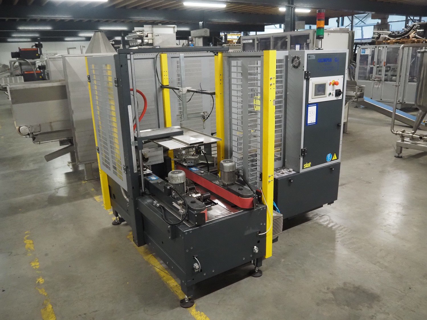 Siat box folding and closing machine, model: F344 SX, serial number: 50001, year of construction: 2011, 400 V, 3 Ph, 50 Hz, 6 A, 1500 W, Becker vacuum pump, infeed conveyor width: 690 mm, total dimensions: 2100 mm x 1750 mm x 2060 mm.