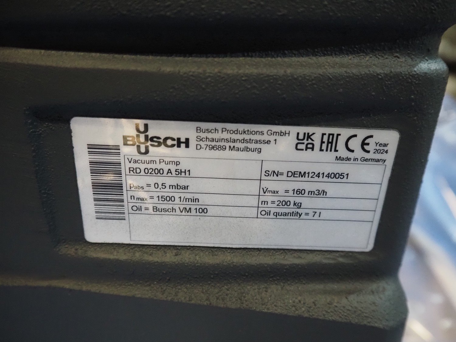 Busch vacuum pump, type: RD 0200 A 5H1, serial number: DEM124140051, year of construction: 2024, capacity: 160 m³ per hour, dimensions: 800 mm x 600 mm x 430 mm.