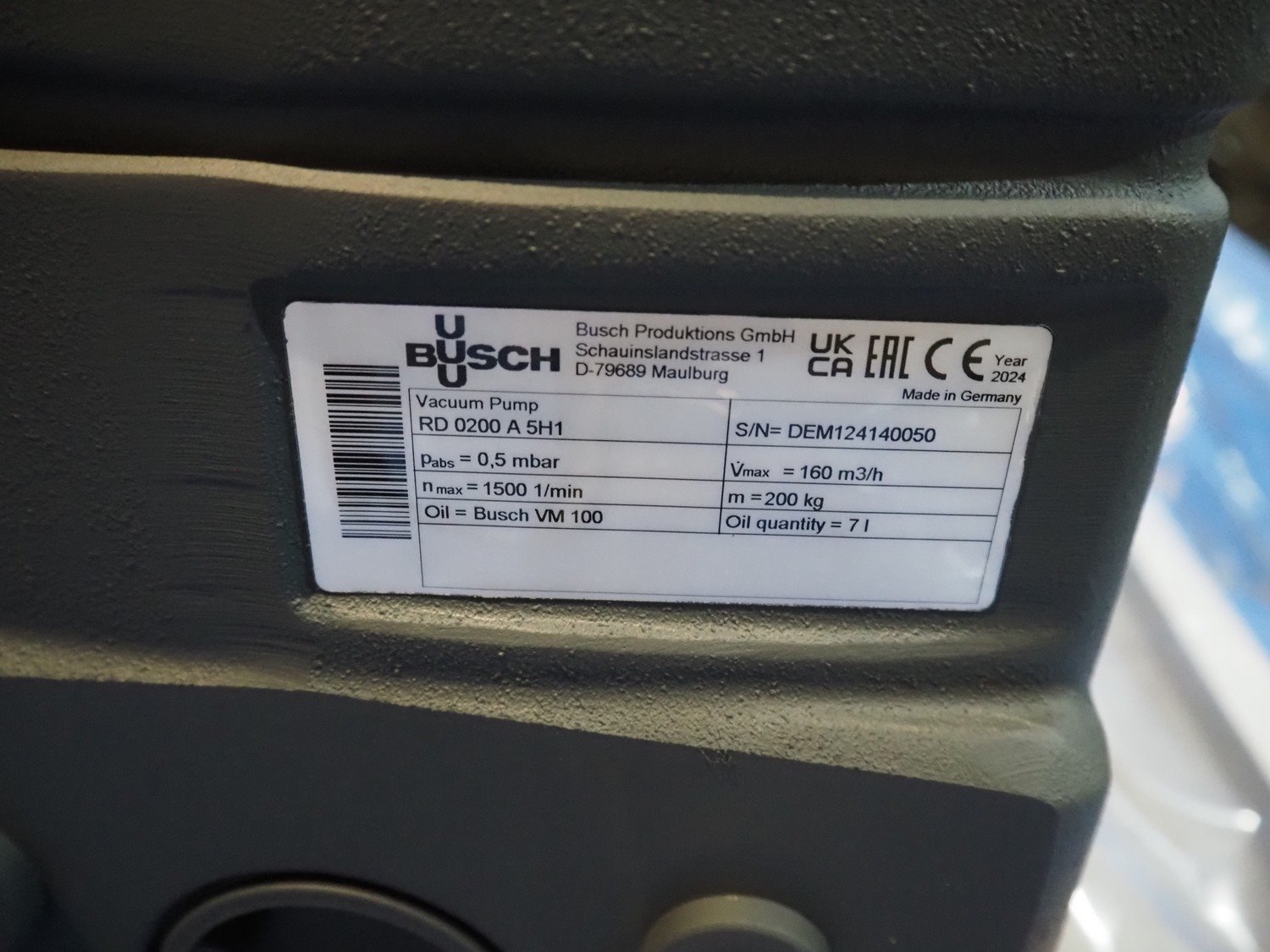 Busch vacuum pump, type: RD 0200 A 5H1, serial number: DEM124140050, year of construction: 2024, capacity: 160 m³ per hour, dimensions: 800 mm x 600 mm x 430 mm.