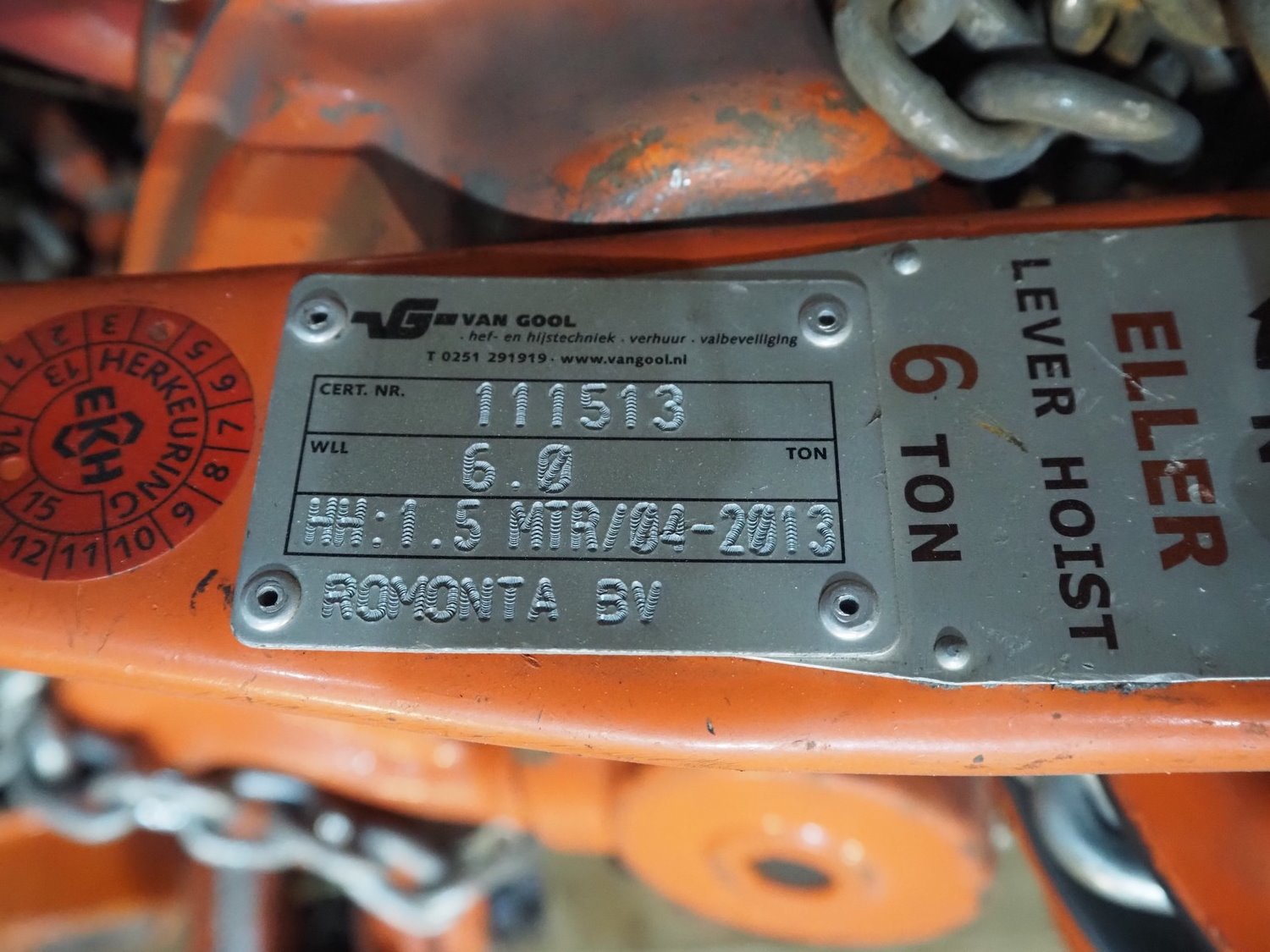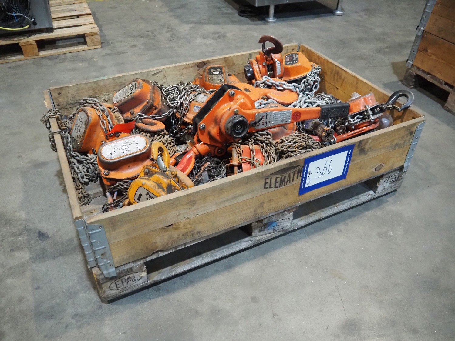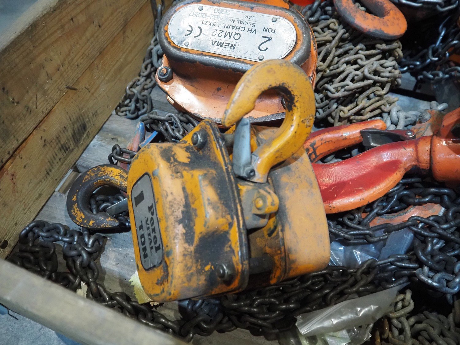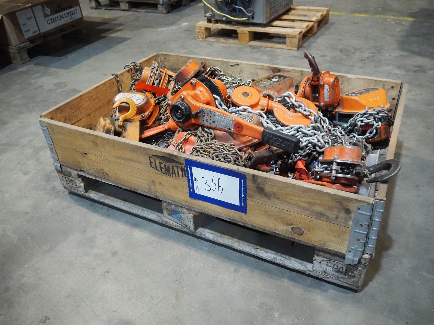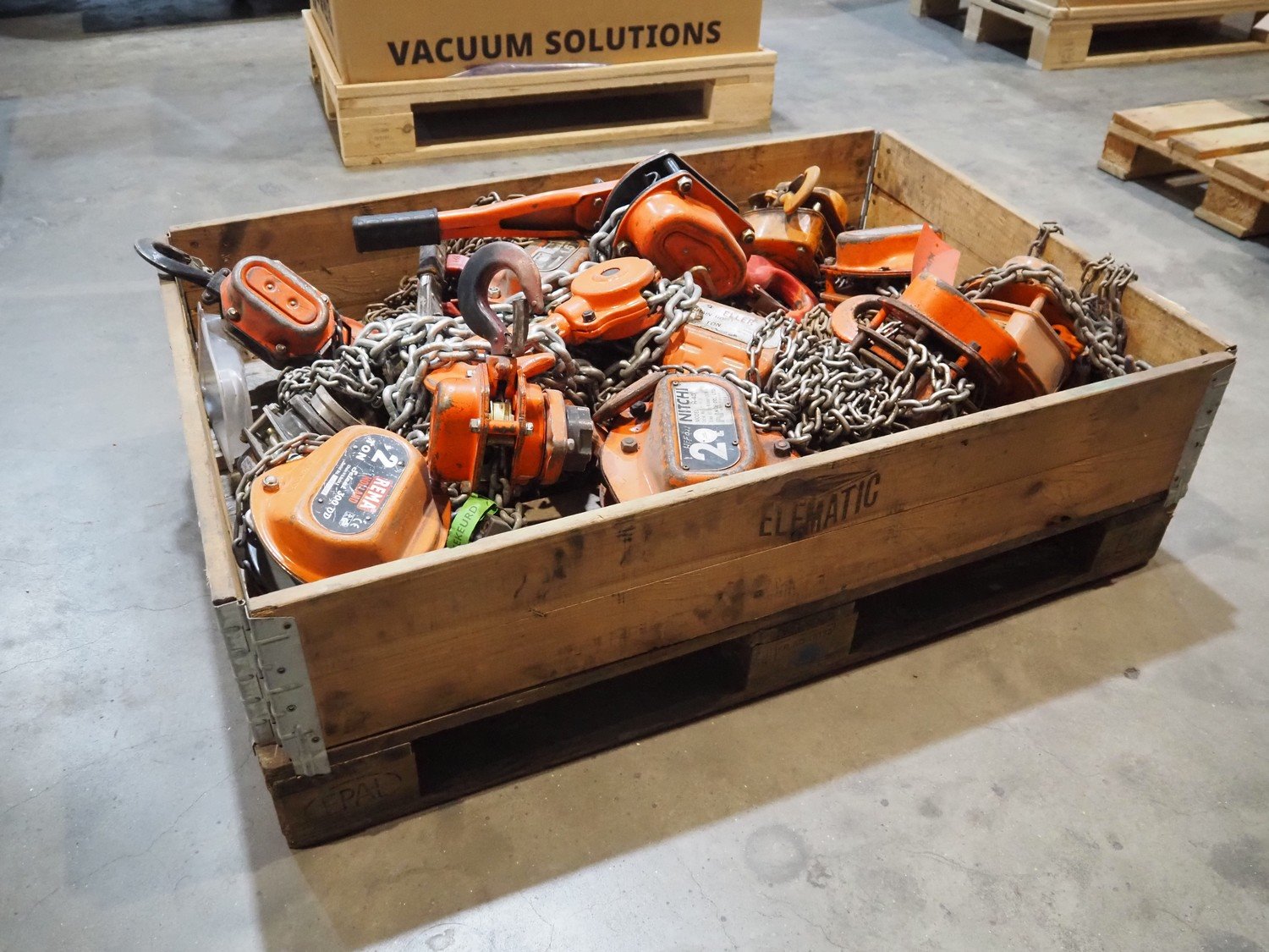 Pallet with 11 Rema hoists, capacity: (1x) 1 ton, (3x) 1.5 ton, (1x) 1.6 ton, (5x) 2 ton and (1x) 6 ton, dimensions: 1200 mm x 800 mm x 400 mm.