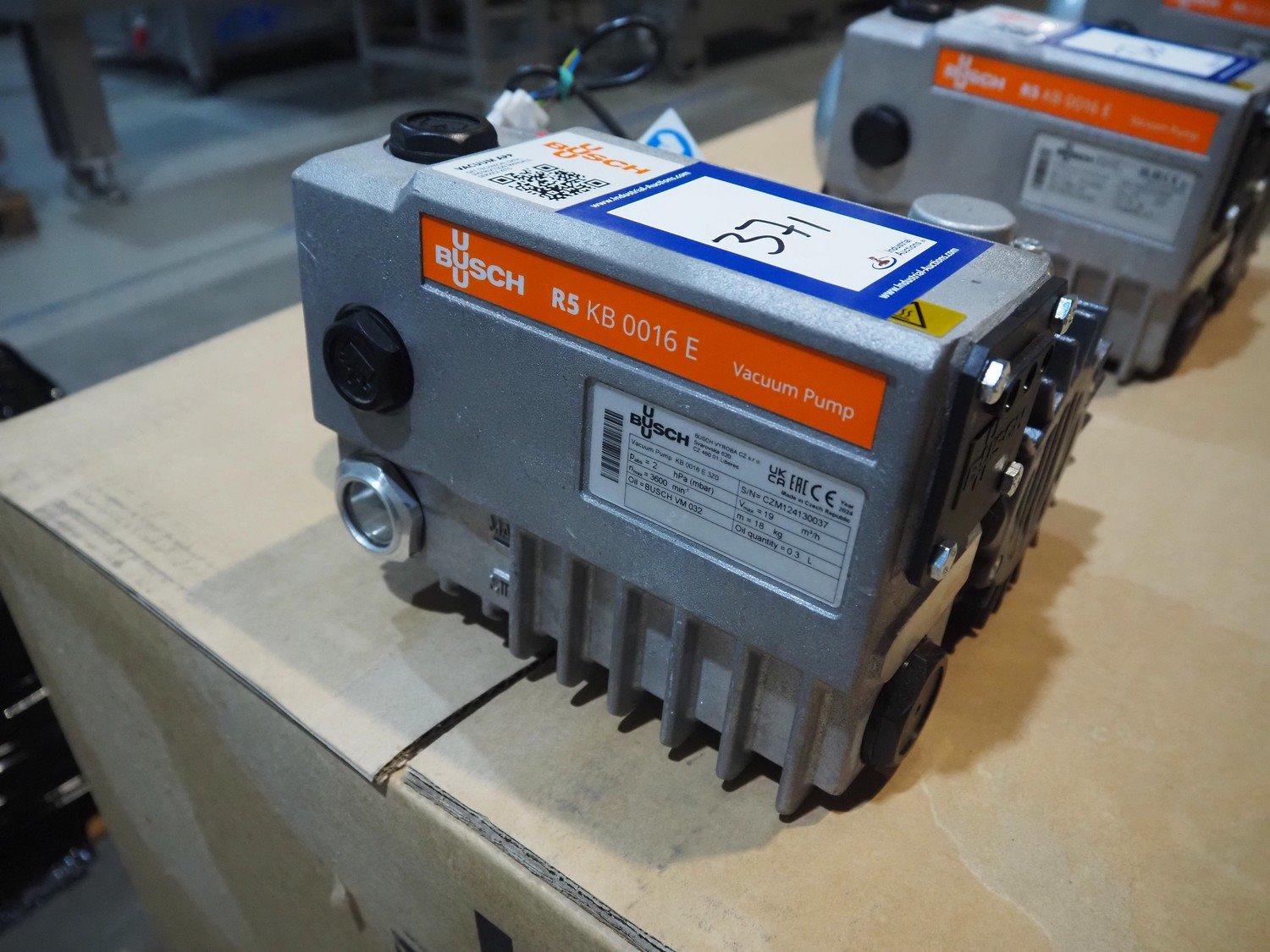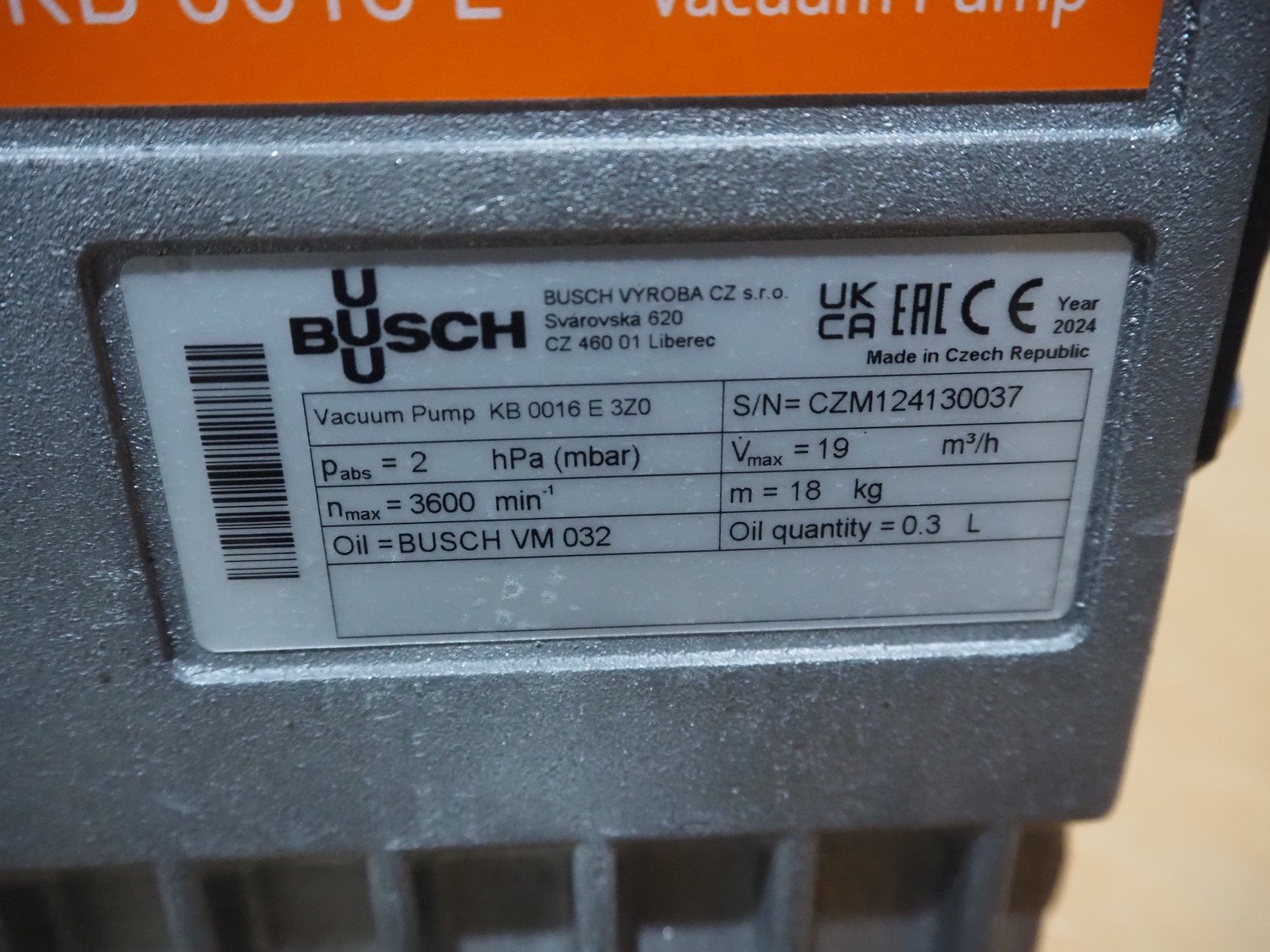 Busch vacuum pump, type: KB 0016 E 3ZO, serial number: CZM124130037, year of construction: 2024, capacity: 19 m³ per hour, dimensions: 290 mm x 220 mm x 200 mm.