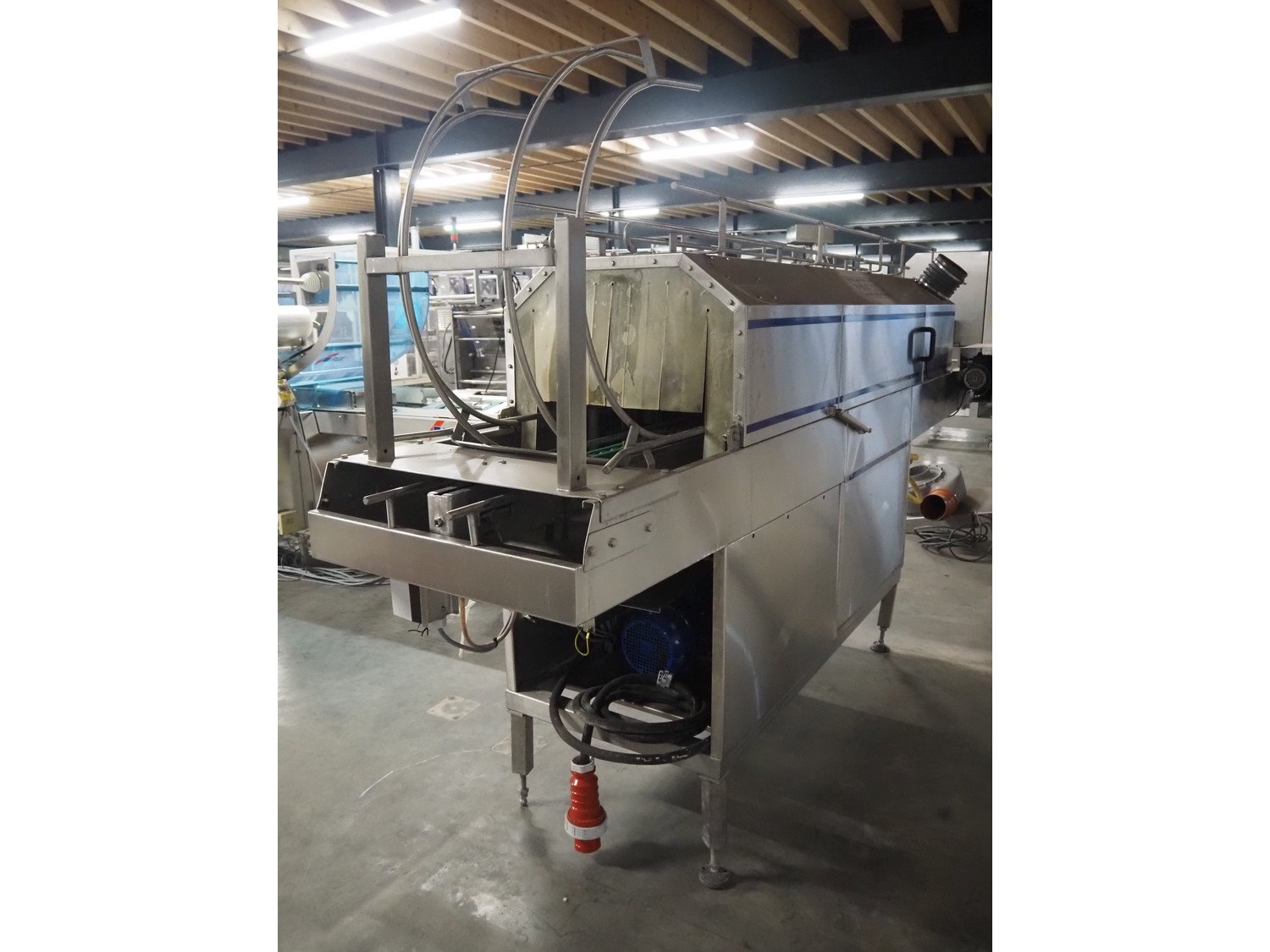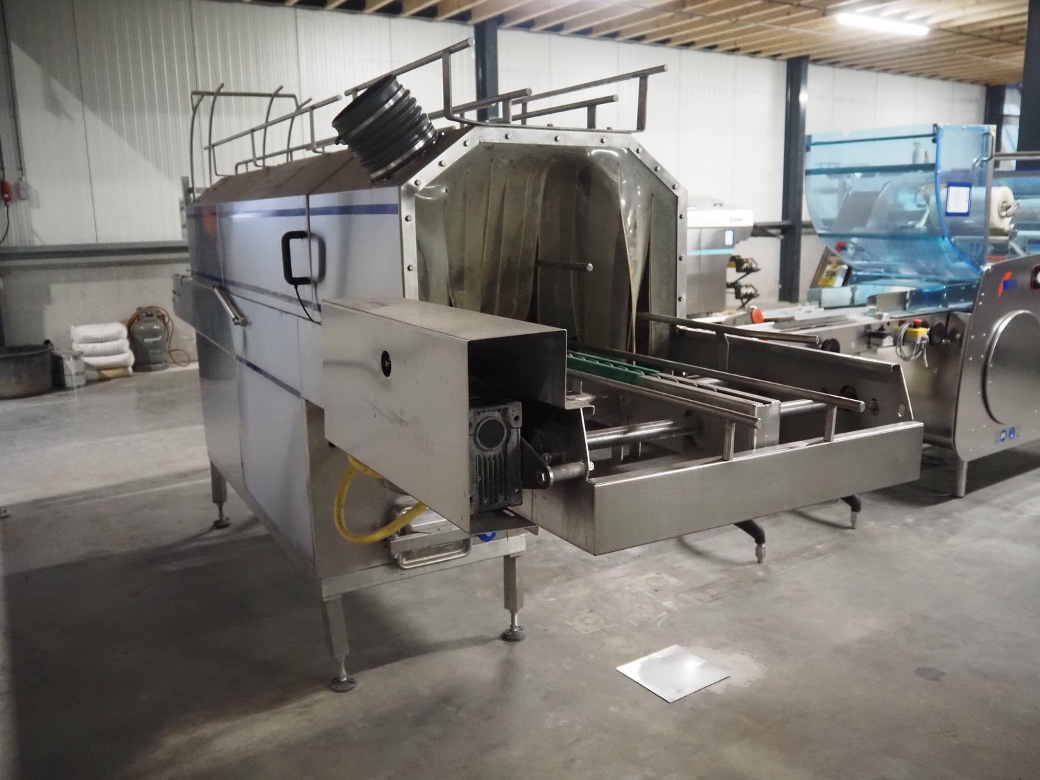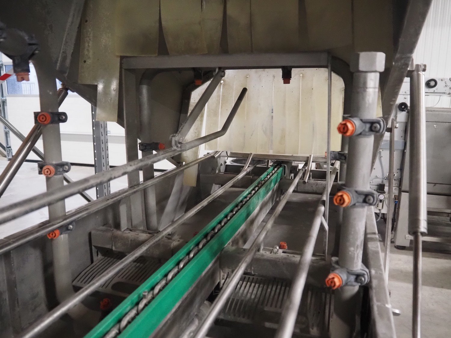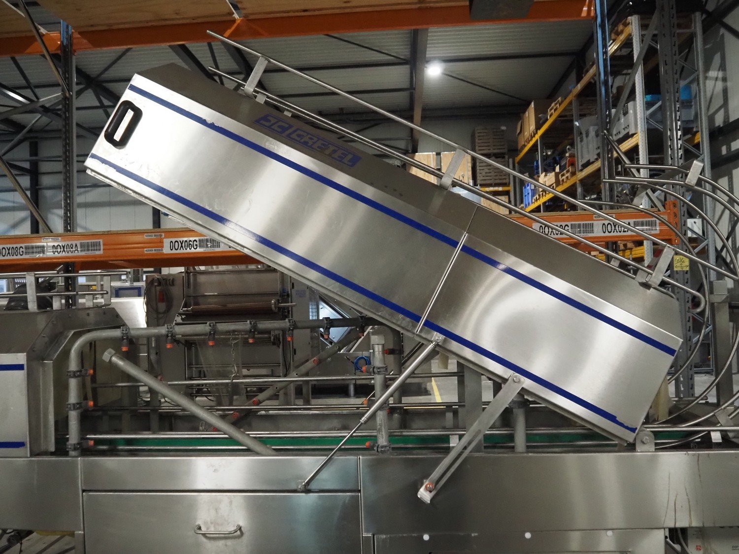 Cretel crate washing machine, s/s chain conveyor with dividers, belt width: 450 mm, distance between dividers: 760 mm, divider height: 15 mm, total dimensions: 3650 mm x 1000 mm x 1720 mm. Including blower.