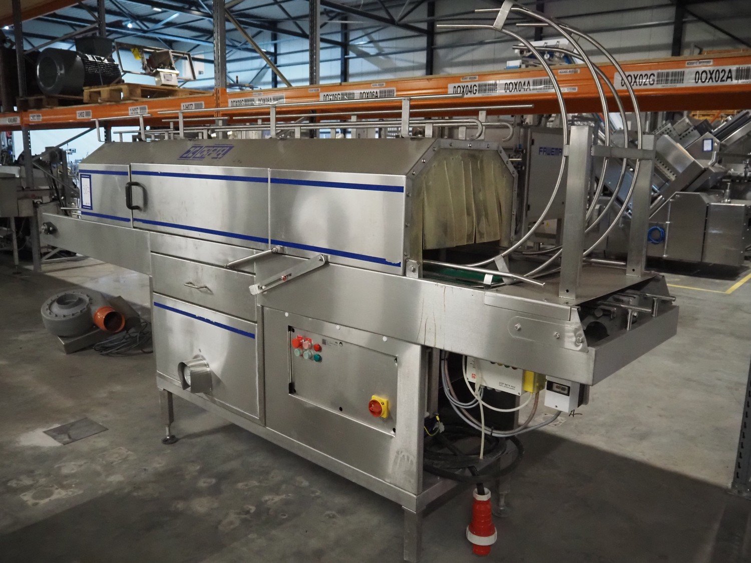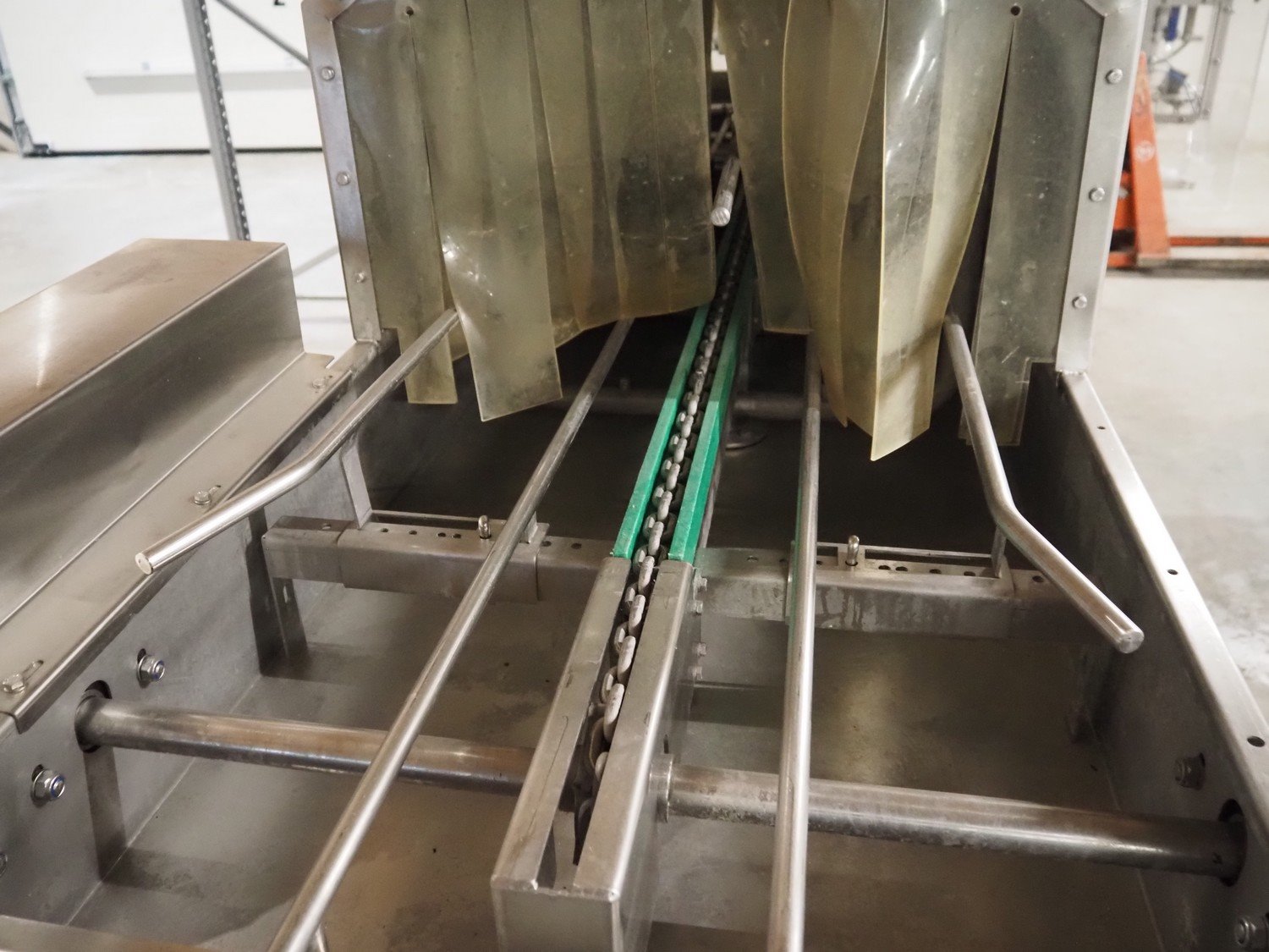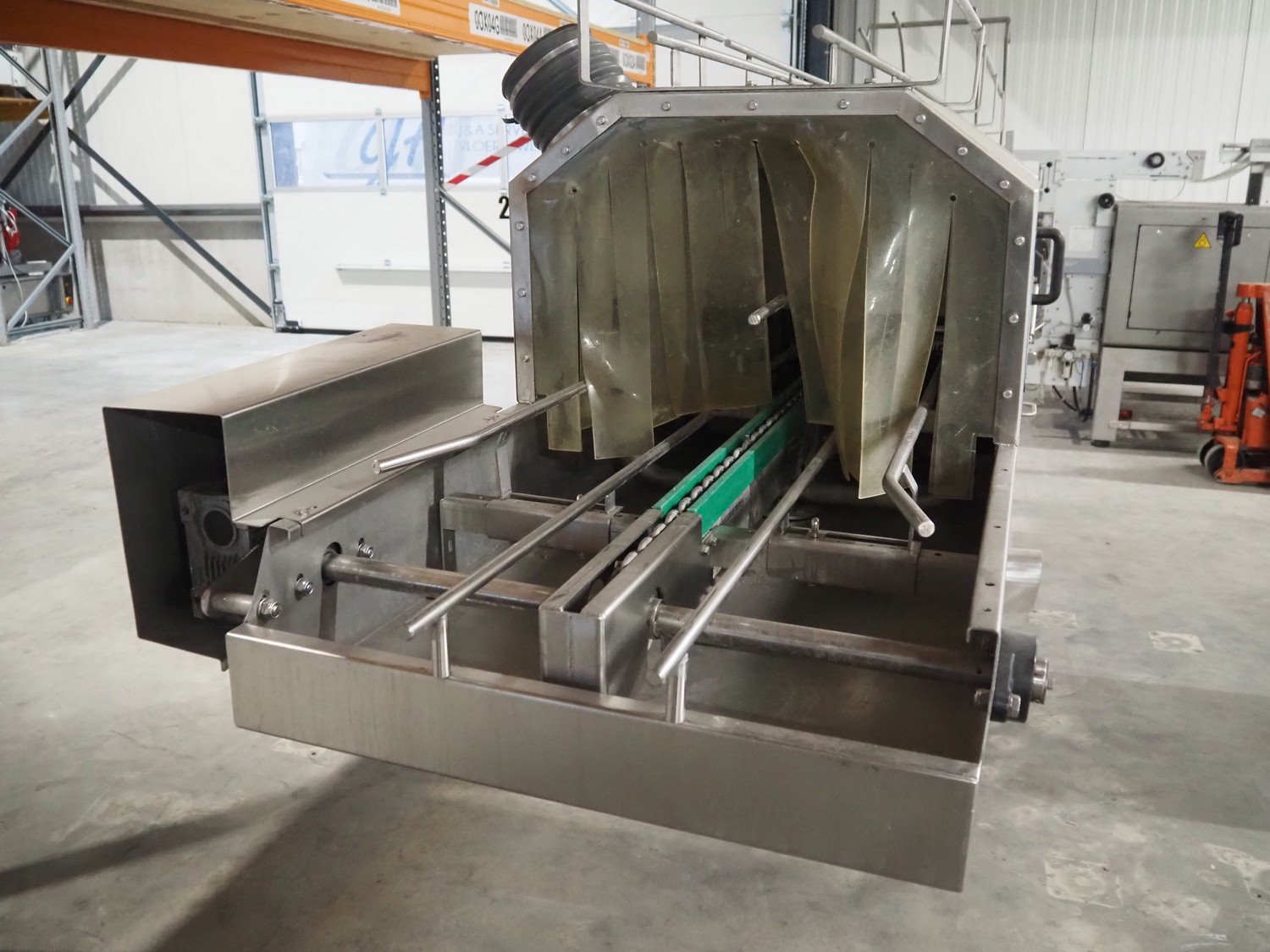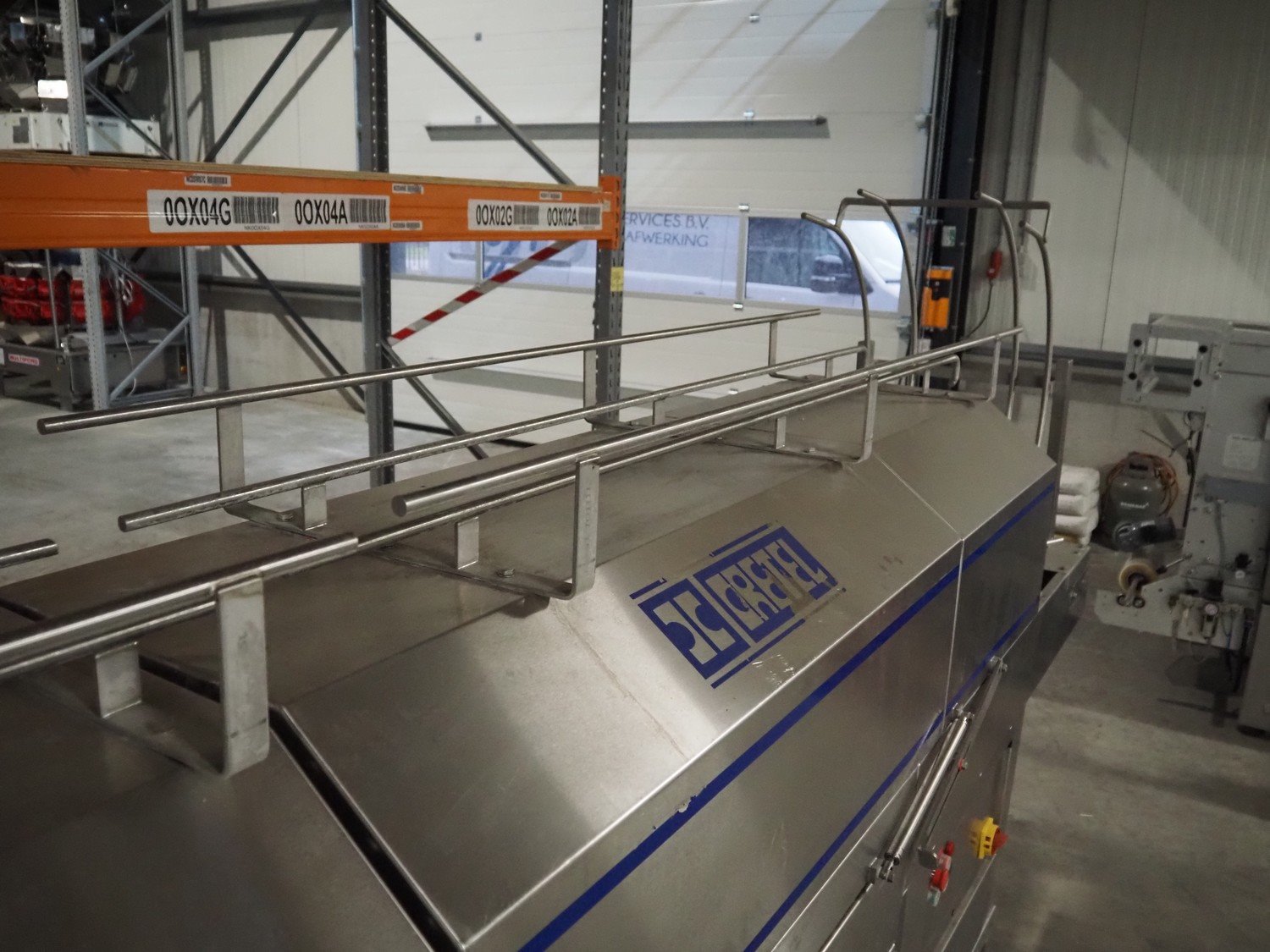 Cretel crate washing machine, s/s chain conveyor with dividers, belt width: 450 mm, distance between dividers: 760 mm, divider height: 15 mm, total dimensions: 3650 mm x 1000 mm x 1720 mm. Including blower.