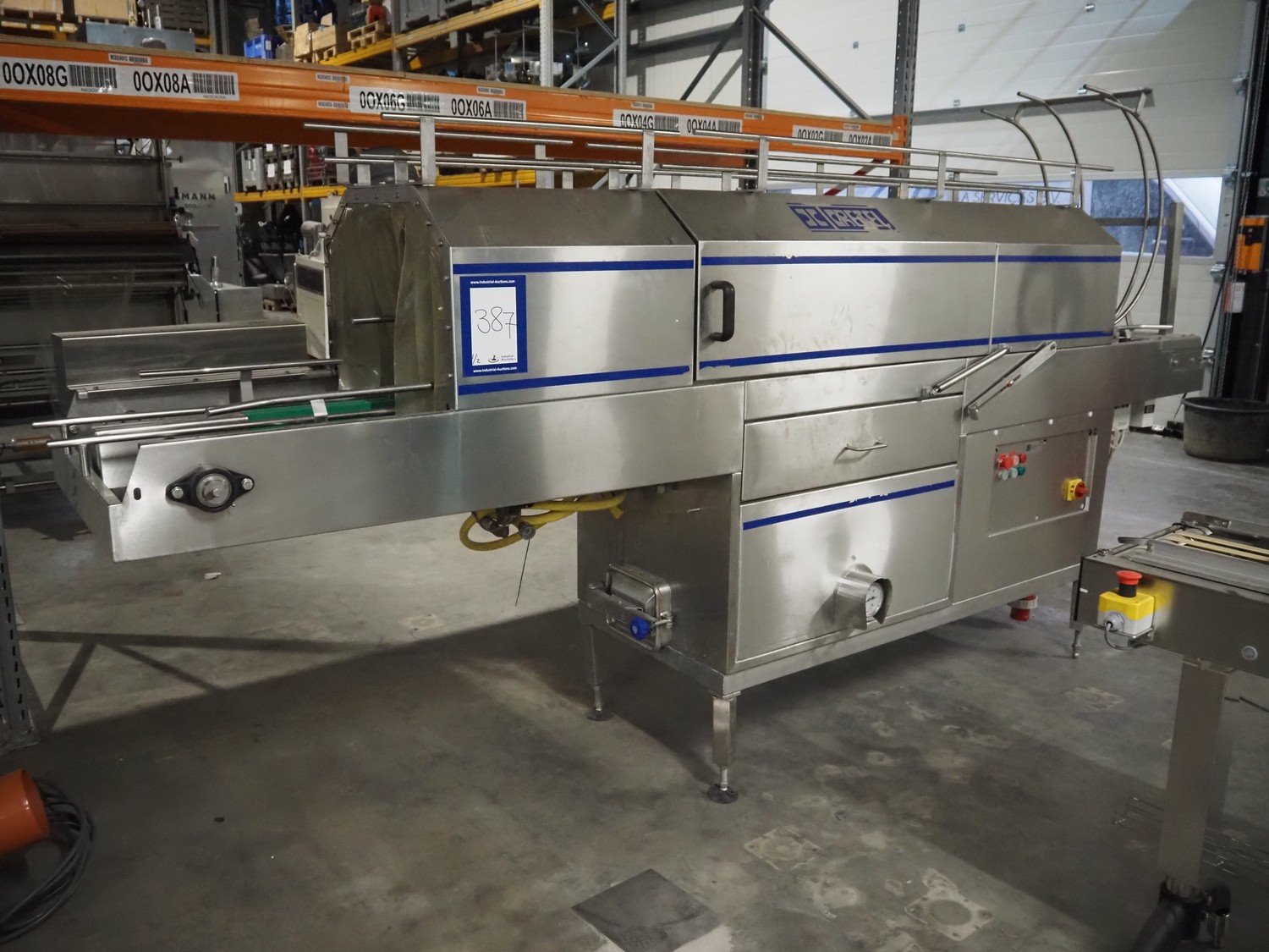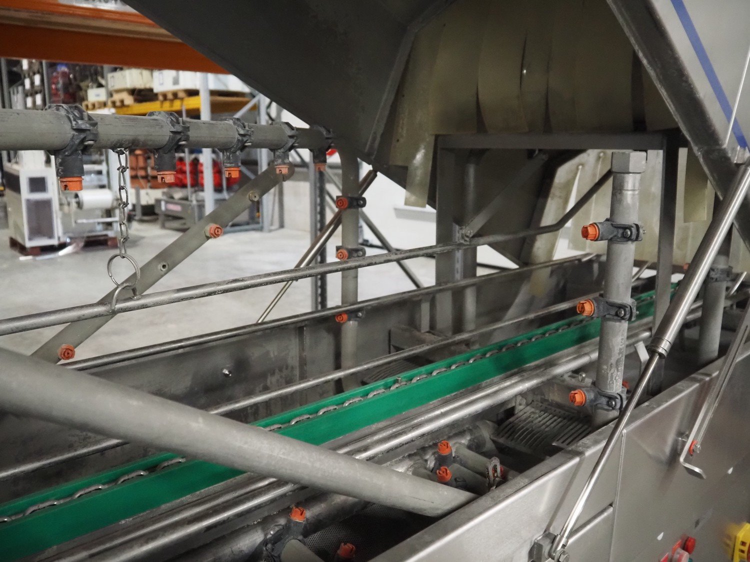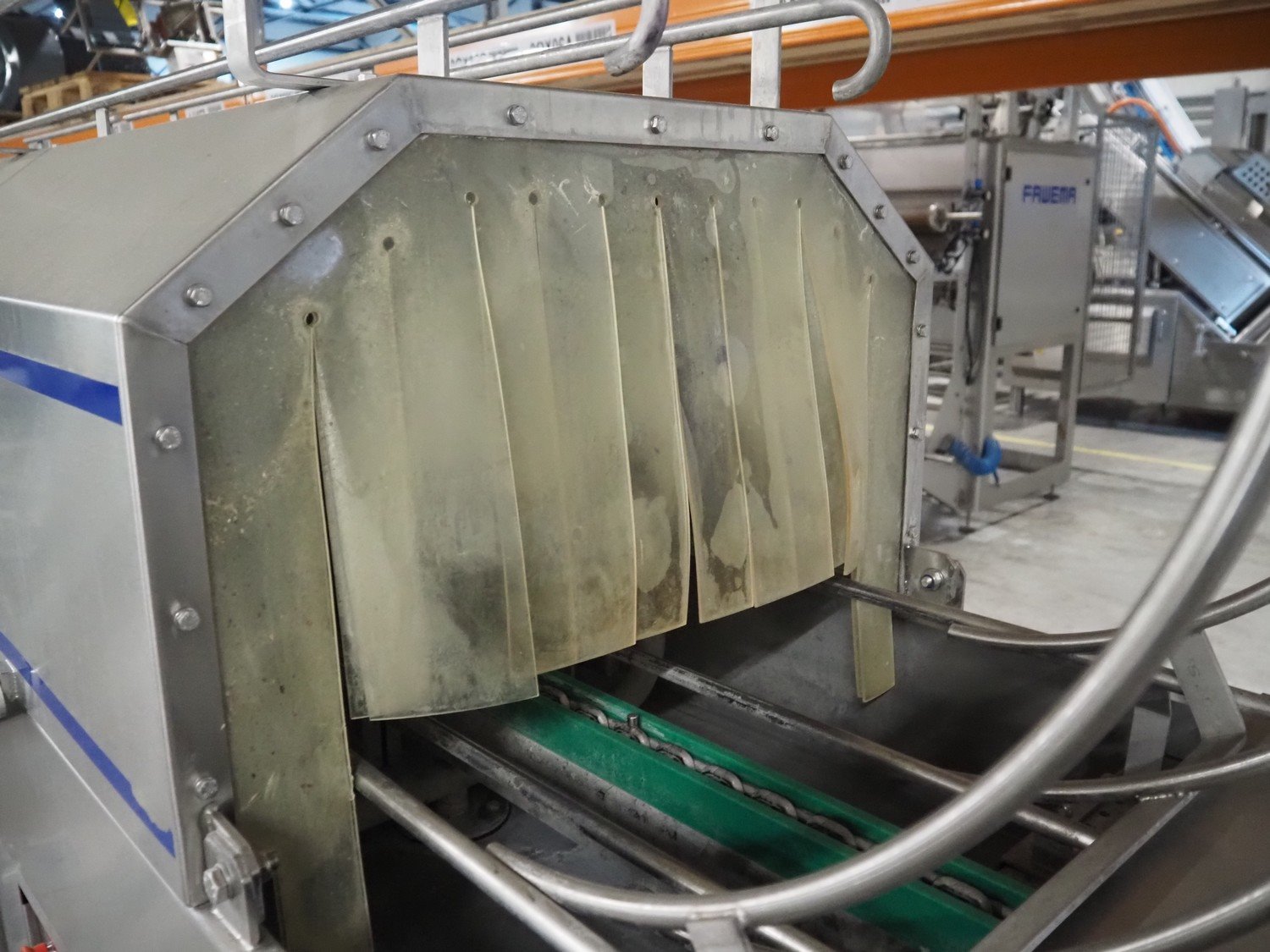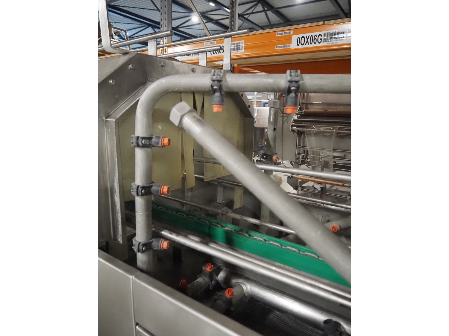 Cretel crate washing machine, s/s chain conveyor with dividers, belt width: 450 mm, distance between dividers: 760 mm, divider height: 15 mm, total dimensions: 3650 mm x 1000 mm x 1720 mm. Including blower.